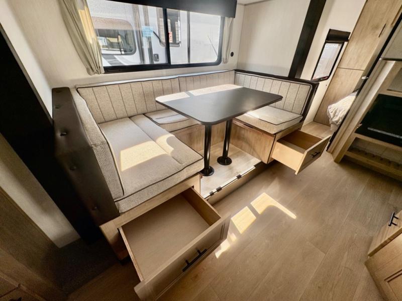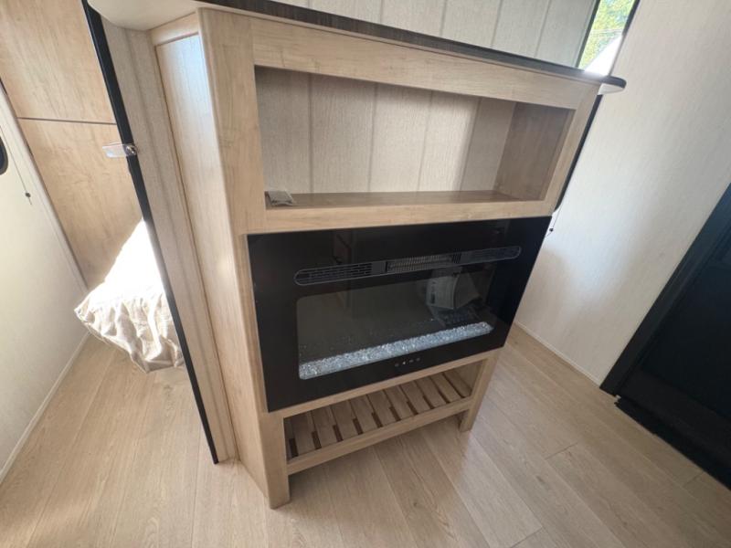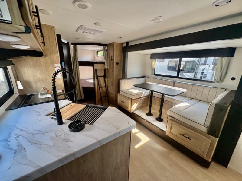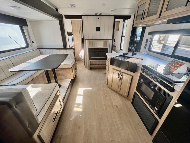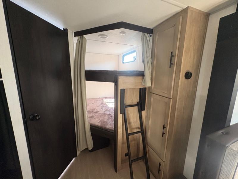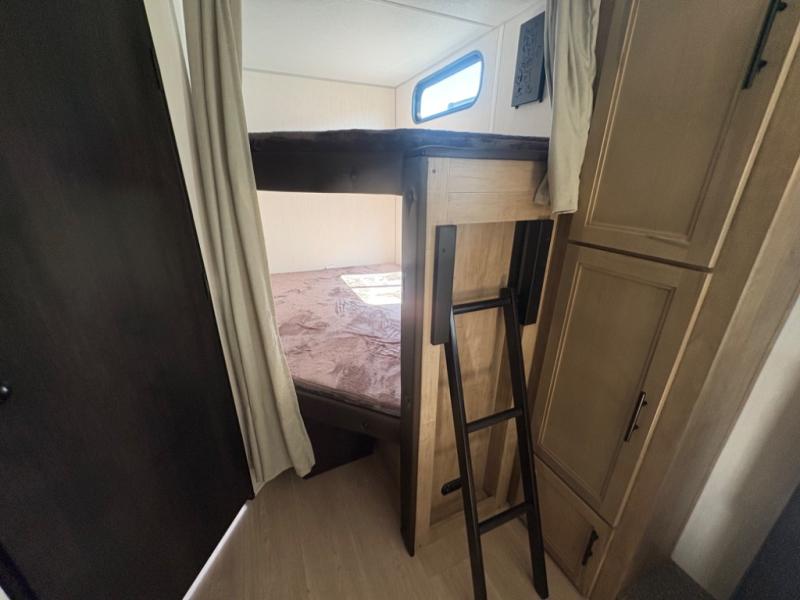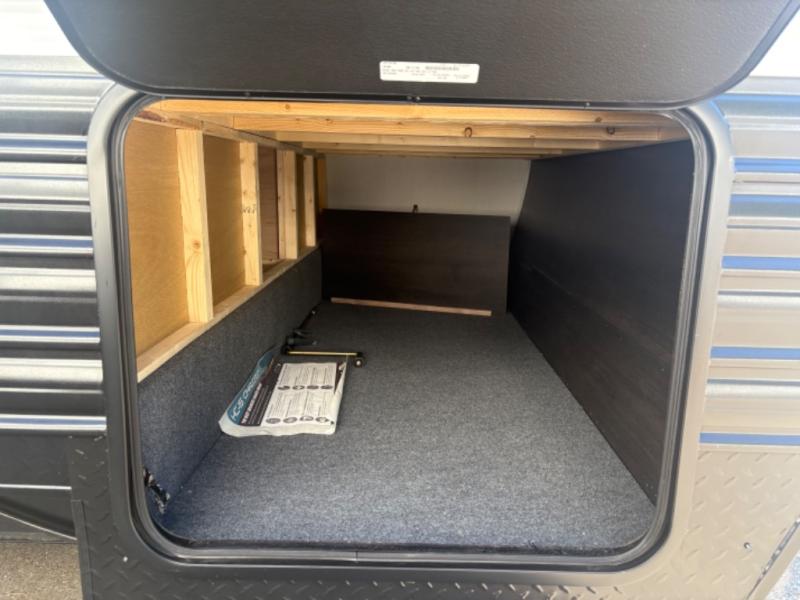 You will love the space provided in this dual entry Cherokee Grey Wolf travel trailer that has double-size bunks! The rear entry door leads right into the full bath allowing easy access from outside when you need to use the bathroom while you're enjoying the great outdoors. The large U-shaped dinette slide will not only seat everyone comfortably for a meal or a game, but since it also slides out, it opens up the interior even more to give you plenty of space for foot traffic. For all of your outdoor gear, you will find the outside storage compartments handy for stowing away your things when not in use. While the kids enjoy their bunk beds, you will enjoy a good night's rest in your RV king bed with wardrobes on either side up in the front private bedroom!