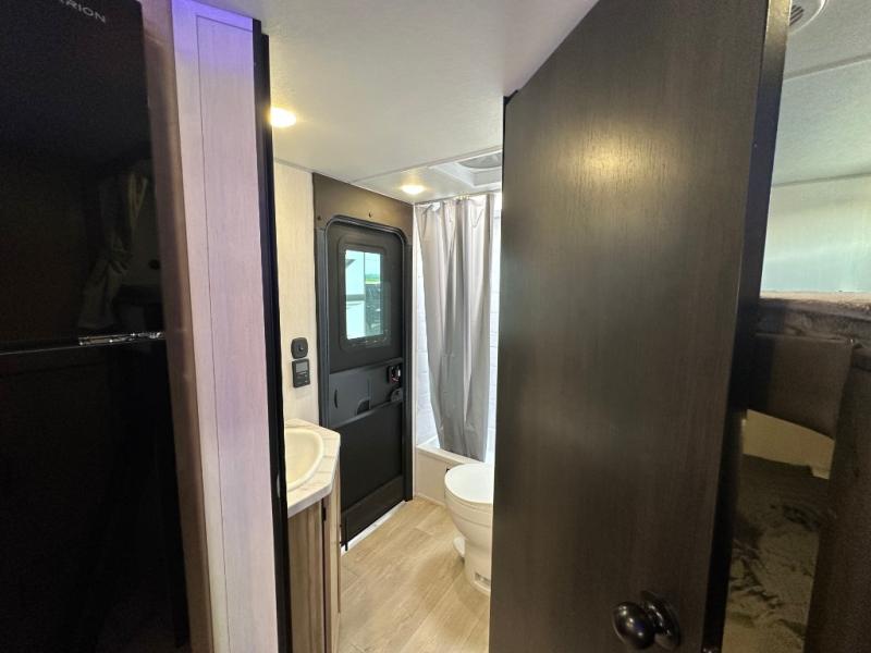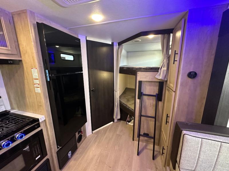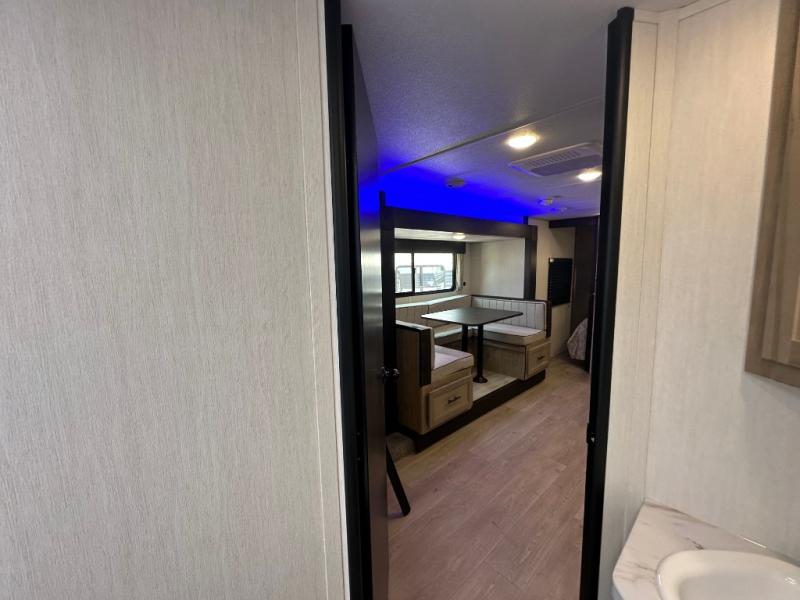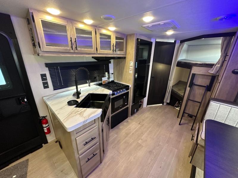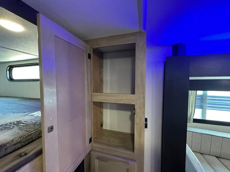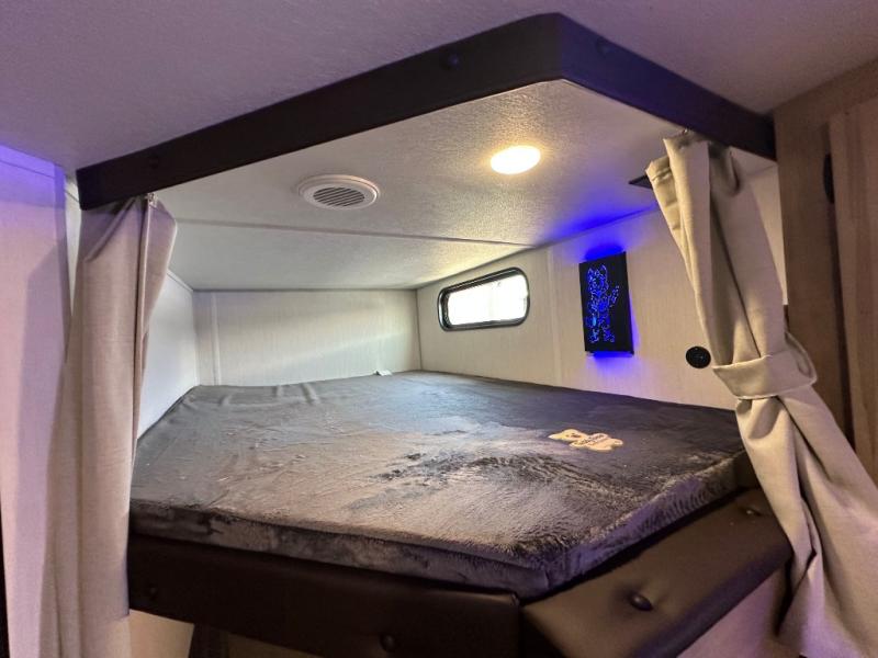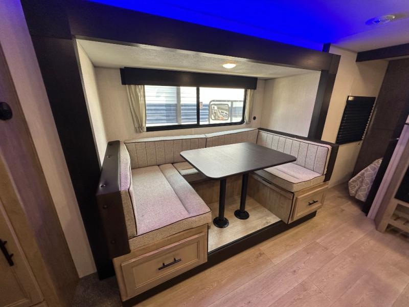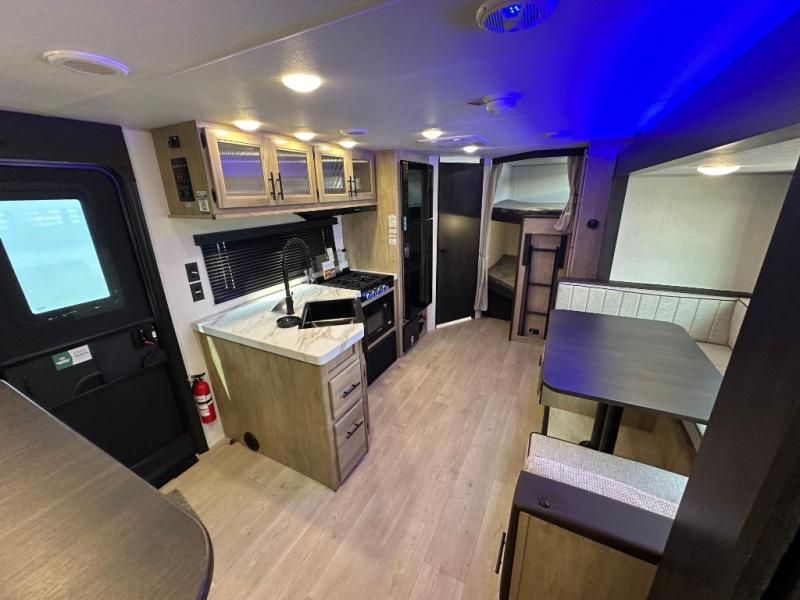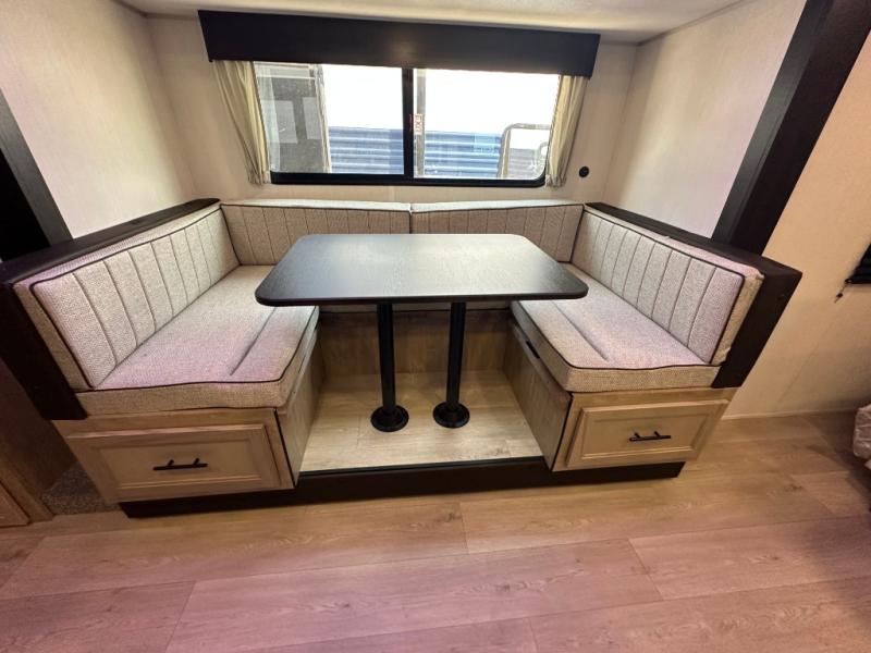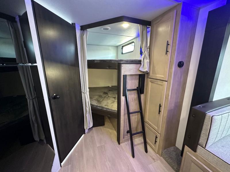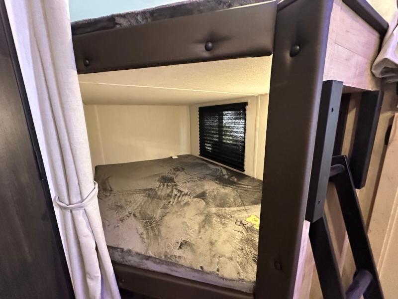 You will love the space provided in this dual entry Cherokee Grey Wolf travel trailer that has double-size bunks! The rear entry door leads right into the full bath allowing easy access from outside when you need to use the bathroom while you're enjoying the great outdoors. The large U-shaped dinette slide will not only seat everyone comfortably for a meal or a game, but since it also slides out, it opens up the interior even more to give you plenty of space for foot traffic. For all of your outdoor gear, you will find the outside storage compartments handy for stowing away your things when not in use. While the kids enjoy their bunk beds, you will enjoy a good night's rest in your RV king bed with wardrobes on either side up in the front private bedroom!
