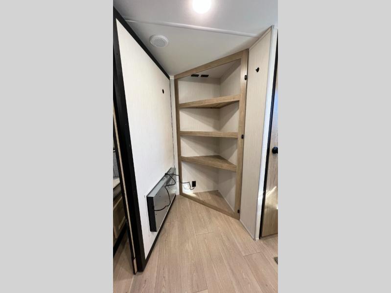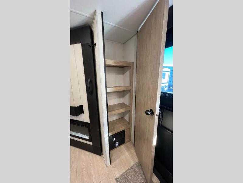 Enjoy time at the campground in this spacious travel trailer with a front private bedroom and double-size bunks for guests! The full interior kitchen and outside kitchen will let you make meals each day, and everyone can dine around the U-shaped dinette or under the 15' awning outside! This unit also includes ample storage space, including hidden shelves behind the fireplace and outside storage!