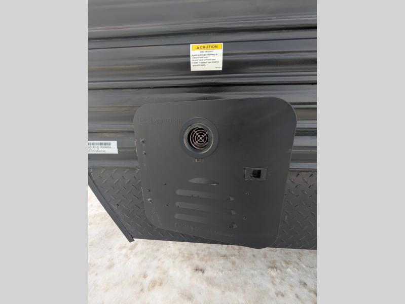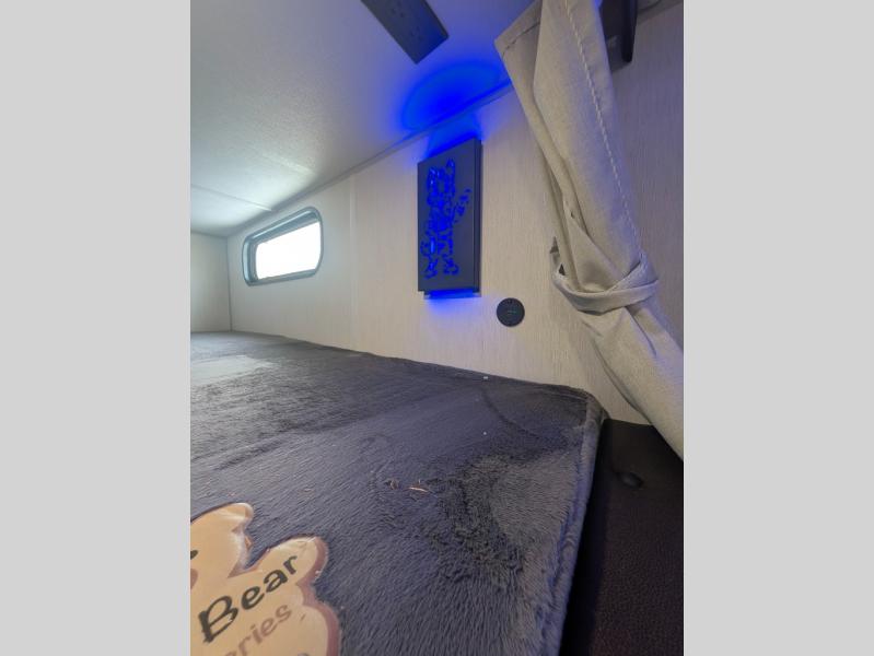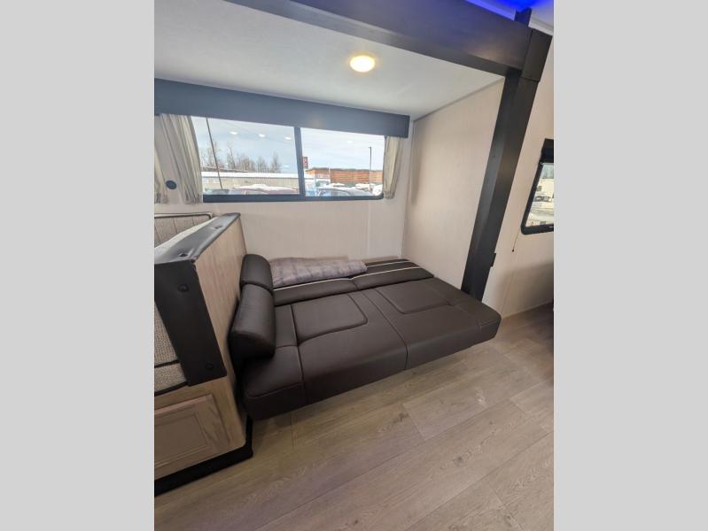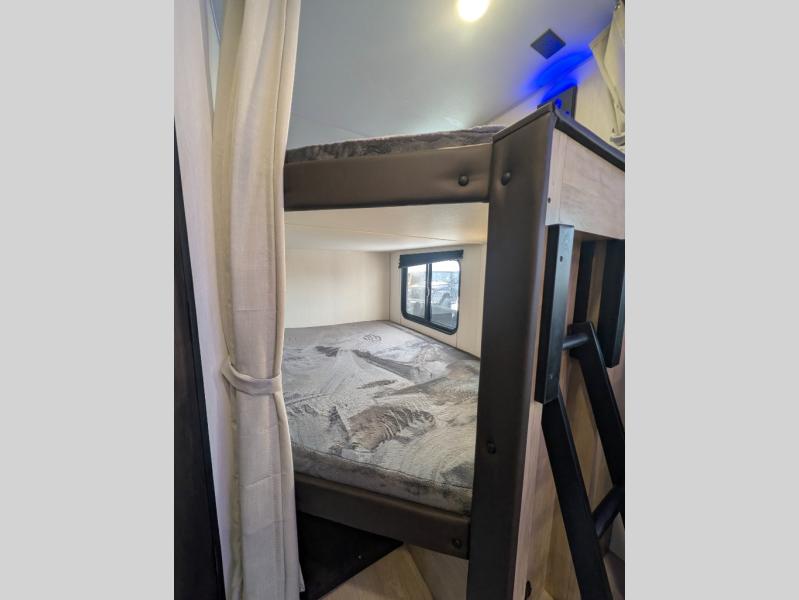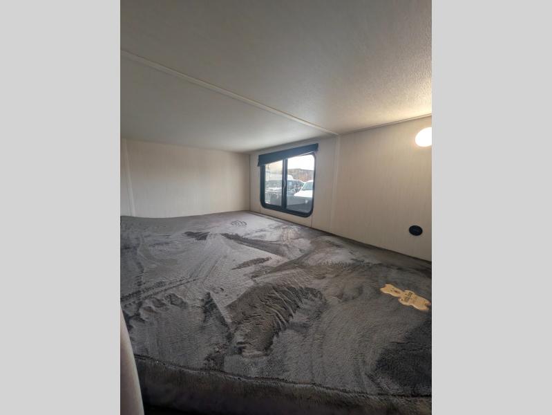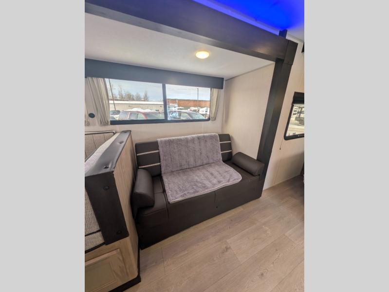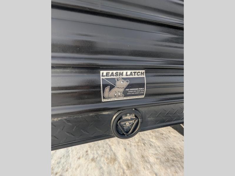Come on inside this Cherokee Grey Wolf travel trailer and experience the convenience of a smooth flow of traffic in and out with two entry doors. The rear door leads into a full bath which is great for accessibility. Once inside, you will notice the large U-shaped dinette and the sofa which sit on the slide and create a spacious footprint for moving about, as well as great places to play games and socialize with your friends and family. A walk-in pantry provides plenty of storage allowing you to stock up on your favorite snacks and dry goods for your family adventure. At night, there is sleeping space for everyone between the double-size bunks and the RV king bed, plus the furniture.