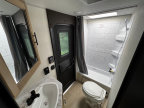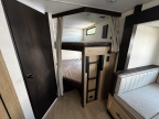 Come on inside this Cherokee Grey Wolf travel trailer and experience the convenience of a smooth flow of traffic in and out with two entry doors. The rear door leads into a full bath which is great for accessibility. Once inside, you will notice the large U-shaped dinette and the sofa which sit on the slide and create a spacious footprint for moving about, as well as great places to play games and socialize with your friends and family. A walk-in pantry provides plenty of storage allowing you to stock up on your favorite snacks and dry goods for your family adventure. At night, there is sleeping space for everyone between the double-size bunks and the RV king bed, plus the furniture.