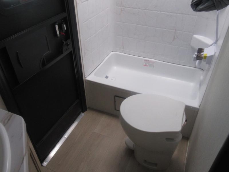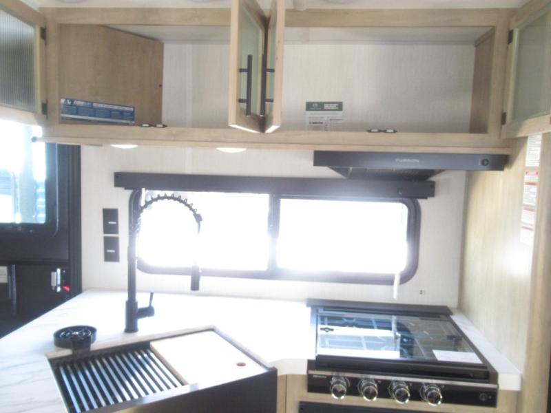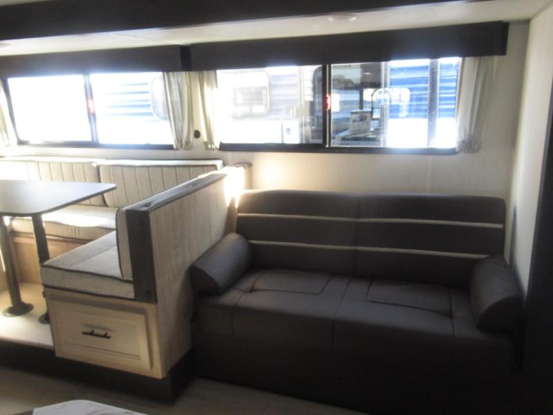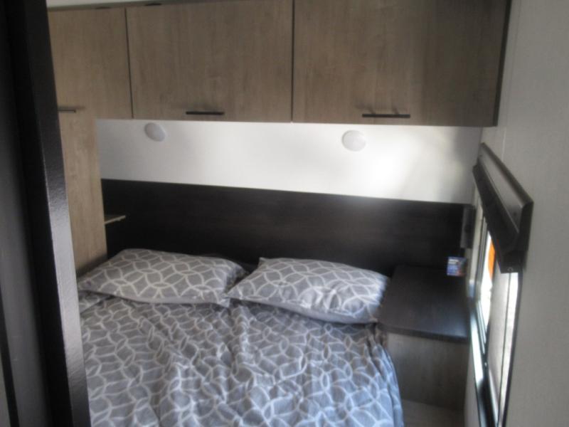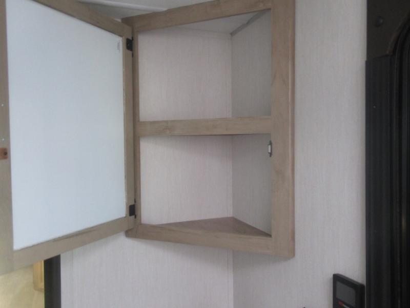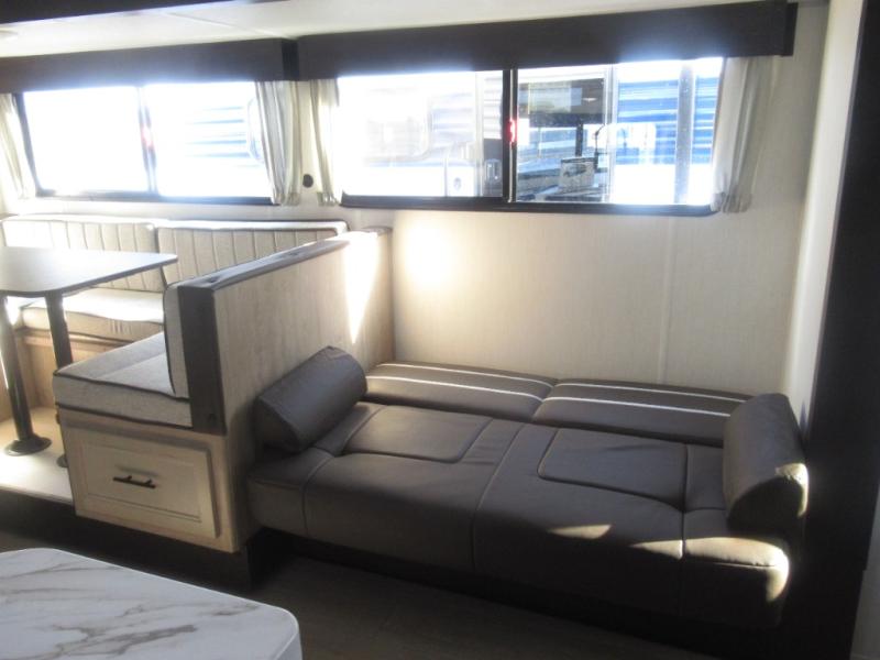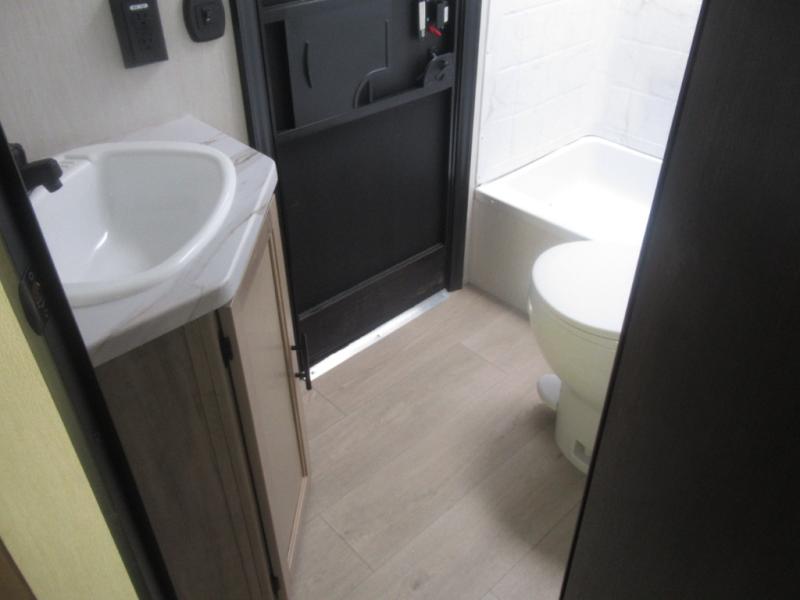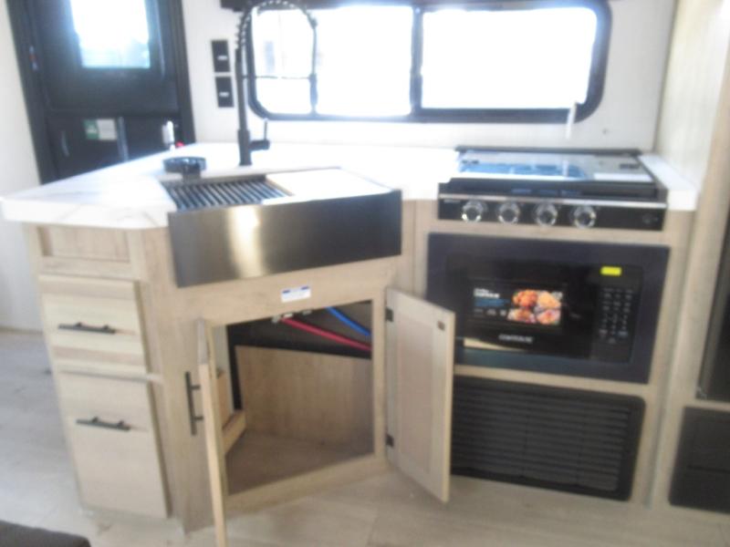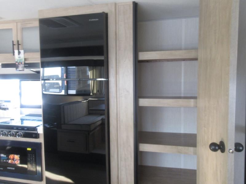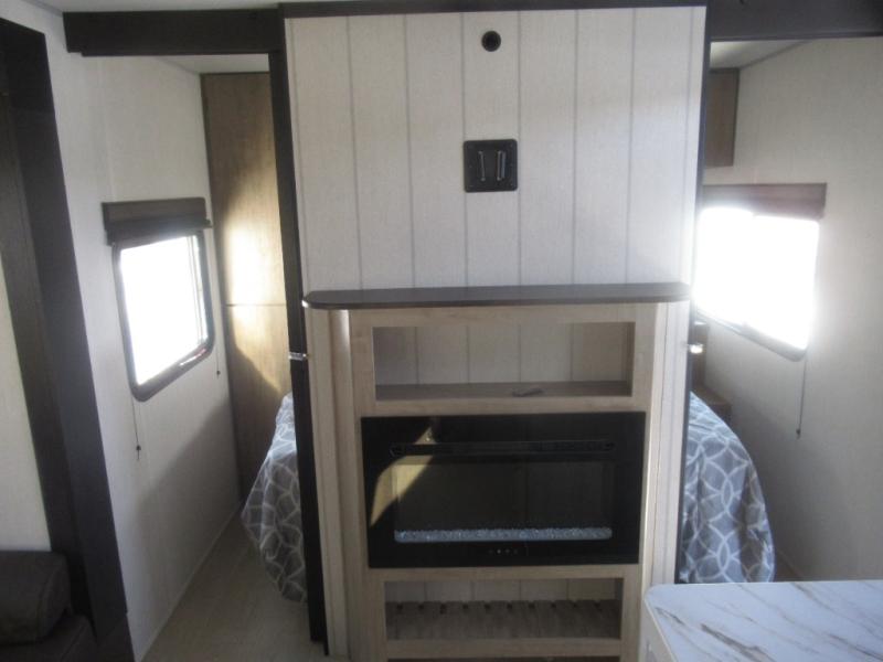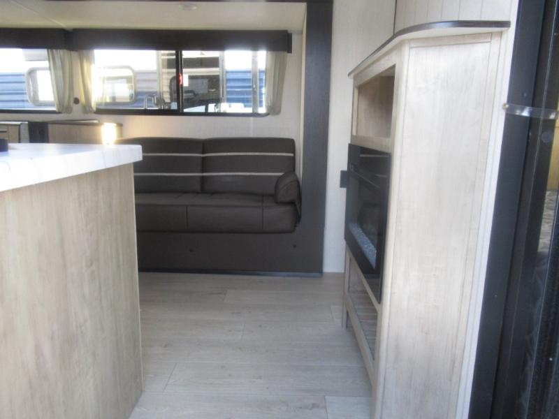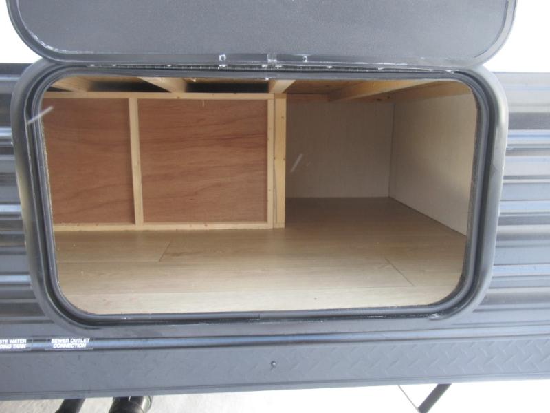 Come on inside this Cherokee Grey Wolf travel trailer and experience the convenience of a smooth flow of traffic in and out with two entry doors. The rear door leads into a full bath which is great for accessibility. Once inside, you will notice the large U-shaped dinette and the sofa which sit on the slide and create a spacious footprint for moving about, as well as great places to play games and socialize with your friends and family. A walk-in pantry provides plenty of storage allowing you to stock up on your favorite snacks and dry goods for your family adventure. At night, there is sleeping space for everyone between the double-size bunks and the RV king bed, plus the furniture.