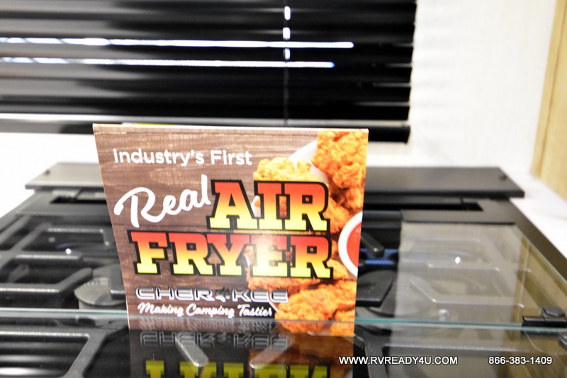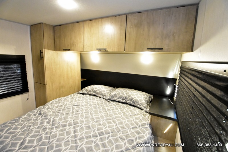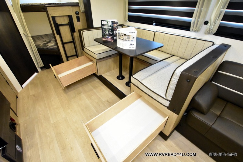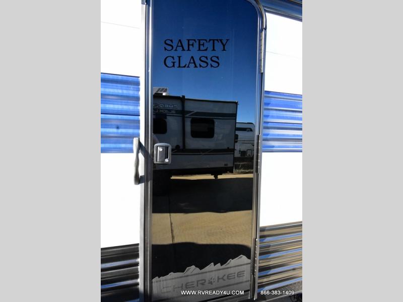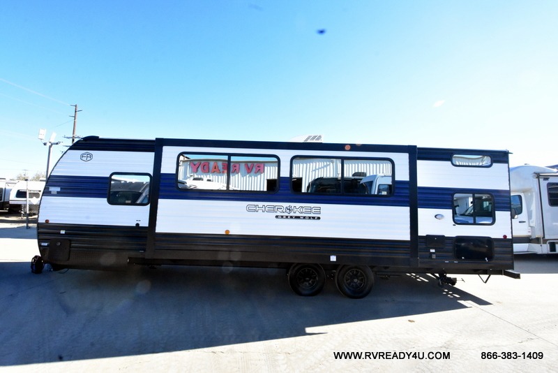 Come on inside this Cherokee Grey Wolf travel trailer and experience the convenience of a smooth flow of traffic in and out with two entry doors. The rear door leads into a full bath which is great for accessibility. Once inside, you will notice the large U-shaped dinette and the sofa which sit on the slide and create a spacious footprint for moving about, as well as great places to play games and socialize with your friends and family. A walk-in pantry provides plenty of storage allowing you to stock up on your favorite snacks and dry goods for your family adventure. At night, there is sleeping space for everyone between the double-size bunks and the RV king bed, plus the furniture.