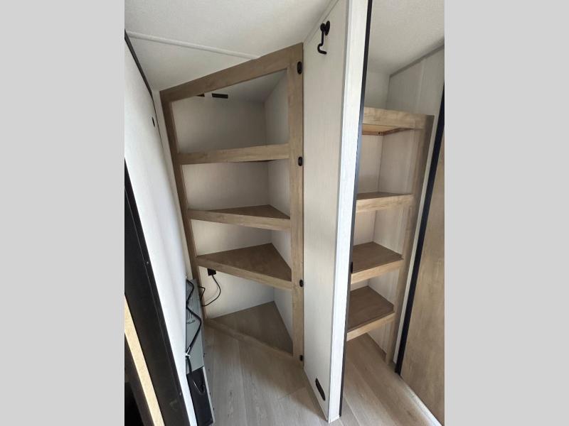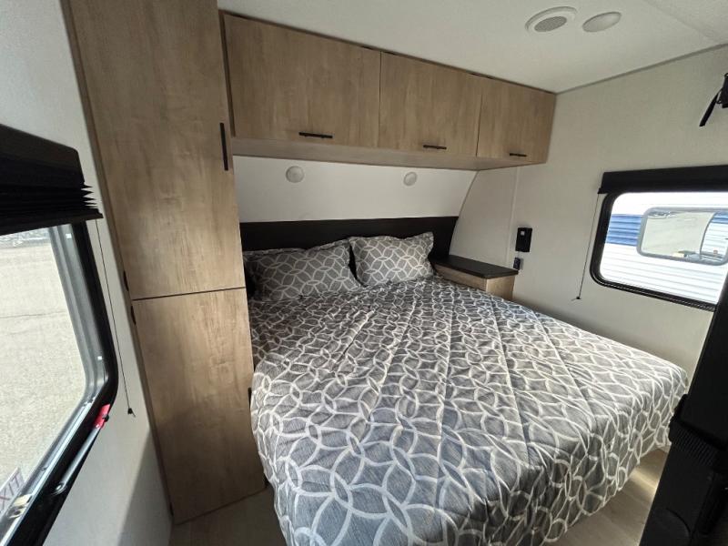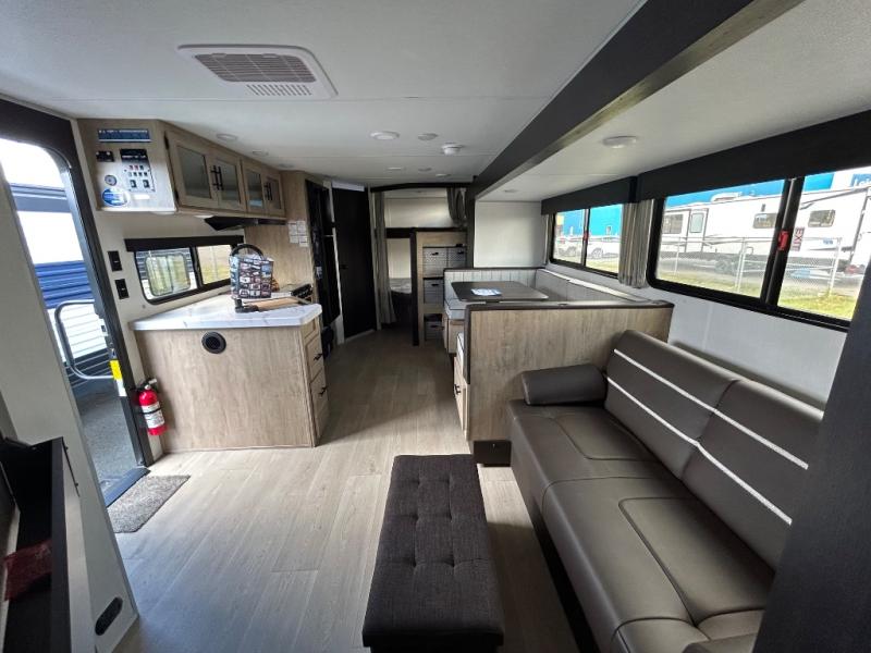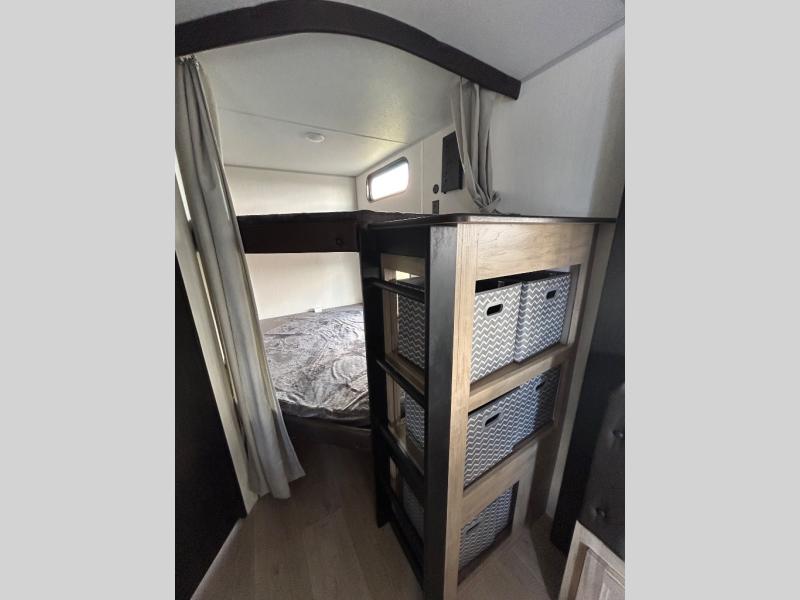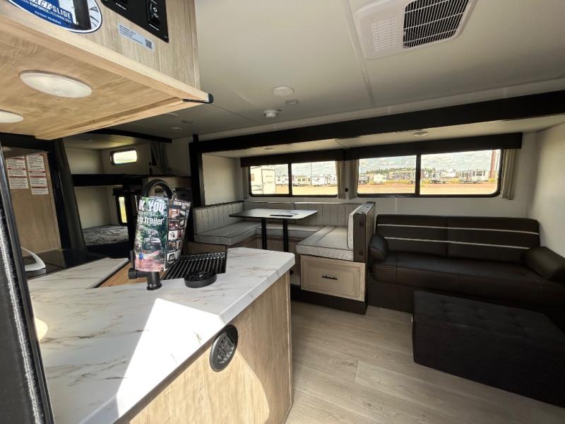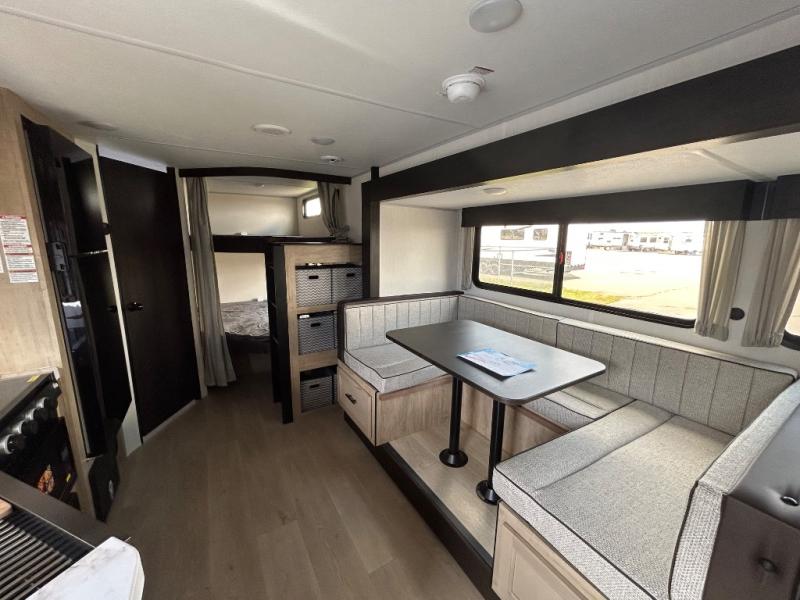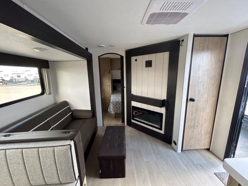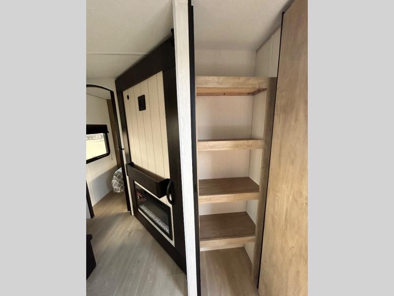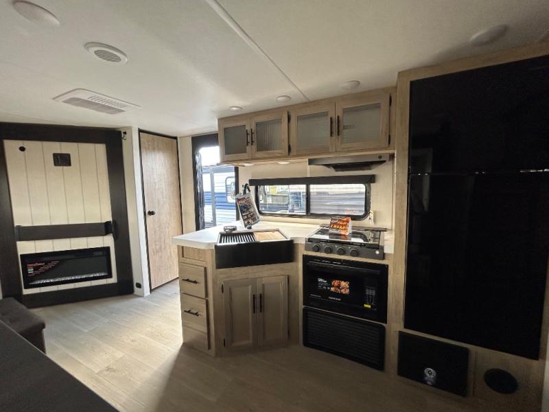 If you've been searching for a travel trailer with a larger sleeping capacity to camp with friends, this is the one! There are double-size bunks in the rear corner, and the full bath with its own exterior entry door is in the other rear corner for easy nighttime use. Up front, an RV king bed in the private bedroom is sure to bring a great night's rest, and you'll find a bedside wardrobe to keep your clothes picked up off of the floor. In the morning, everyone can meet in the main living room that includes a large slide out, U-shaped dinette, sofa, and a fireplace with a hidden pantry behind it for smart storage solutions. An outside kitchen will allow you to get some fresh air as you make dinner, but there's also a full interior kitchen if the weather isn't cooperating. Additional outdoor features include a rear storage rack, an outside TV mount, and a 15' awning for some shade!
