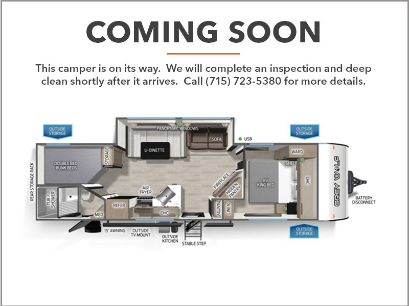 If you've been searching for a travel trailer with a larger sleeping capacity to camp with friends, this is the one! There are double-size bunks in the rear corner, and the full bath with its own exterior entry door is in the other rear corner for easy nighttime use. Up front, an RV king bed in the private bedroom is sure to bring a great night's rest, and you'll find a bedside wardrobe to keep your clothes picked up off of the floor. In the morning, everyone can meet in the main living room that includes a large slide out, U-shaped dinette, sofa, and a fireplace with a hidden pantry behind it for smart storage solutions. An outside kitchen will allow you to get some fresh air as you make dinner, but there's also a full interior kitchen if the weather isn't cooperating. Additional outdoor features include a rear storage rack, an outside TV mount, and a 15' awning for some shade!