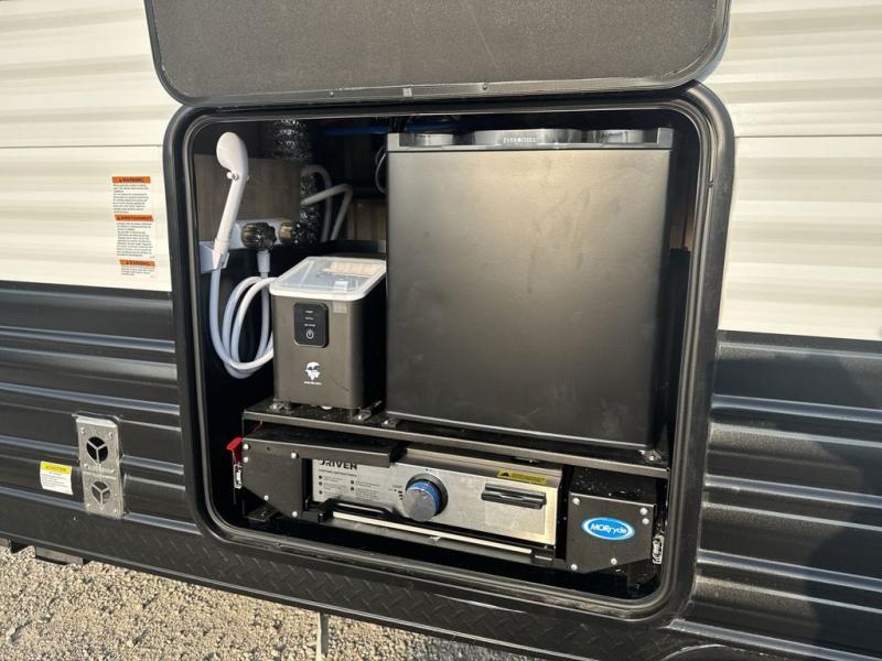 You'll love every minute spent in this single slide out travel trailer, whether you're cooking dinner on the outside kitchen or in the rear kitchen, relaxing on the sofa across from the fireplace, or sleeping on the RV king bed in the front master bedroom! There is a hidden pantry behind the fireplace for convenient storage, and the booth dinette within the slide provides a place to dine together. The walk-thru bath is spacious, and includes a tub/shower, toilet, and sink with counter space.