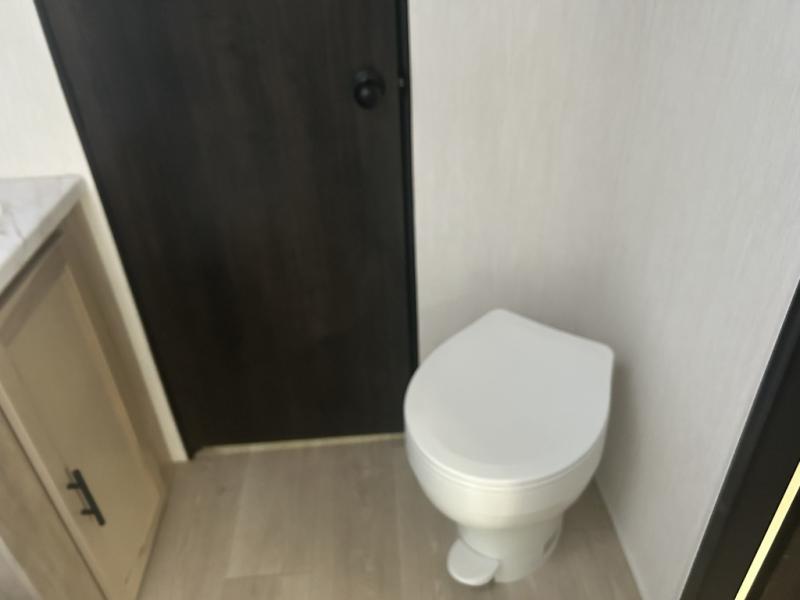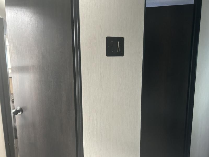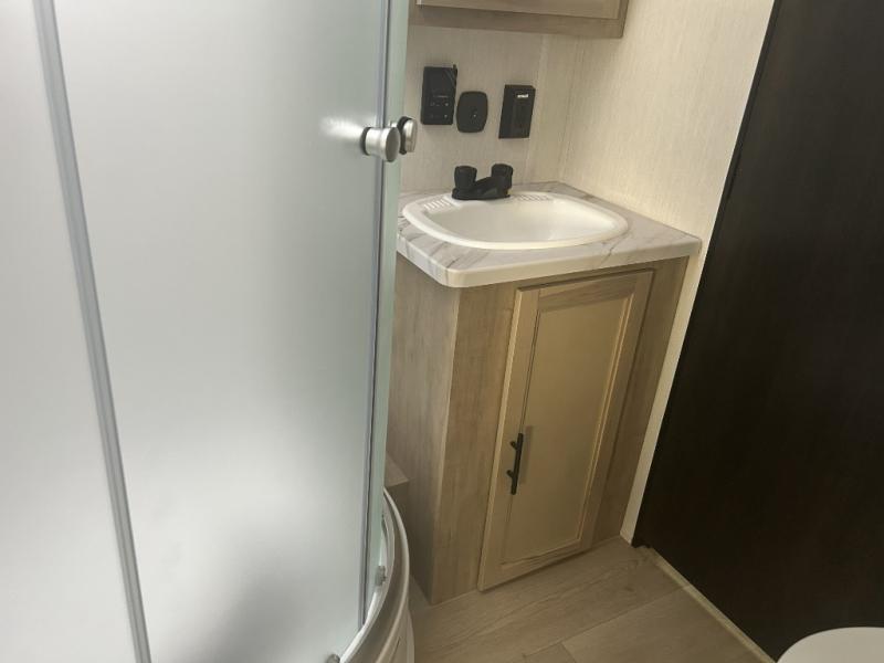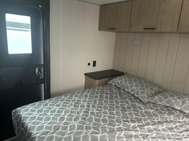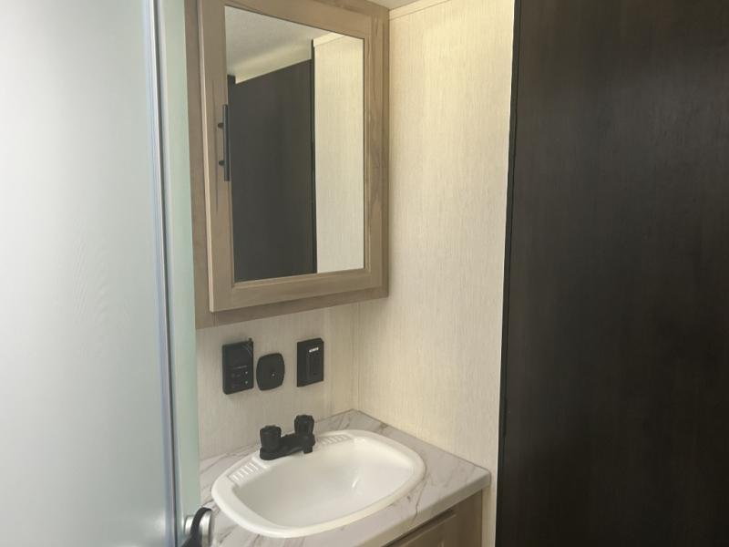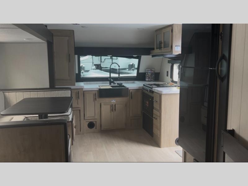 Since this travel trailer features dual entry doors, you can enter in through the rear master bedroom or the front kitchen; how convenient! The kitchen includes ample counter space and all the appliances to prep meals, along with a pantry up front and a hidden pantry behind the fireplace. Your crew can get comfortable on the sofa or play a game around the U-shaped dinette, although you may just find yourselves outdoors since there is an outside kitchen and a power awning with LED lights. The dual entry bath will let you enter in through the main living area, plus it has a private entrance into the bedroom. Here, you'll find an RV king bed, a wardrobe for your things, and USB ports to keep your electronics charged!
