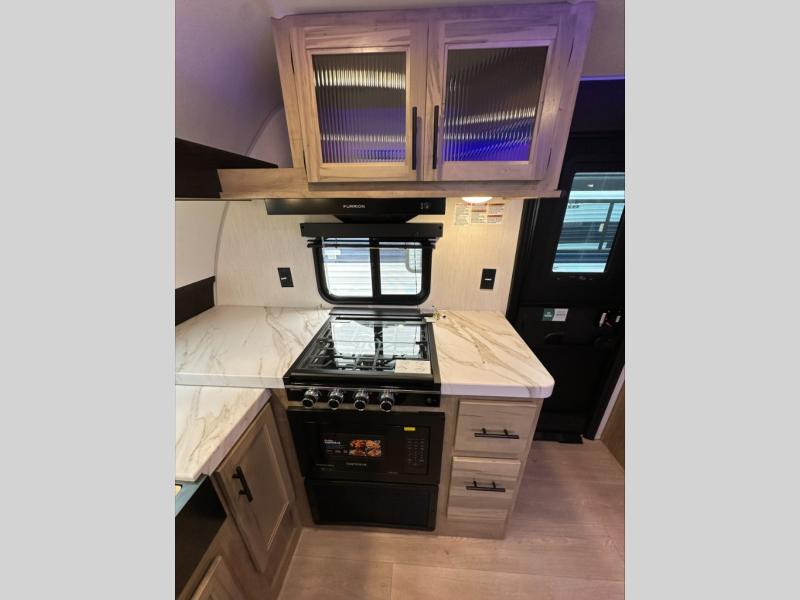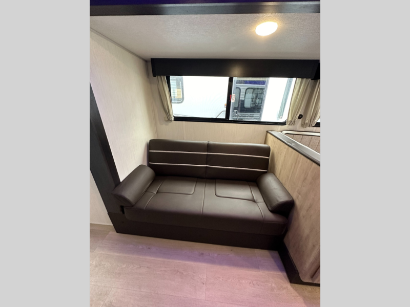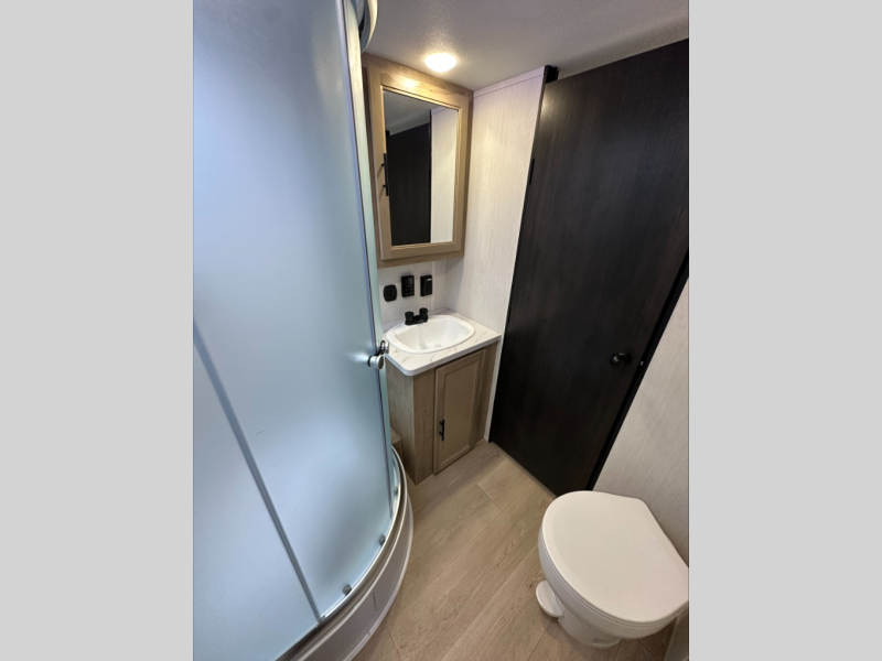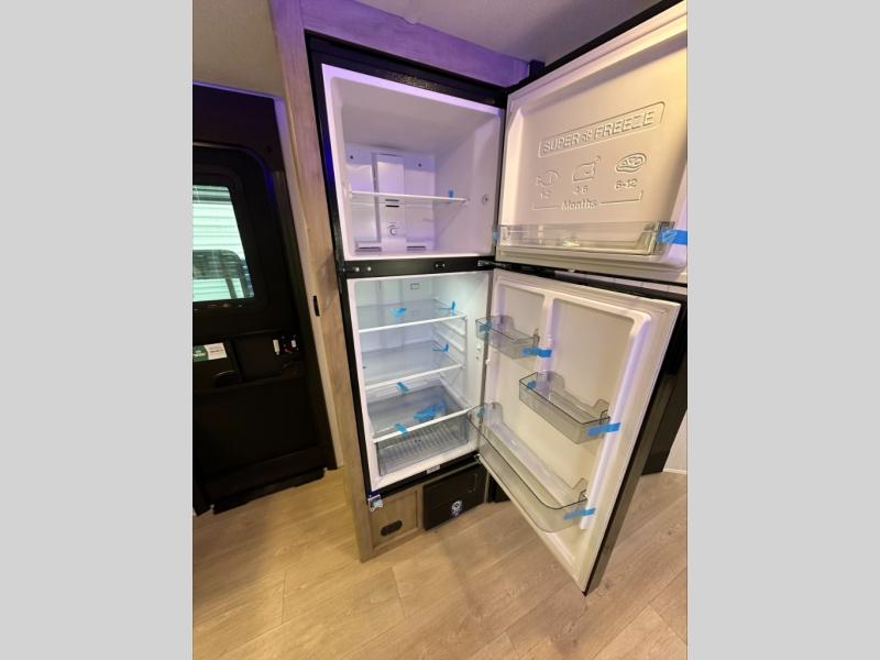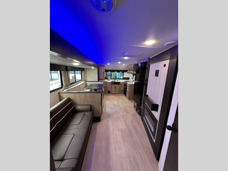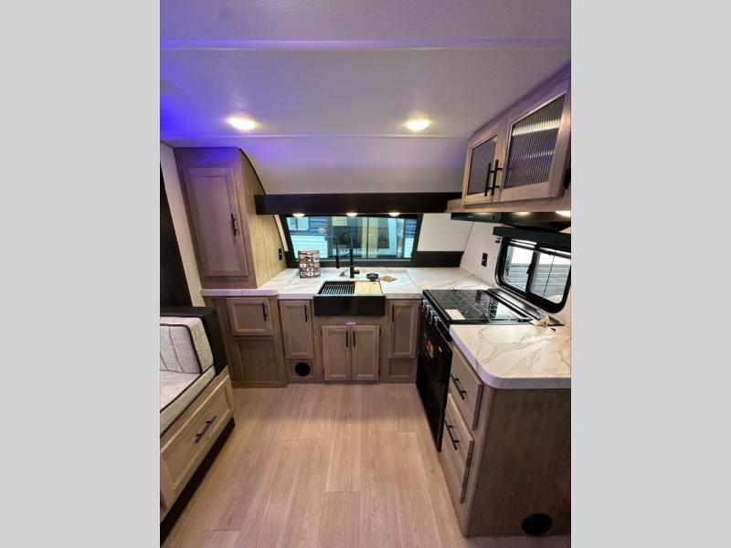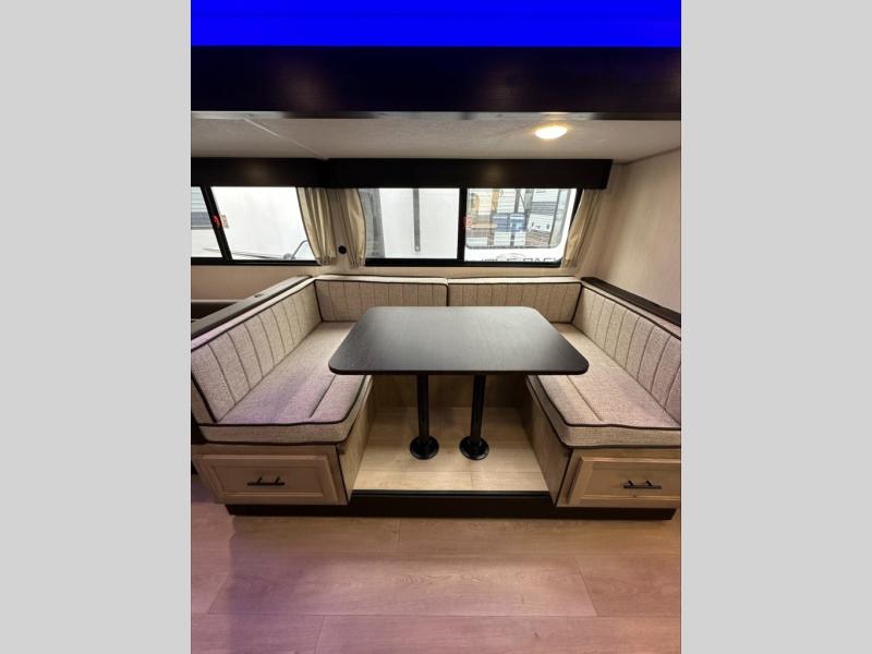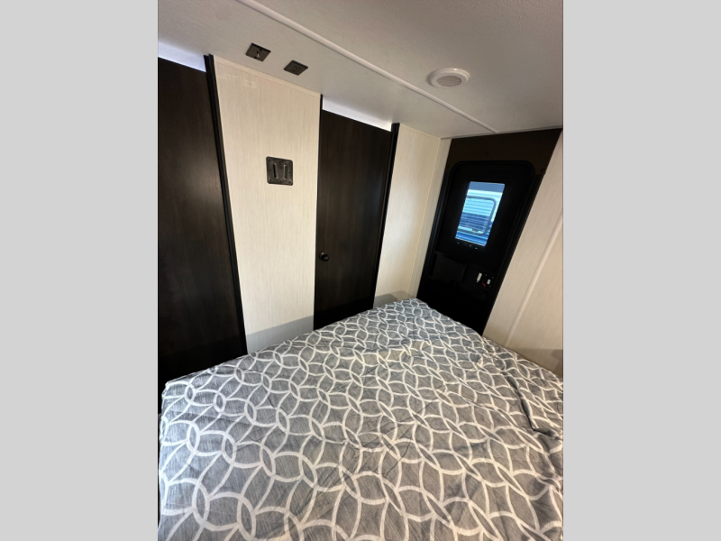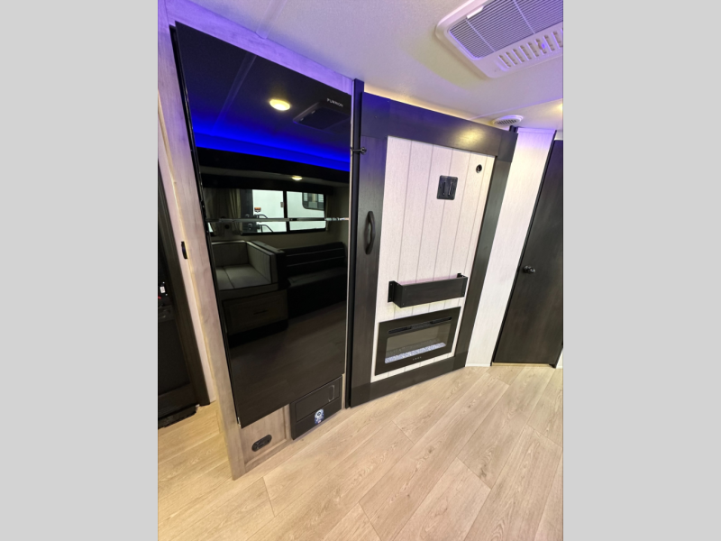 Since this travel trailer features dual entry doors, you can enter in through the rear master bedroom or the front kitchen; how convenient! The kitchen includes ample counter space and all the appliances to prep meals, along with a pantry up front and a hidden pantry behind the fireplace. Your crew can get comfortable on the sofa or play a game around the U-shaped dinette, although you may just find yourselves outdoors since there is an outside kitchen and a power awning with LED lights. The dual entry bath will let you enter in through the main living area, plus it has a private entrance into the bedroom. Here, you'll find an RV king bed, a wardrobe for your things, and USB ports to keep your electronics charged!
