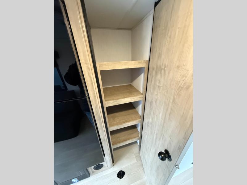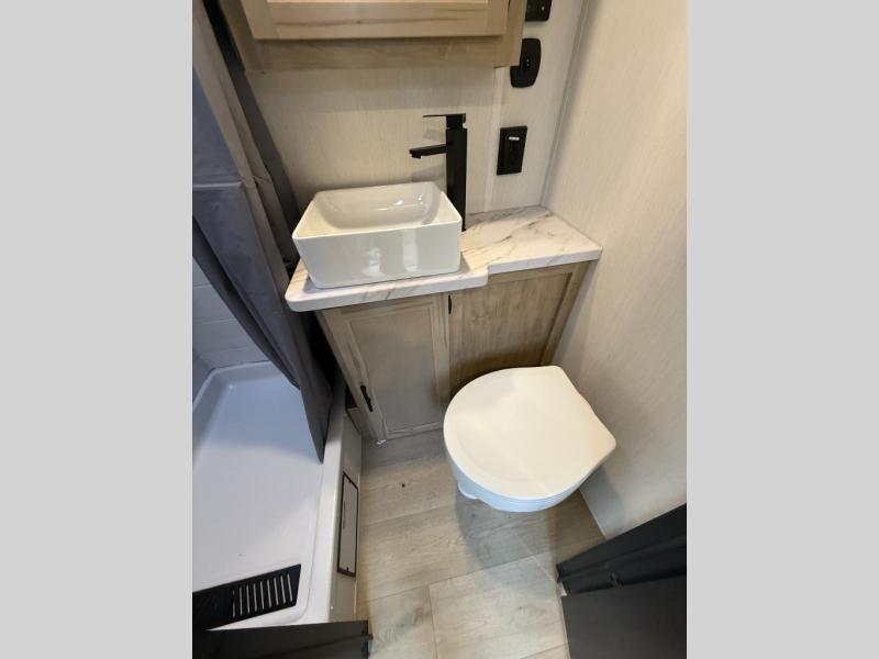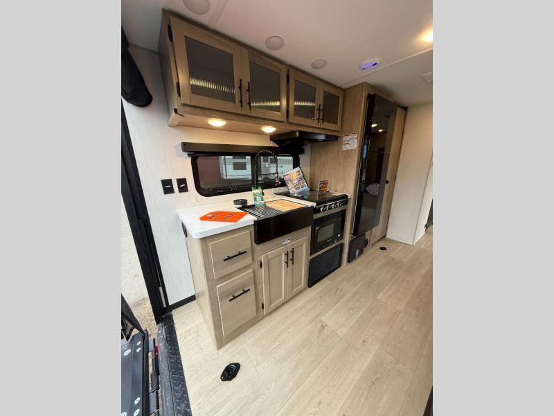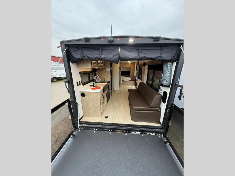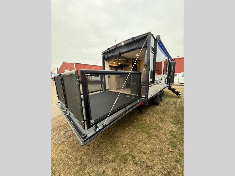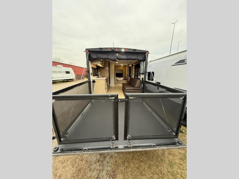 You will undoubtedly love this Cherokee Grey Wolf Black Label toy hauler! Because of its ability to have up to 15' 2" of cargo space, you can easily load up the ramp door and head out to your outdoor toy land, and you can bring much more than just your toys since this trailer also comes with exterior storage, a bedside wardrobe, overhead cabinets, a refrigerator, and a kitchen pantry. The full bathroom is another feature that is going to allow you to experience a true getaway since you won't need to find public facilities to use while you're gone, and the USB charging stations will allow you to charge your phone inside while you're outside playing.