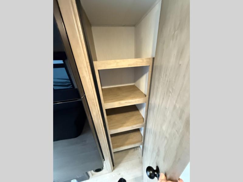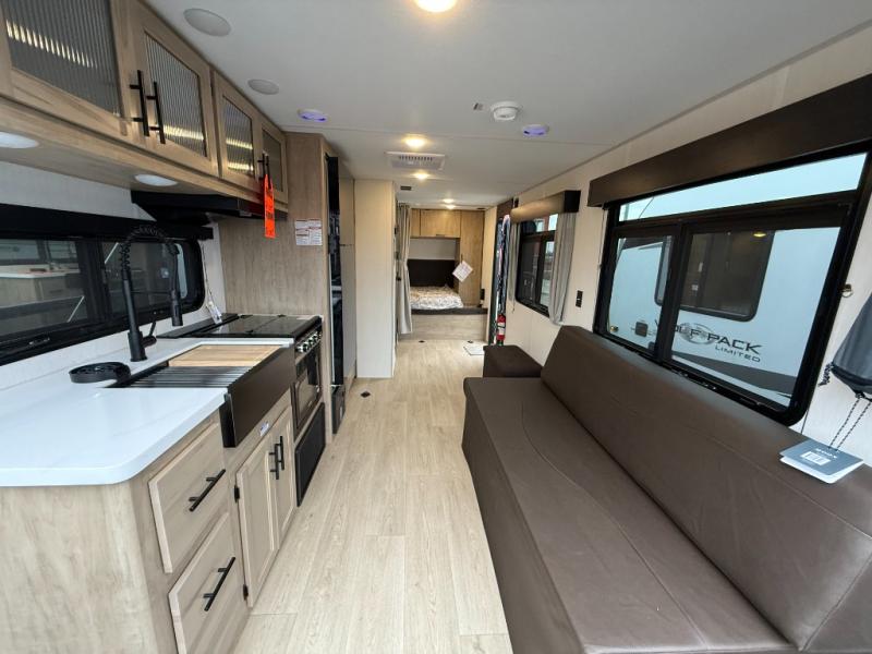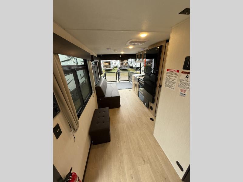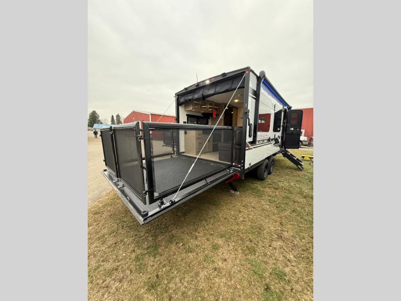You will undoubtedly love this Cherokee Grey Wolf Black Label toy hauler! Because of its ability to have up to 15' 2" of cargo space, you can easily load up the ramp door and head out to your outdoor toy land, and you can bring much more than just your toys since this trailer also comes with exterior storage, a bedside wardrobe, overhead cabinets, a refrigerator, and a kitchen pantry. The full bathroom is another feature that is going to allow you to experience a true getaway since you won't need to find public facilities to use while you're gone, and the USB charging stations will allow you to charge your phone inside while you're outside playing.