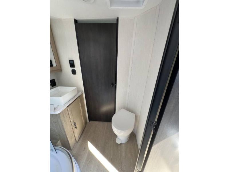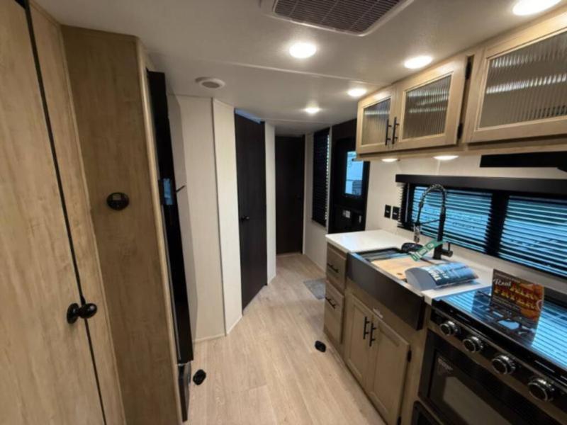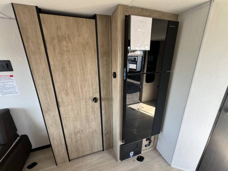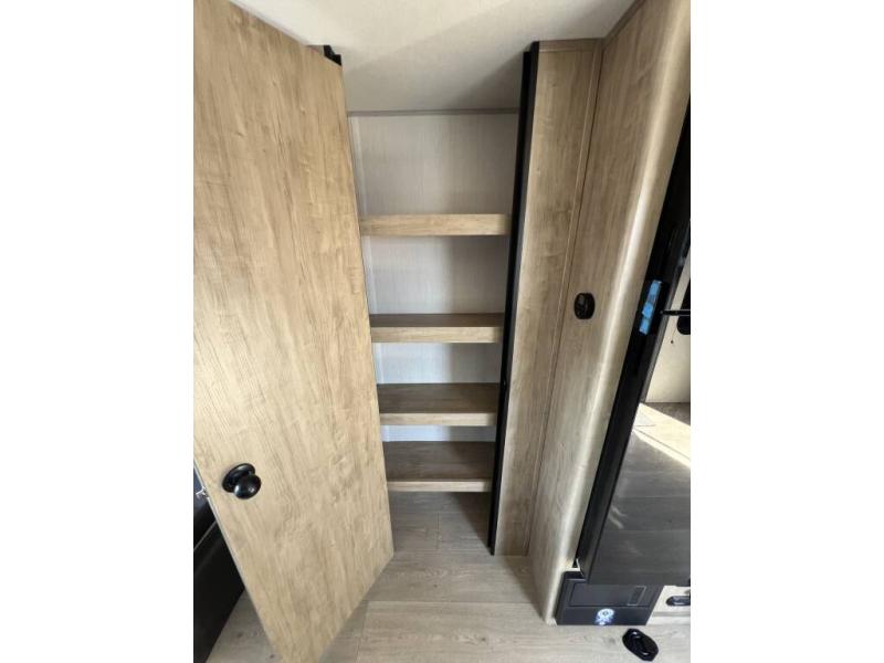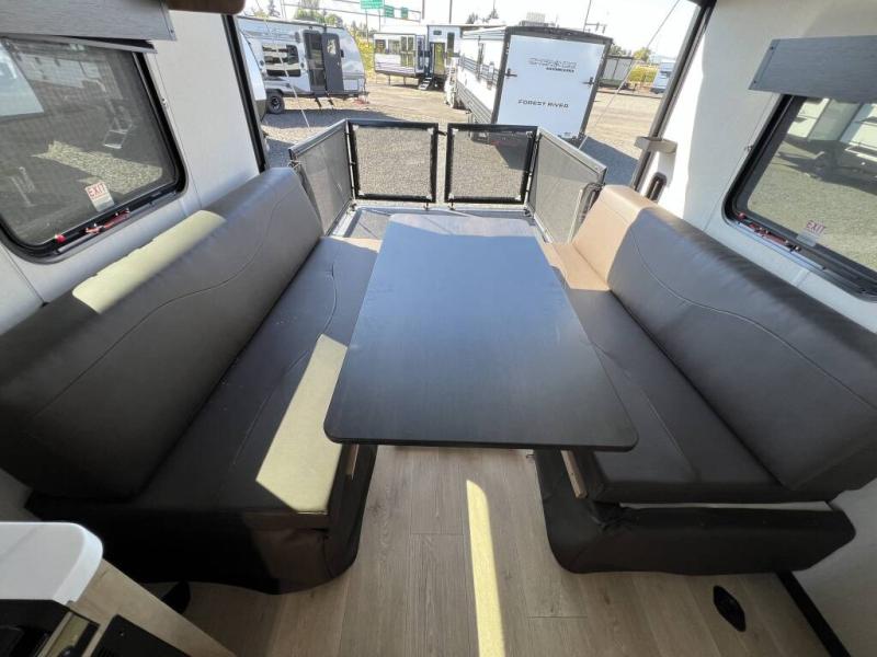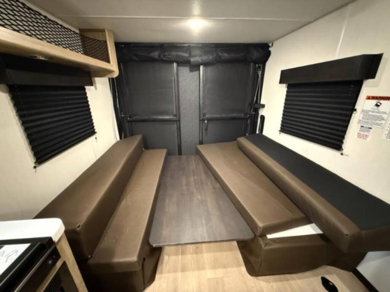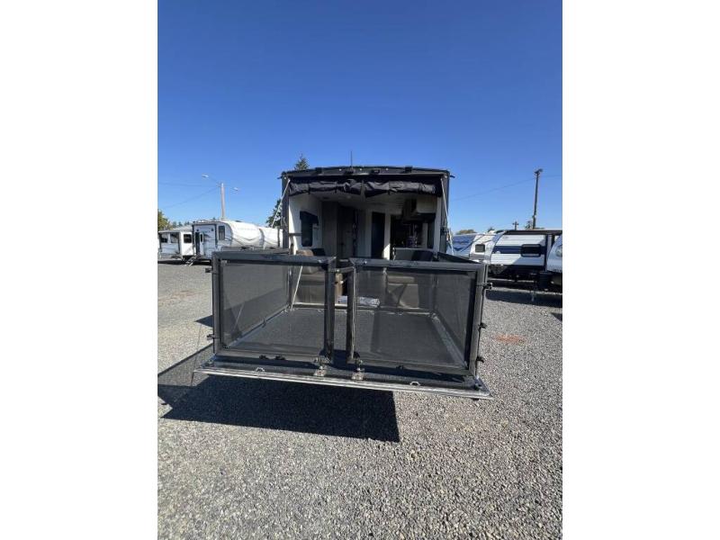 You will love this Cherokee Grey Wolf Black Label toy hauler with a rear ramp door for loading and unloading your toys and gear. If you position the fold-down sofas up against the wall, you will have even more room for extra gear when you are moving down the road. Set up camp and easily create a great dining area with the table between each fold-down sofa. You can also create your best meals in a breeze with the air fryer, and a large pantry allows you to pack all of the snacks and canned goods you need for your adventure. You will appreciate the master suite up front for a great night's rest on the RV king bed along with easy access into the dual-entry bath.
