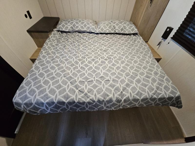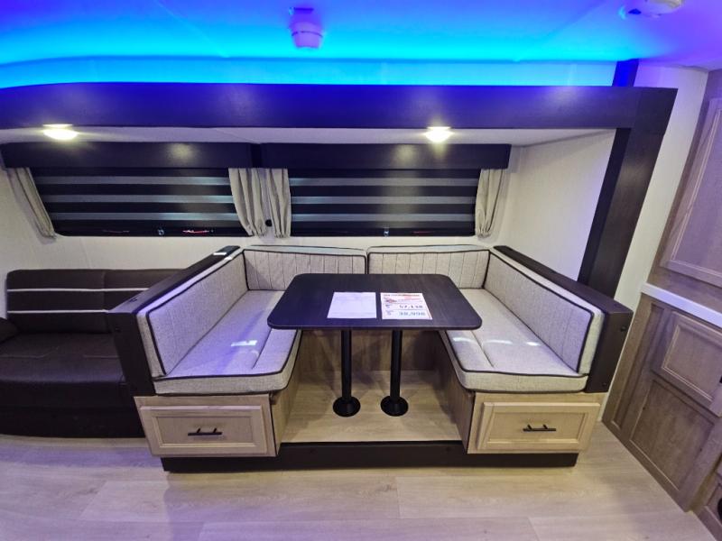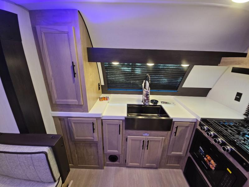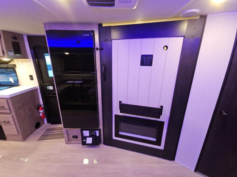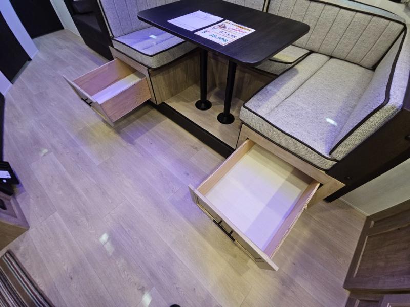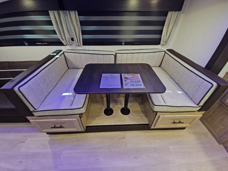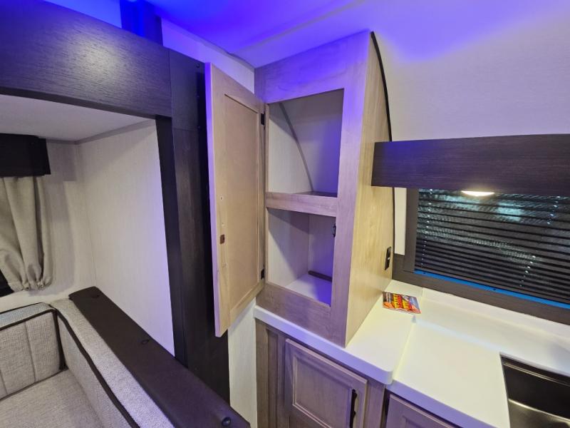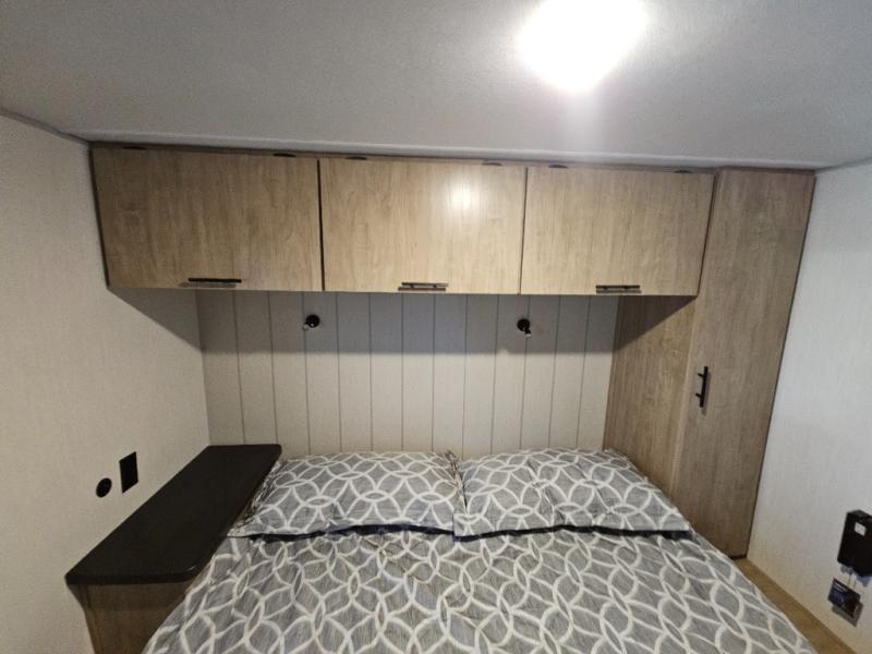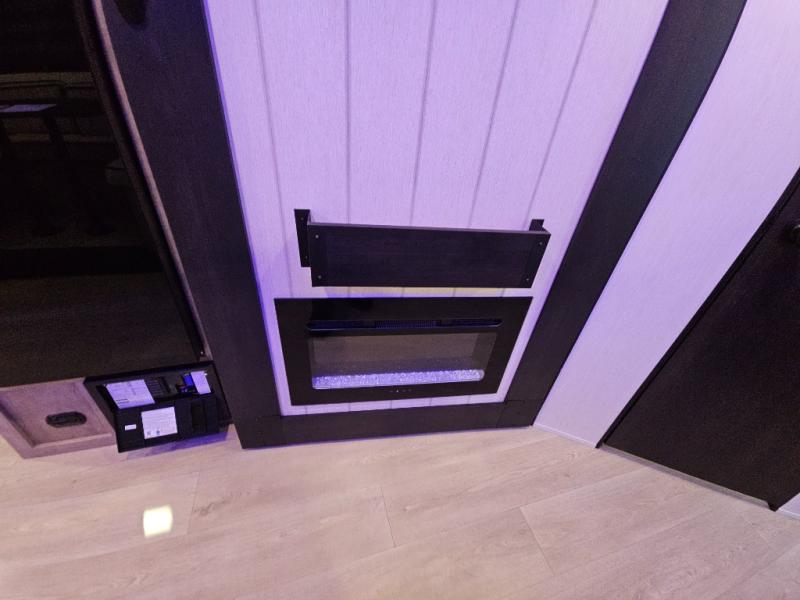 Since this travel trailer features dual entry doors, you can enter in through the rear master bedroom or the front kitchen; how convenient! The kitchen includes ample counter space and all the appliances to prep meals, along with a pantry up front and a hidden pantry behind the fireplace. Your crew can get comfortable on the sofa or play a game around the U-shaped dinette, although you may just find yourselves outdoors since there is an outside kitchen and a power awning with LED lights. The dual entry bath will let you enter in through the main living area, plus it has a private entrance into the bedroom. Here, you'll find an RV king bed, a wardrobe for your things, and USB ports to keep your electronics charged!