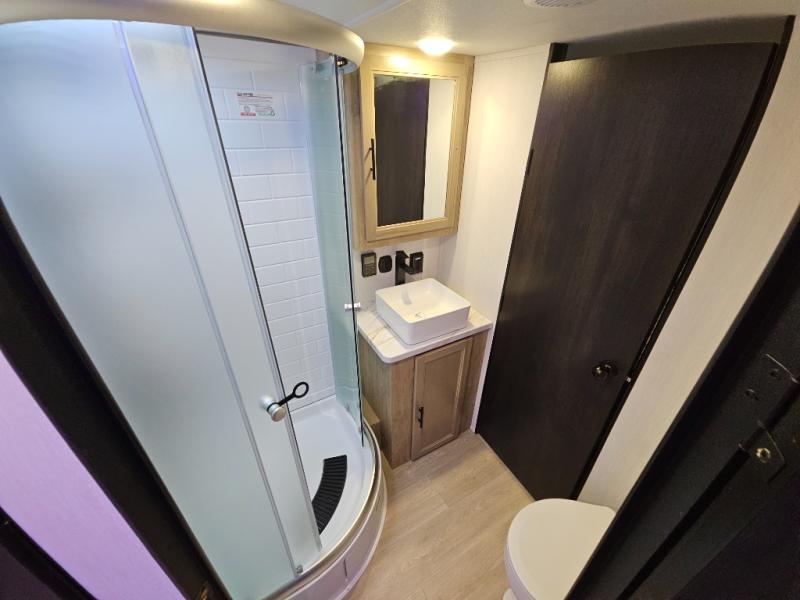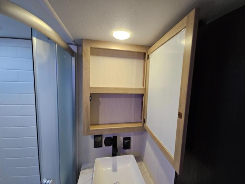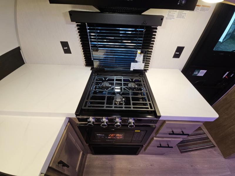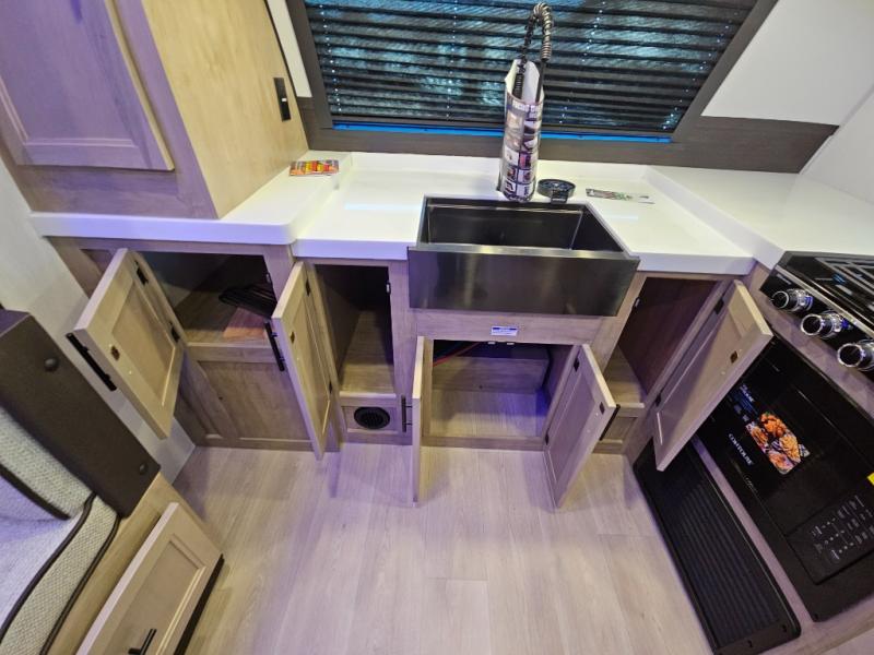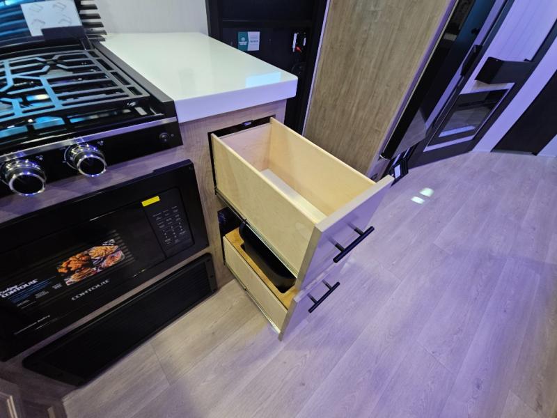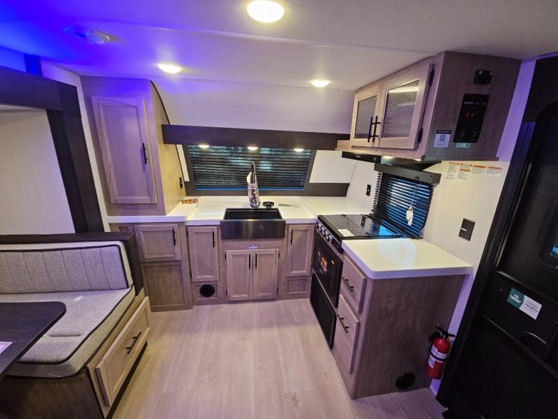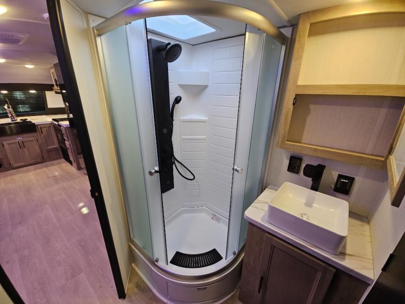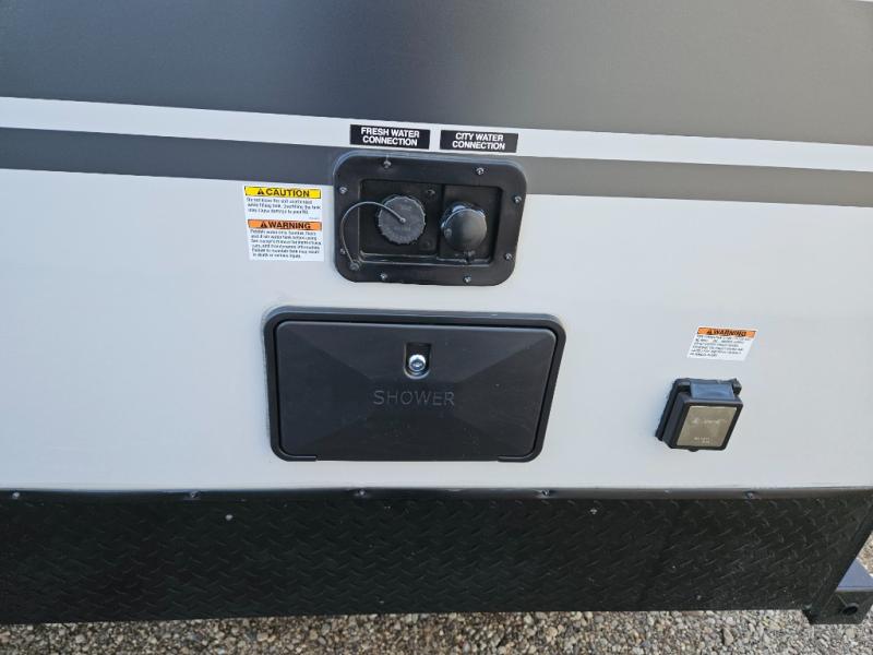Since this travel trailer features dual entry doors, you can enter in through the rear master bedroom or the front kitchen; how convenient! The kitchen includes ample counter space and all the appliances to prep meals, along with a pantry up front and a hidden pantry behind the fireplace. Your crew can get comfortable on the sofa or play a game around the U-shaped dinette, although you may just find yourselves outdoors since there is an outside kitchen and a power awning with LED lights. The dual entry bath will let you enter in through the main living area, plus it has a private entrance into the bedroom. Here, you'll find an RV king bed, a wardrobe for your things, and USB ports to keep your electronics charged!