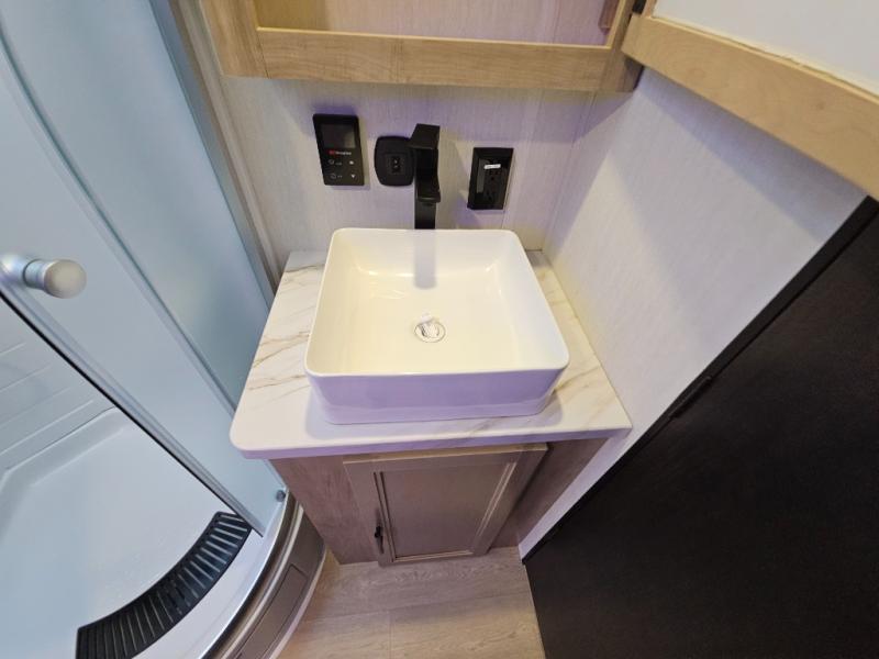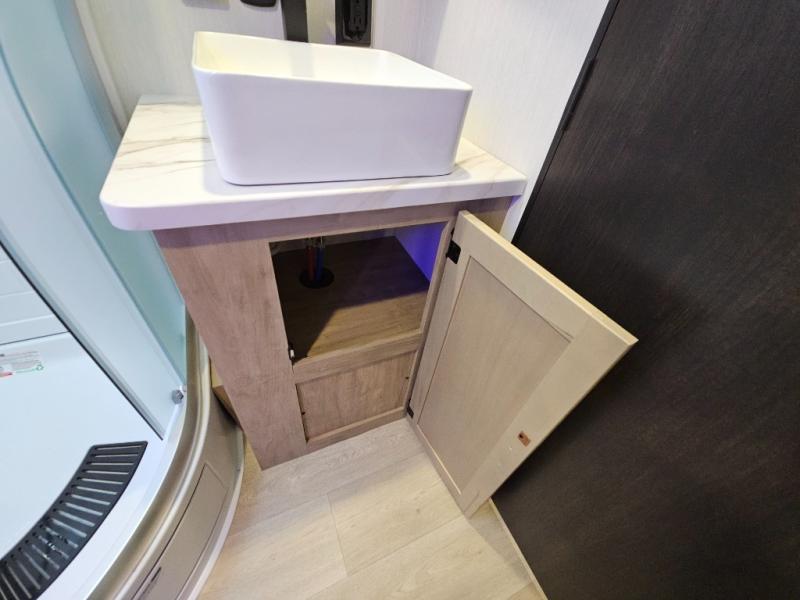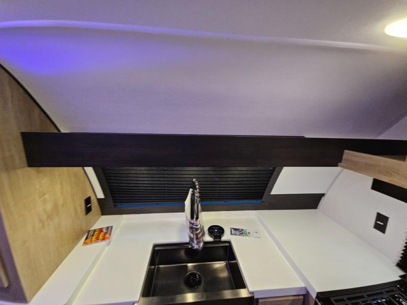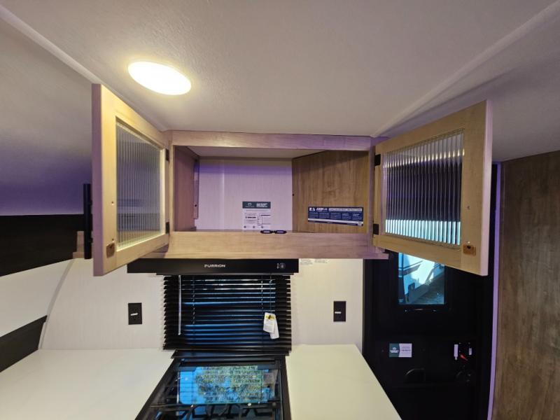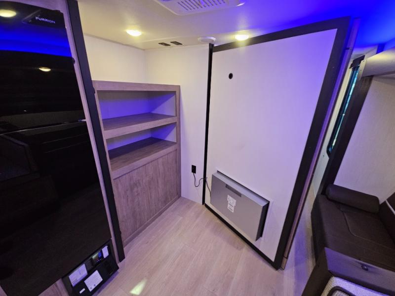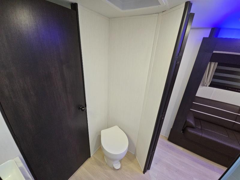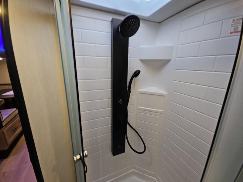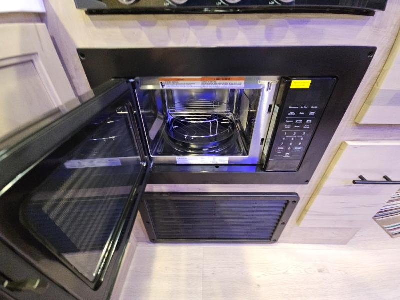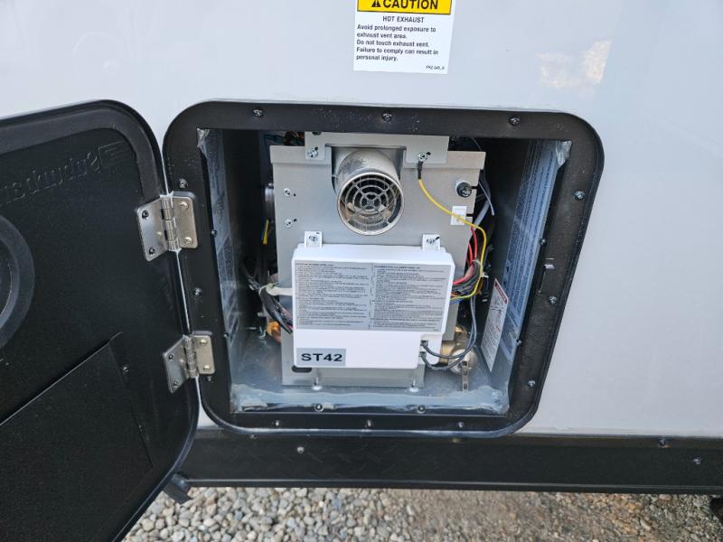 Since this travel trailer features dual entry doors, you can enter in through the rear master bedroom or the front kitchen; how convenient! The kitchen includes ample counter space and all the appliances to prep meals, along with a pantry up front and a hidden pantry behind the fireplace. Your crew can get comfortable on the sofa or play a game around the U-shaped dinette, although you may just find yourselves outdoors since there is an outside kitchen and a power awning with LED lights. The dual entry bath will let you enter in through the main living area, plus it has a private entrance into the bedroom. Here, you'll find an RV king bed, a wardrobe for your things, and USB ports to keep your electronics charged!