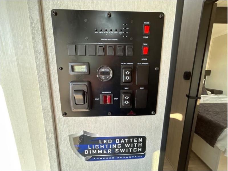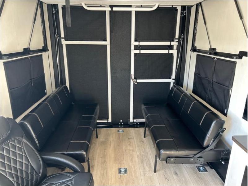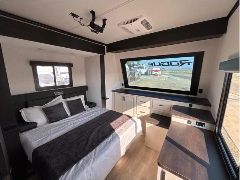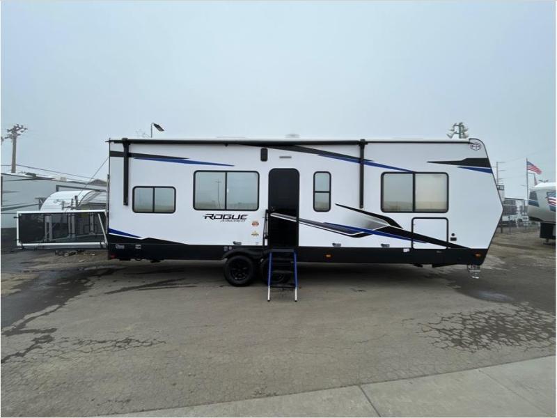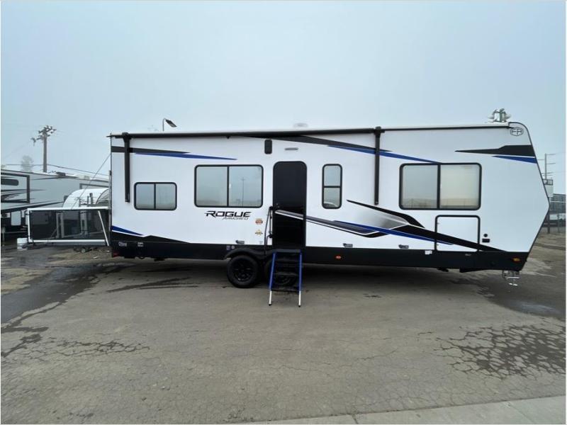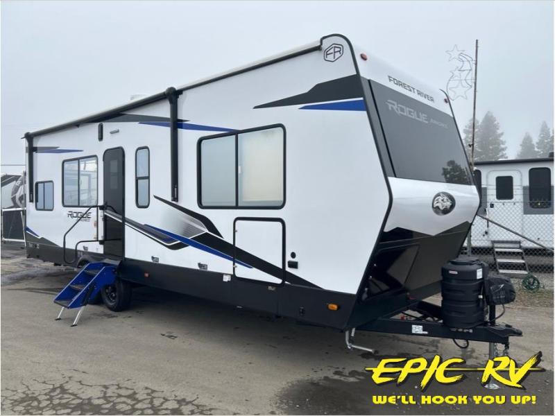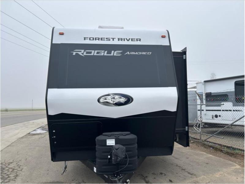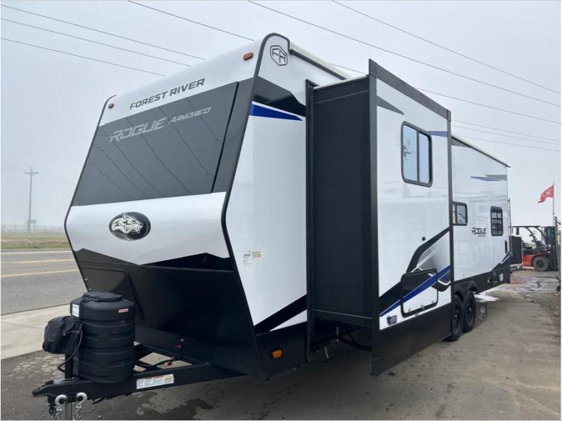 Every one of these Forest River Cherokee Rogue Armored travel trailer toy haulers come with the features you want most at an affordable price tag! The DuraPoxy gas/oil resistant floor has 5,000 lb. tie downs to ensure your toys will arrive safely without damaging the flooring, plus the 3,000 lb. rated ramp door makes it easy to load them. A 15,000 BTU A/C will keep you cool even on the hottest summer days, and there are heated enclosed holding tanks with 12V heat pads on every tank for added protection. Each model includes a fuel station with a digital readout, a ramp door patio system, a tire pressure monitoring system, and many more stand-out features. Inside, you'll find zebra shades in the living room, multiple USB charging stations, a multi-functional kitchen sink, glass shower doors, and many more comforts!