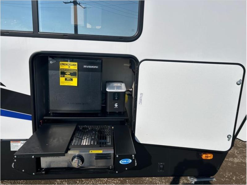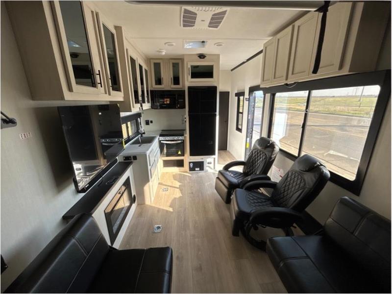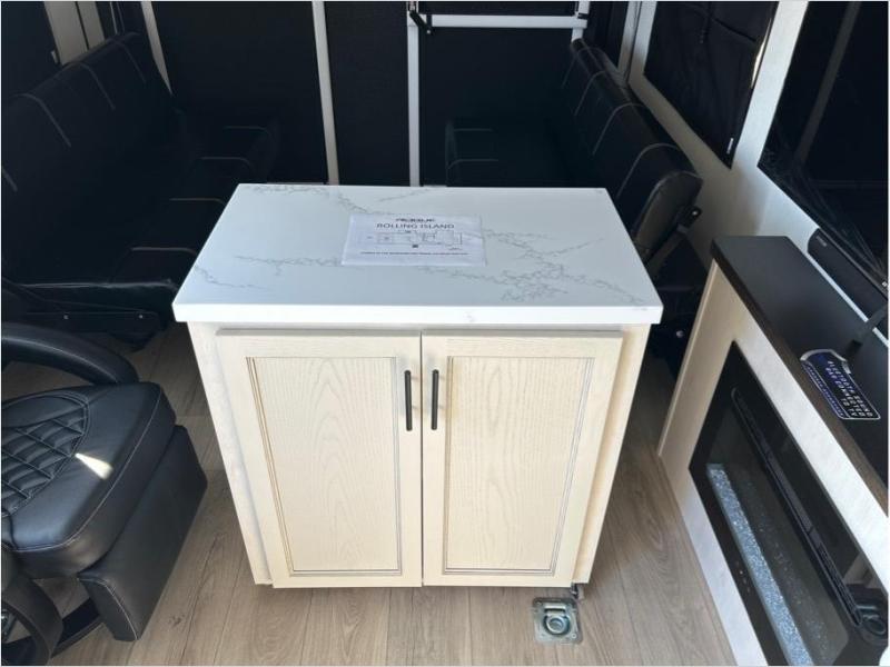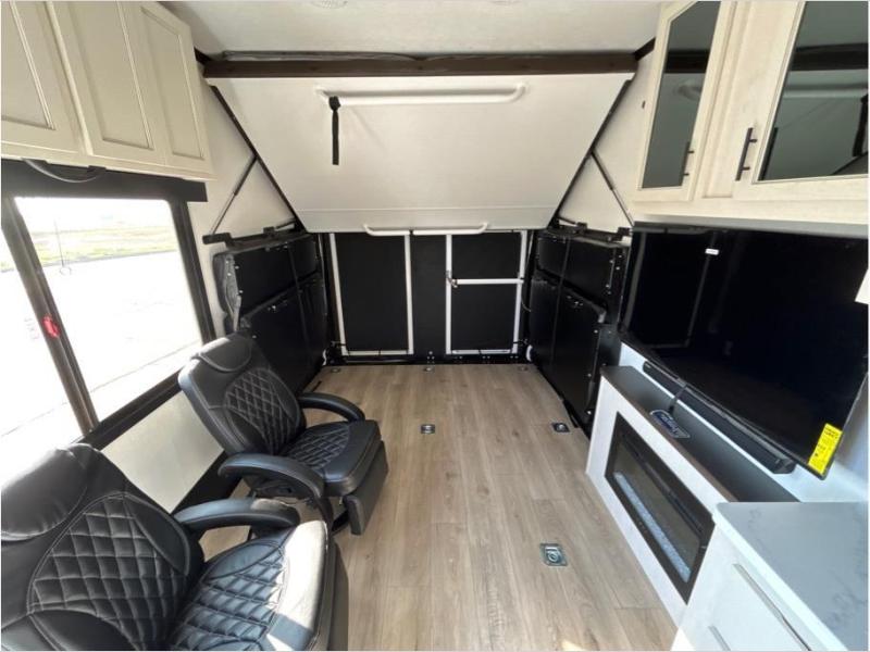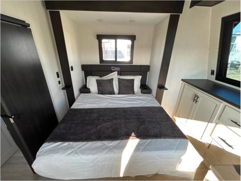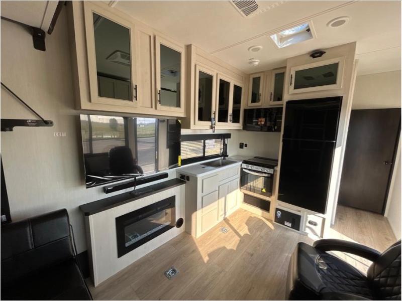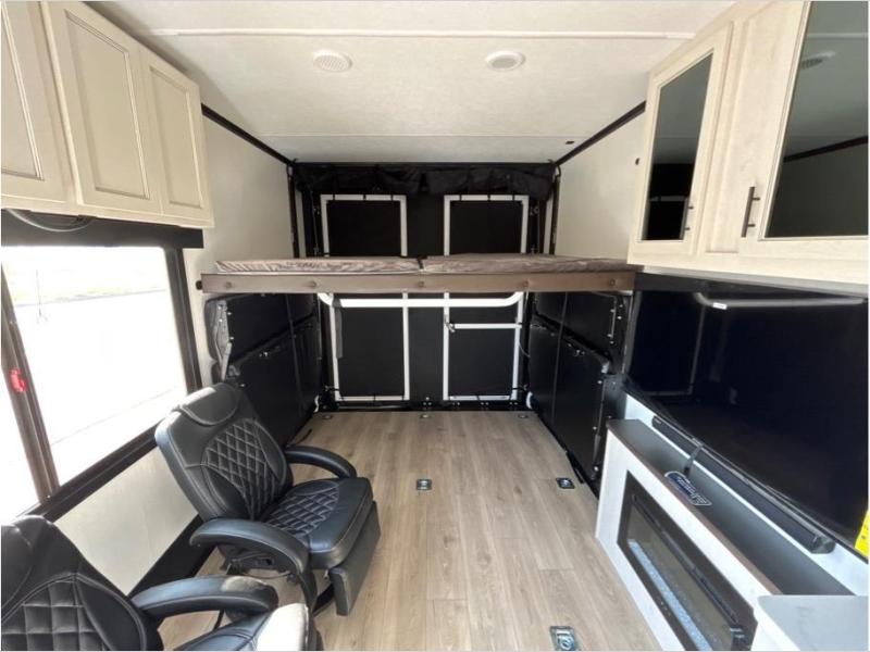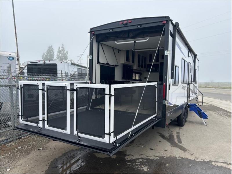 Head for the trails with this toy hauler in tow! Once your toys are unloaded from the 14' 1" garage, you can relax on the dual flip-up sofas with a queen bed above. There are also optional dual lounge chairs across from the entertainment center with a cozy fireplace! The chef of your crew can make meals inside on the three-burner cooktop, or head outdoors to utilize the outside kitchen. When you're ready to call it a night, retreat to the front private bedroom for a great night's rest on the trailer king bed slide out. There is also a large dresser here to keep your things organized.