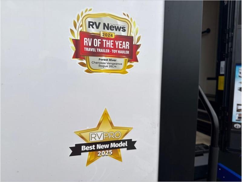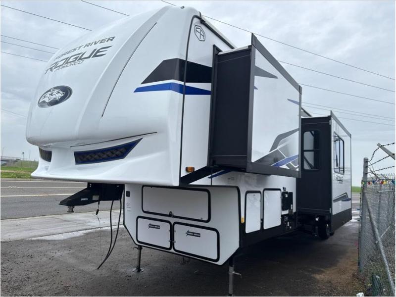 Every one of these Forest River Cherokee Rogue Armored fifth wheel toy haulers come with the features you want most at an affordable price tag! The DuraPoxy gas/oil resistant floor has 5,000 lb. tie downs to ensure your toys will arrive safely without damaging the flooring, plus the 3,000 lb. rated ramp door makes it easy to load them. Two 15,000 BTU A/Cs are "Super H Ducted" to keep you cool even on the hottest summer days, and the heated enclosed holding tanks help protect against the elements. Each model also includes a 6-point leveling system, dual LED cargo lights, solar reflective windows, and a tire pressure monitoring system. Inside, you'll enjoy the solid surface countertops, glass shower door, zebra shades in the living room, and stainless-steel multi-purpose sink to name a few comforts!