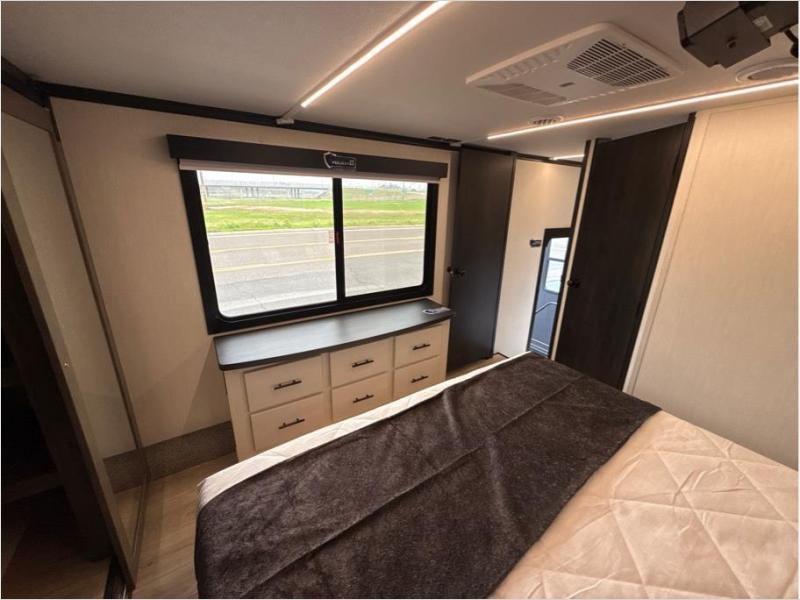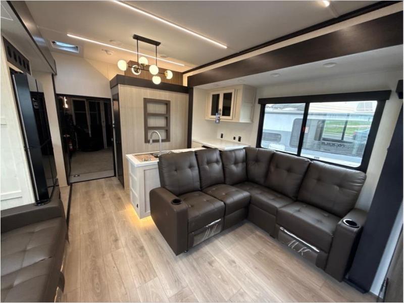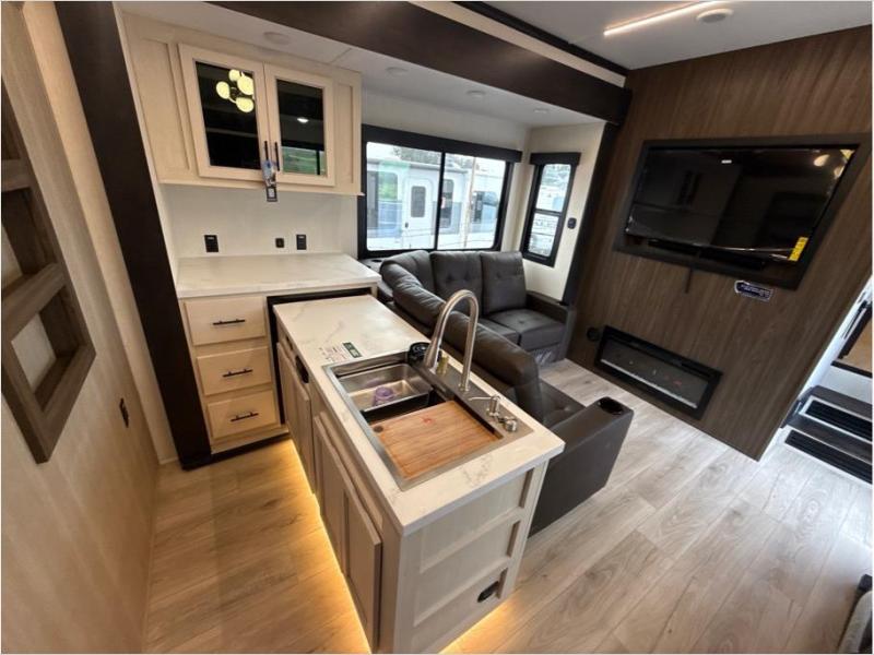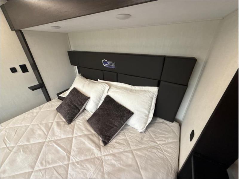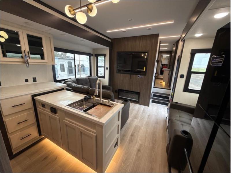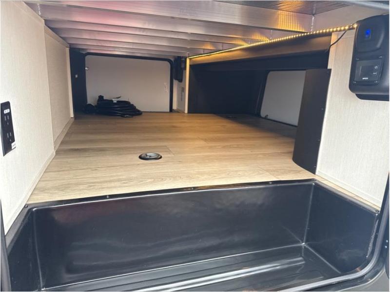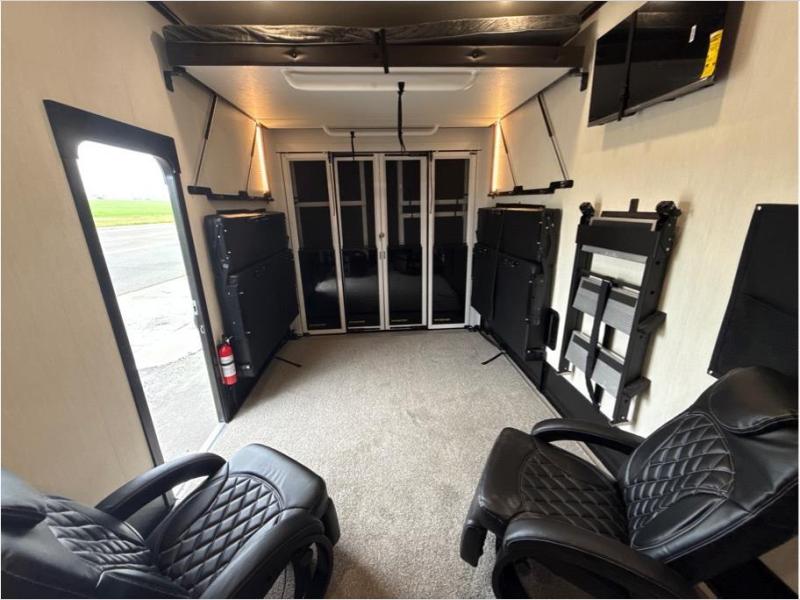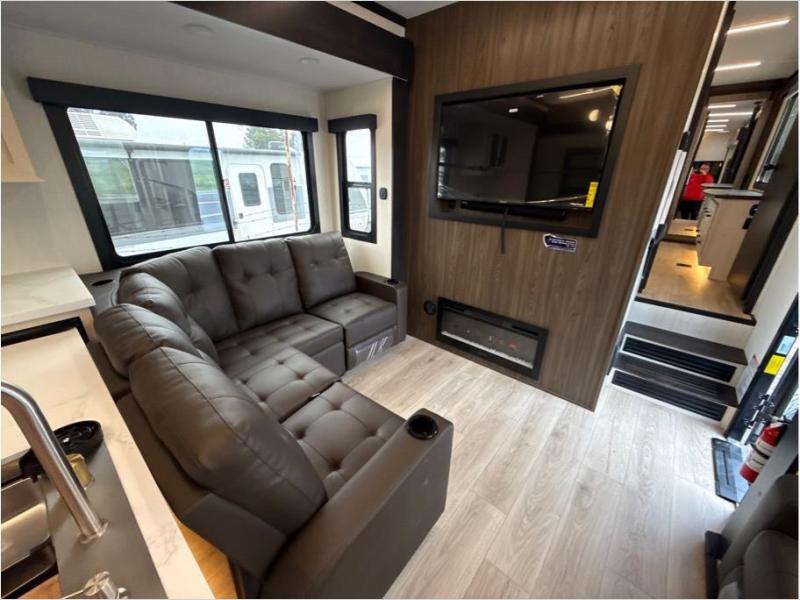 Hit the trails with this triple slide out toy hauler! Once your dirt bikes are unloaded from the 14' 6" garage, you can relax on the dual flip-up sofas with a free-standing table. There is also a raised queen bed above the sofas, a utility bath/shower plus a loft, making this space perfect for guests! The chef of your group will find a counter peninsula to prep meals, a 12V residential style refrigerator, plus a 30" microwave when you need to heat up leftovers. Your crew can get comfortable on the L-shaped sofa or the second sofa, and there is a fireplace to make it cozier! Head up front to the master bedroom that includes a king bed slide out, a large front wardrobe and a dresser, plus your own private full bathroom!