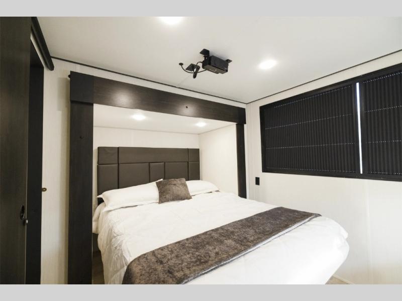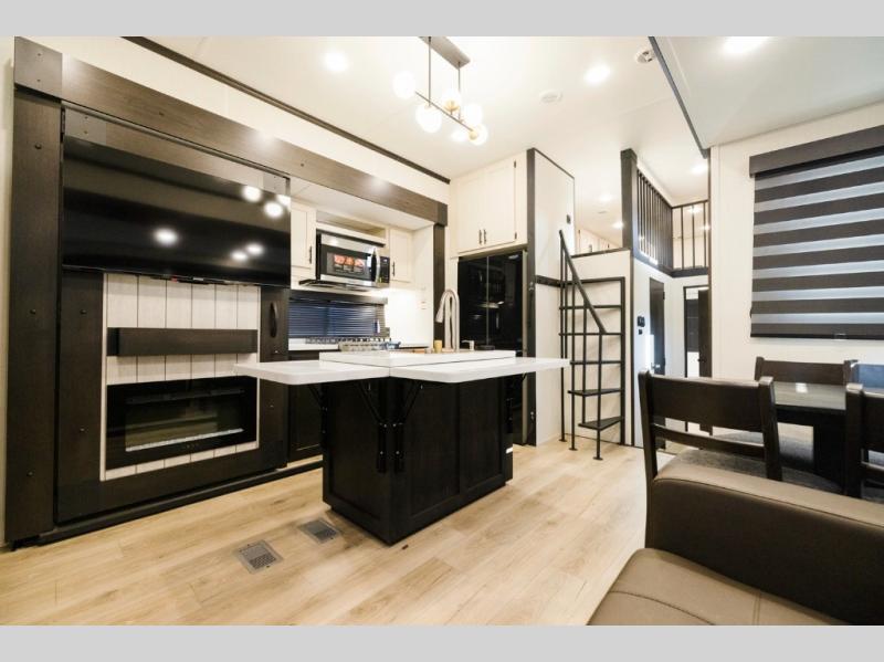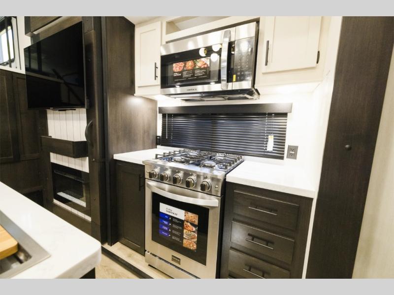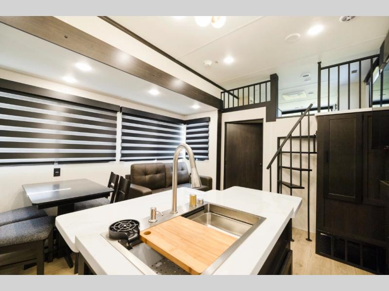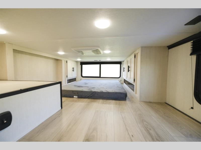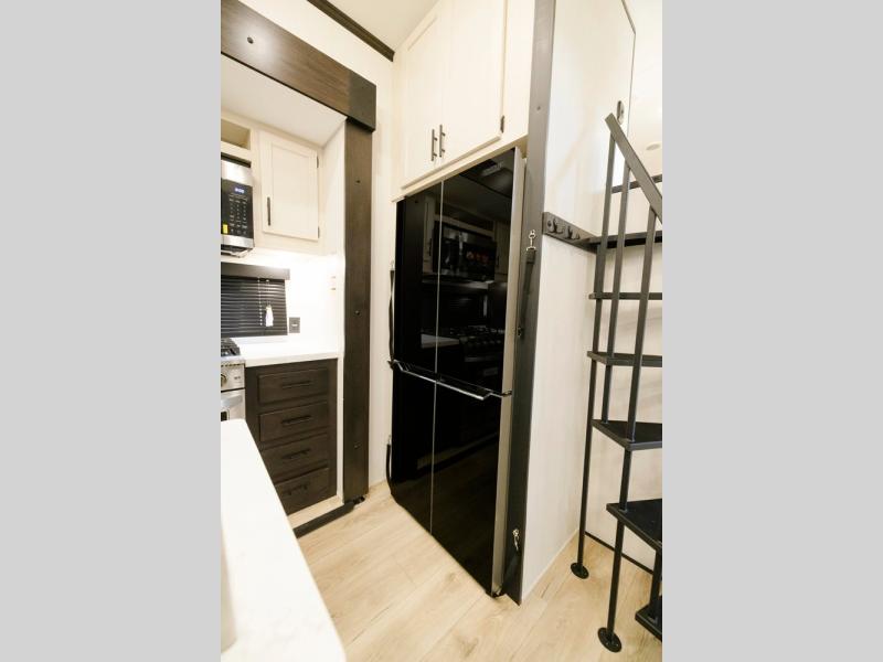 It won't be hard to find comfort in this triple slide out travel trailer with sleeping space for ten. There is a rear swing-away wall and a ramp door that leads to the 10' 5" garage with a Murphy bed system, a utility half bath and a loft above for even more sleeping space. You'll find your own bedroom up front, complete with a queen bed slide, a dresser, and a wardrobe, and there is a second loft above this room as well. The combined kitchen and living area includes a kitchen island with countertop extensions, a hidden pantry, all the appliances to cook meals, plus a dinette table and tri-fold sofa for ample seating spaces.