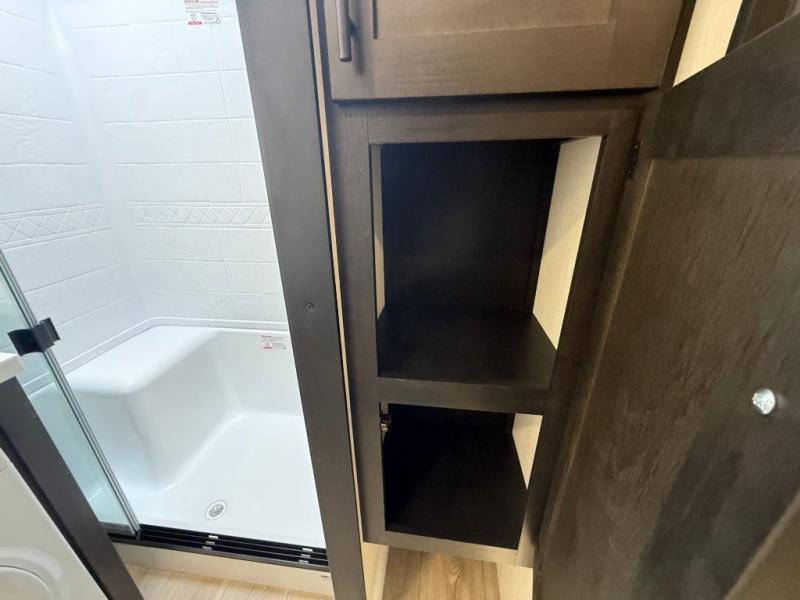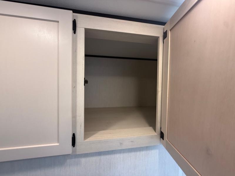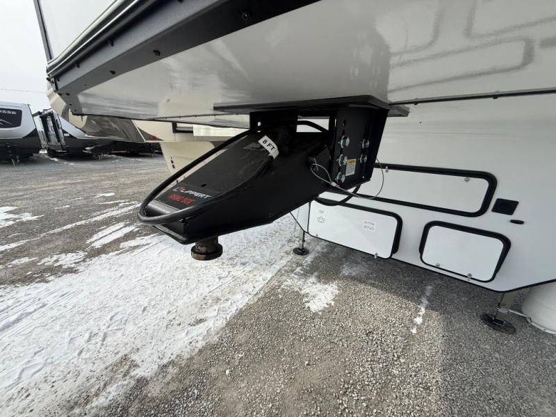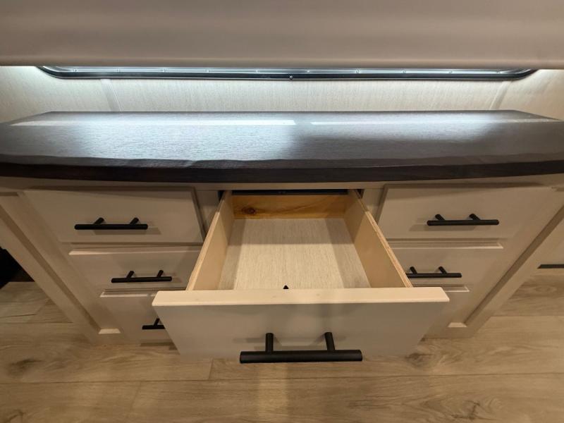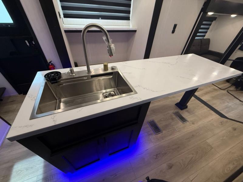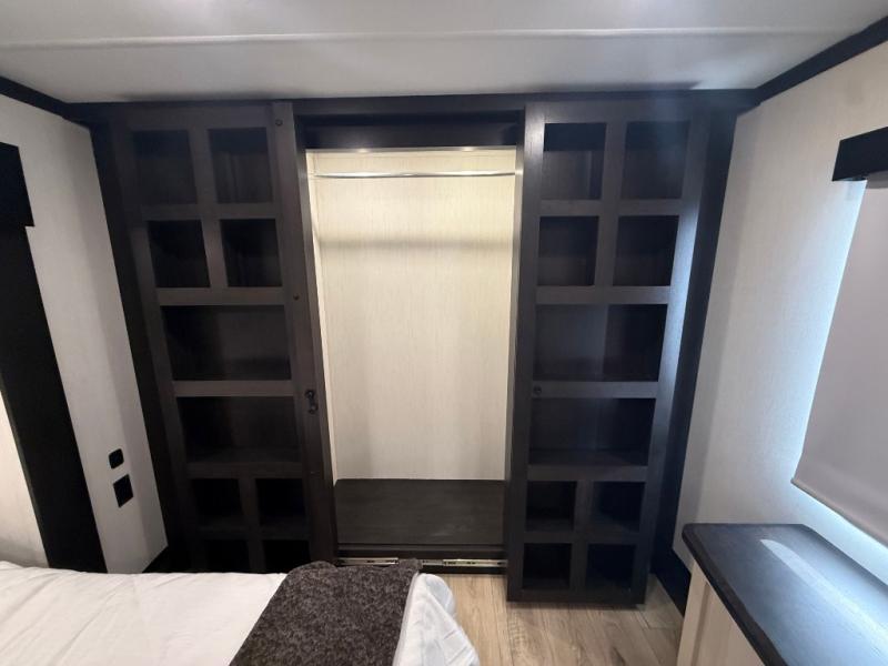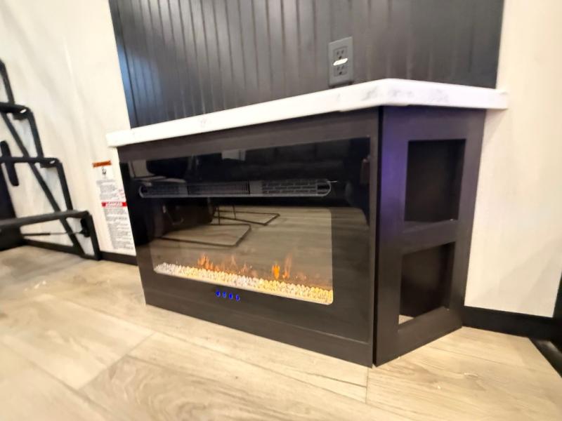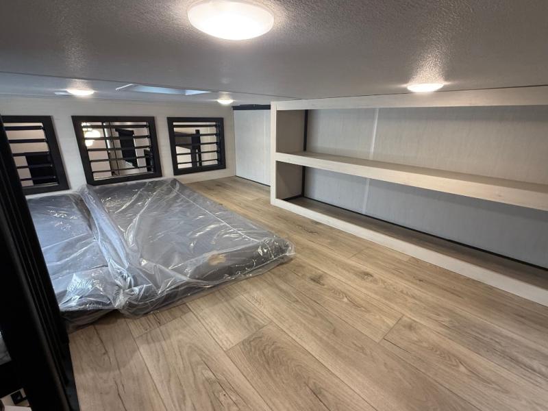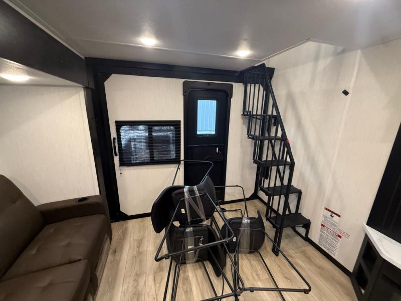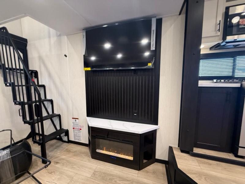 You can't go wrong when camping in this spacious fifth wheel! Once you've unloaded your gear, you can head in through the main entry door that leads to the combined kitchen and living room. There is a large island here to prep lunch, a deluxe pantry, a bar top with stools that overlooks a flip-up window, and even a half bath off of the kitchen for added convenience. A rear garage includes a sofa slide out across from a TV and fireplace, plus fold-up steps that lead to the loft with two bunks mats, TV prep and storage cubbies for your guests' things. You'll find your own bedroom up front with an RV king bed slide out, a front closet with two sliding wardrobe doors, a dresser, and TV prep if you want to watch movies in bed. And the spacious full bath is right next to the bedroom for easy nighttime use!