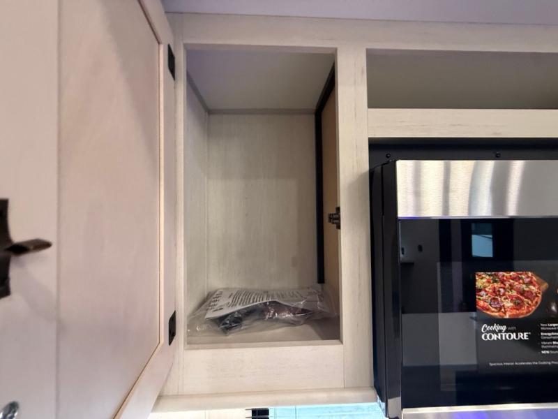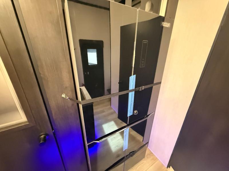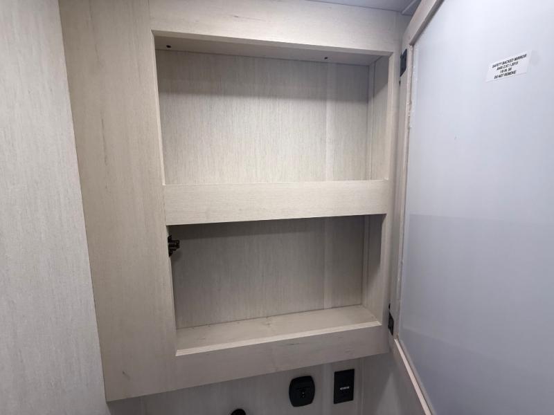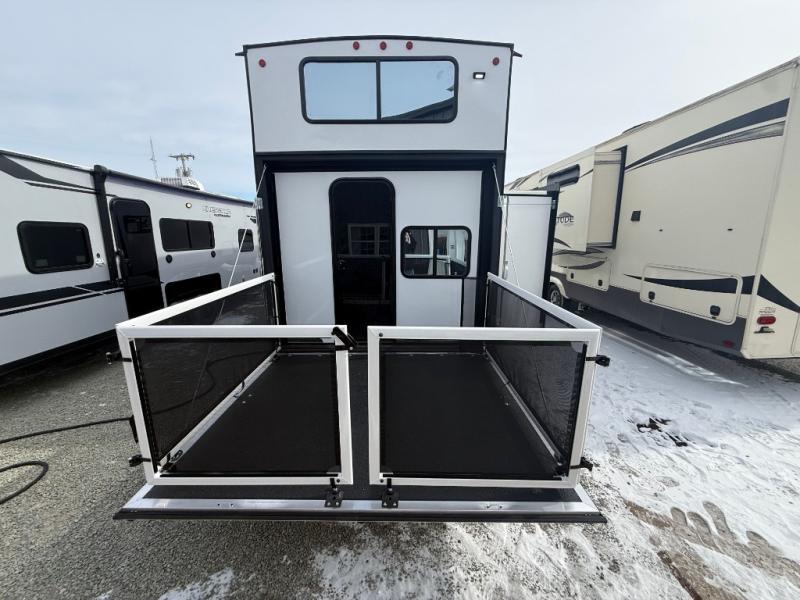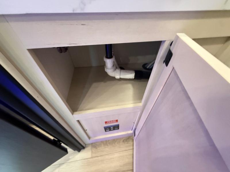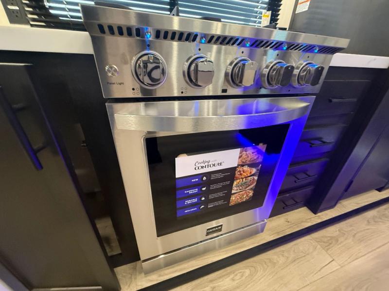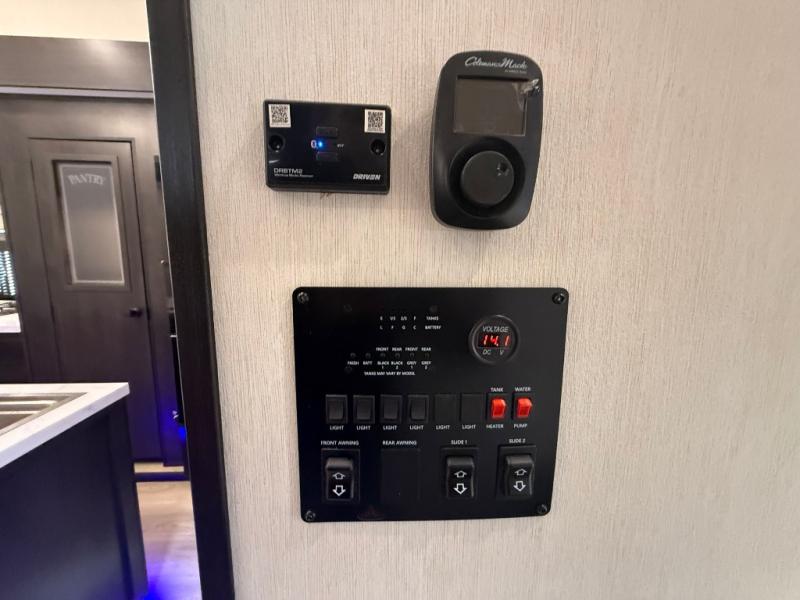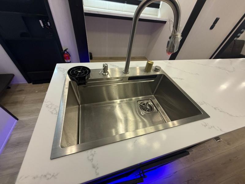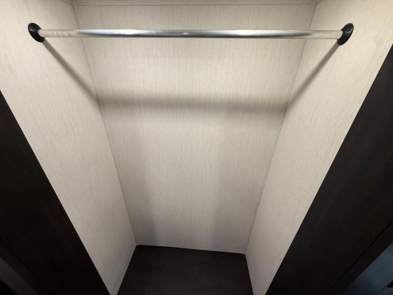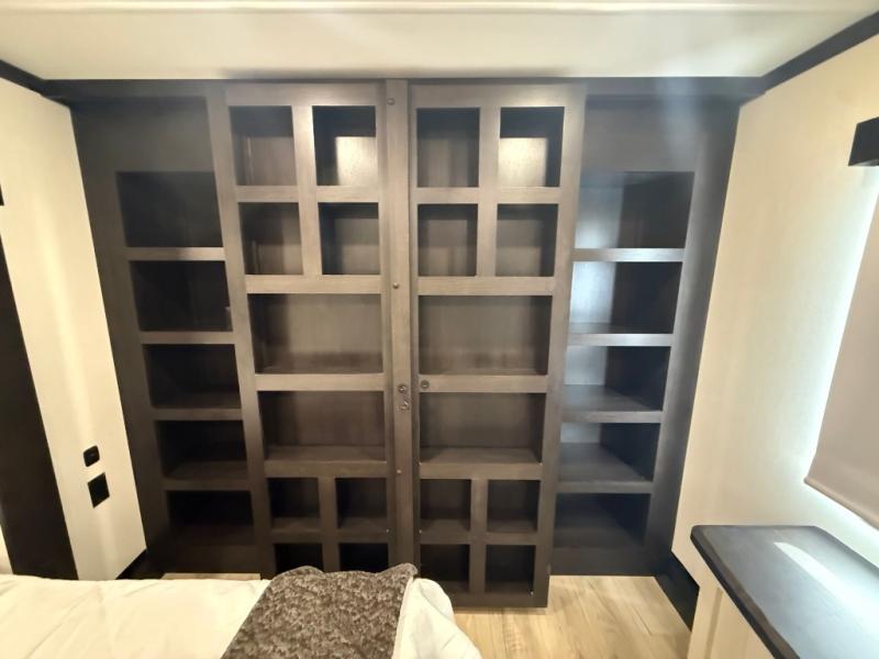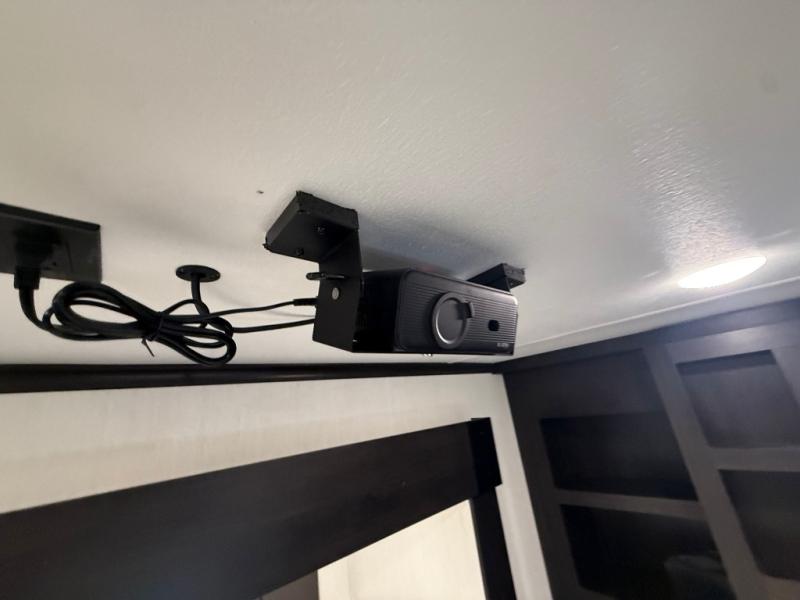 You can't go wrong when camping in this spacious fifth wheel! Once you've unloaded your gear, you can head in through the main entry door that leads to the combined kitchen and living room. There is a large island here to prep lunch, a deluxe pantry, a bar top with stools that overlooks a flip-up window, and even a half bath off of the kitchen for added convenience. A rear garage includes a sofa slide out across from a TV and fireplace, plus fold-up steps that lead to the loft with two bunks mats, TV prep and storage cubbies for your guests' things. You'll find your own bedroom up front with an RV king bed slide out, a front closet with two sliding wardrobe doors, a dresser, and TV prep if you want to watch movies in bed. And the spacious full bath is right next to the bedroom for easy nighttime use!