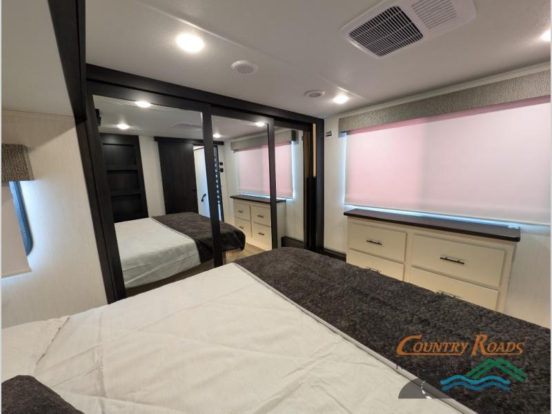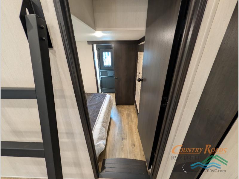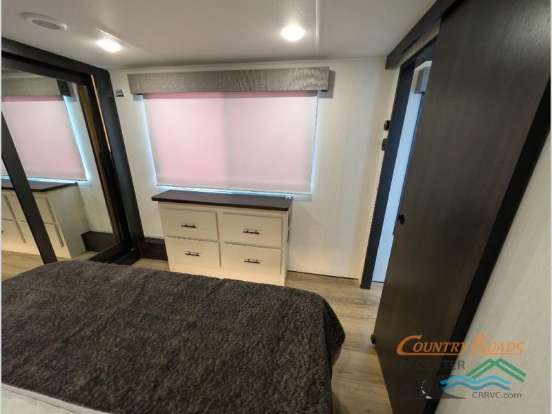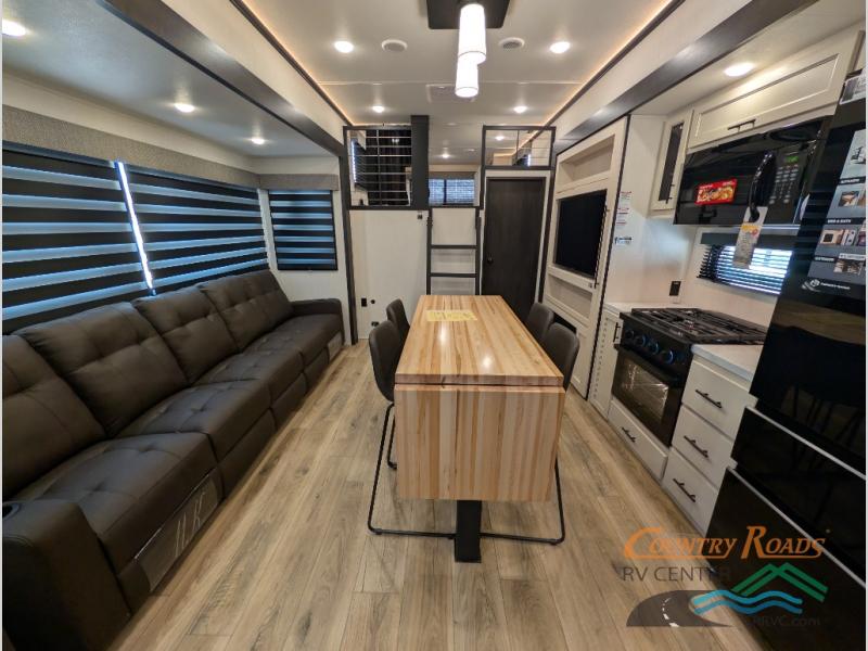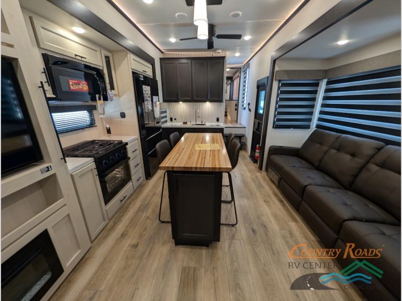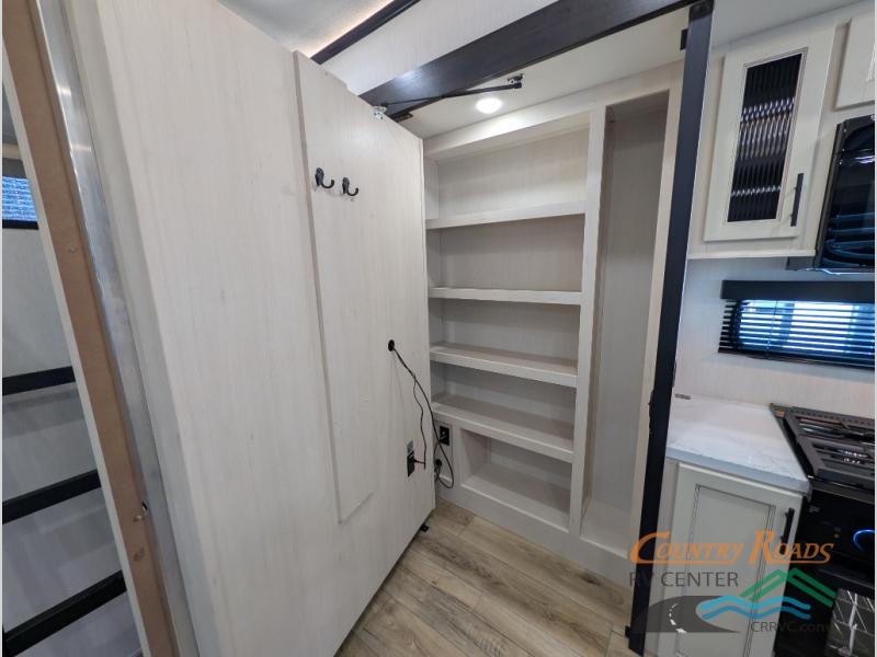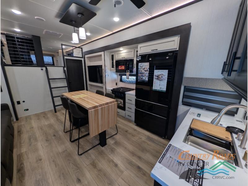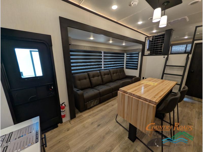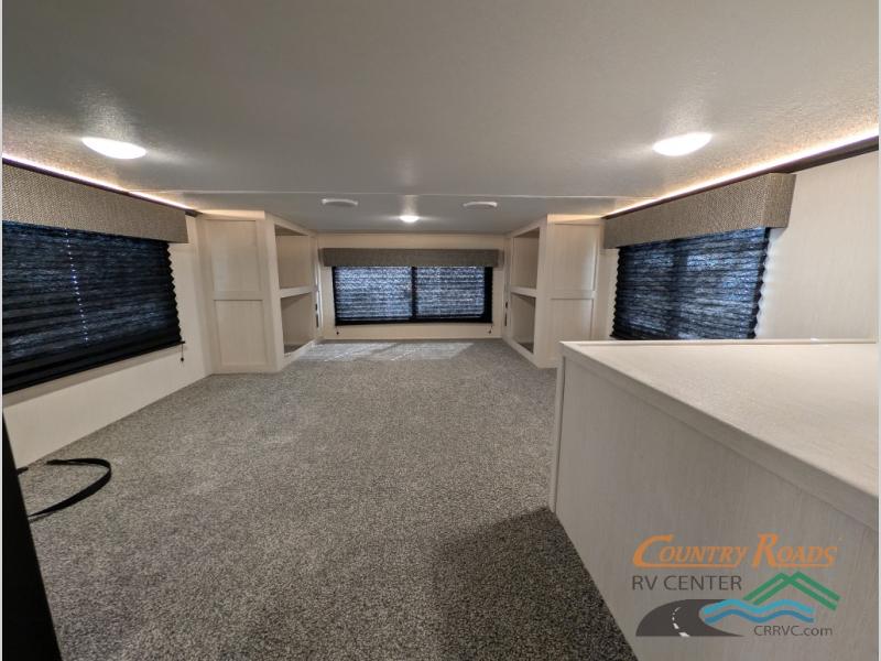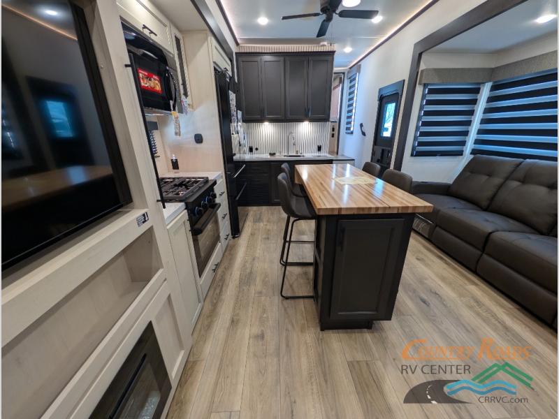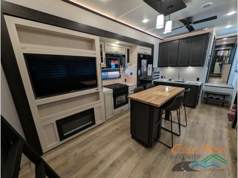 Are you looking for a fifth wheel where you can bring along your neighbor friends? You can do just that since there are two bedrooms in this unit, one of which includes a master bath with its own exterior entry door! The front bedroom is right next to the second full bath for convenience, and includes a camper king bed slide, a dresser, and front wardrobe. The rear master bedroom has a queen bed slide out across from a second slide for more floor space, and there is a loft above this room for more sleeping or storage space. Everyone can meet in the middle kitchen and living room since there are recliners, a ceiling fan, and kitchen island with four chairs. There is also storage below the island for kitchen necessities, and the hidden pantry behind the TV will be perfect for snacks, board games and more!