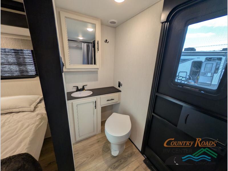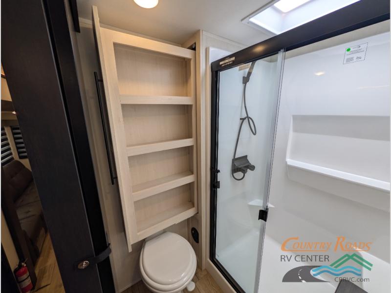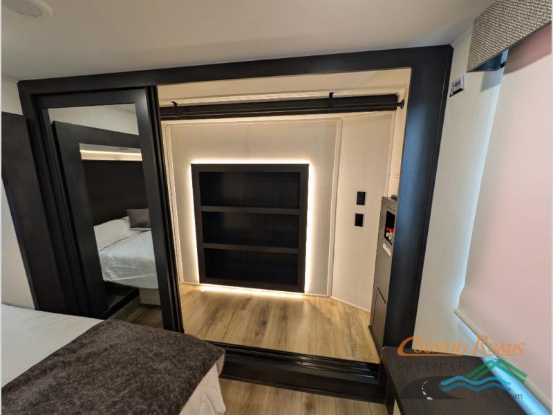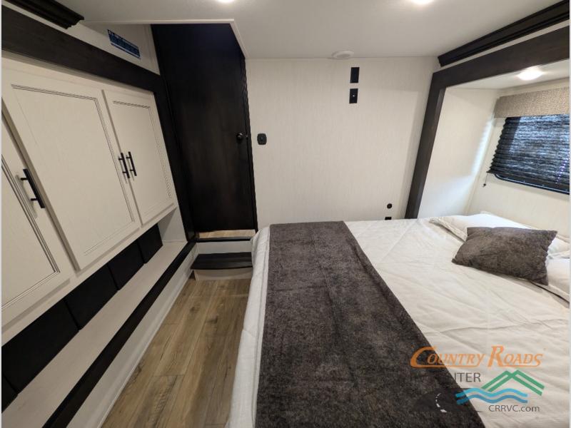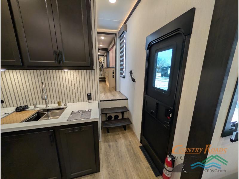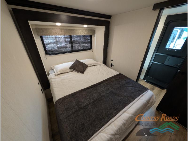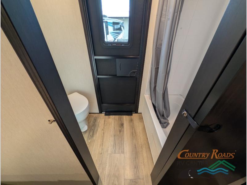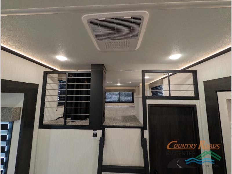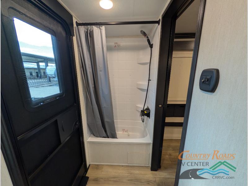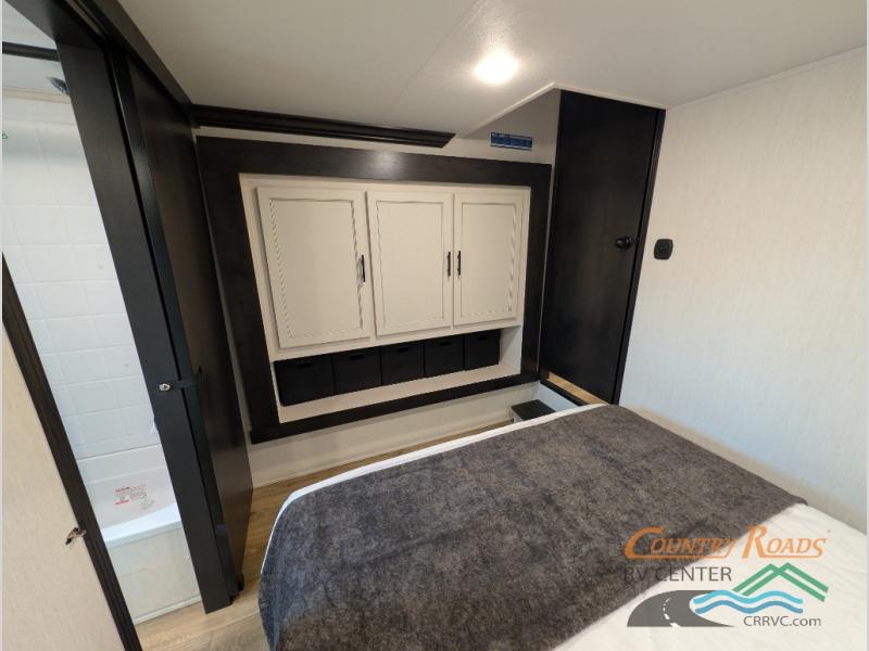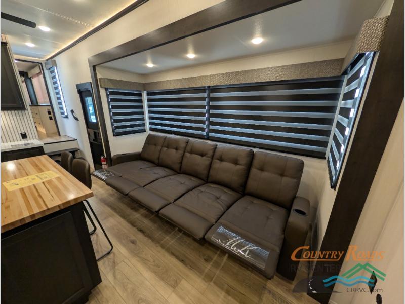 Are you looking for a fifth wheel where you can bring along your neighbor friends? You can do just that since there are two bedrooms in this unit, one of which includes a master bath with its own exterior entry door! The front bedroom is right next to the second full bath for convenience, and includes a camper king bed slide, a dresser, and front wardrobe. The rear master bedroom has a queen bed slide out across from a second slide for more floor space, and there is a loft above this room for more sleeping or storage space. Everyone can meet in the middle kitchen and living room since there are recliners, a ceiling fan, and kitchen island with four chairs. There is also storage below the island for kitchen necessities, and the hidden pantry behind the TV will be perfect for snacks, board games and more!