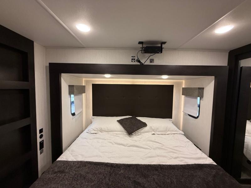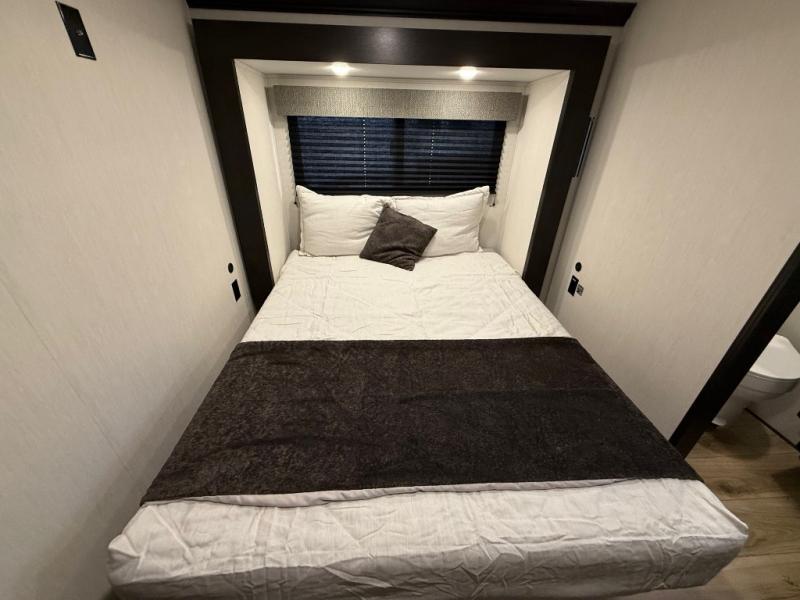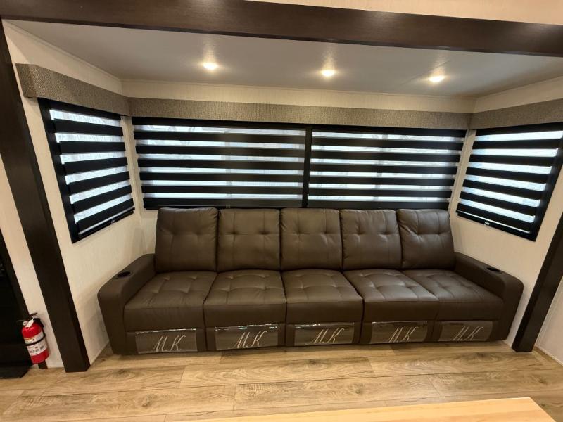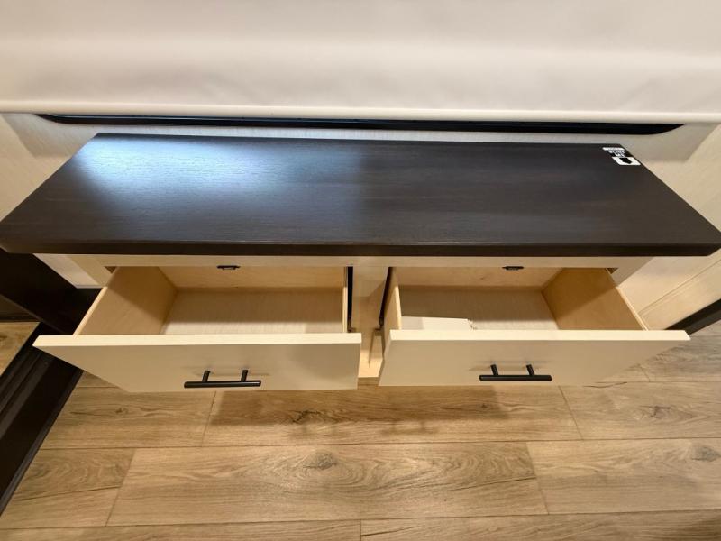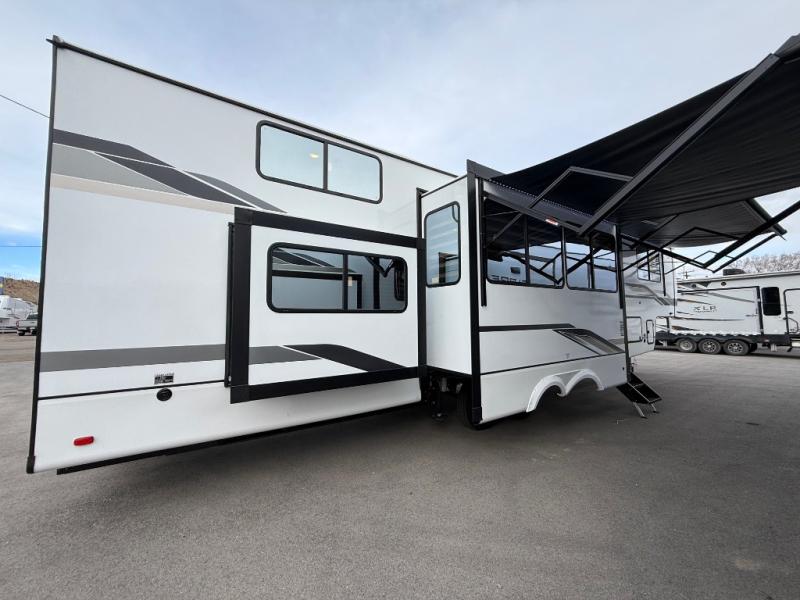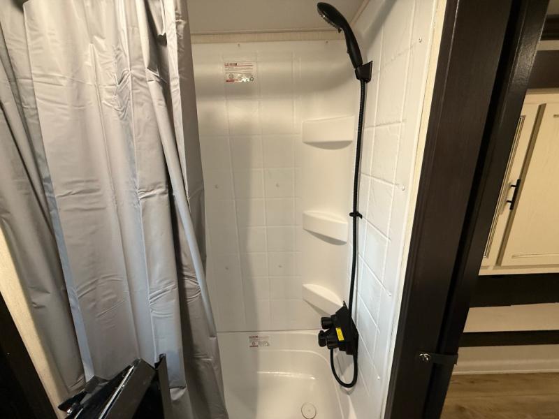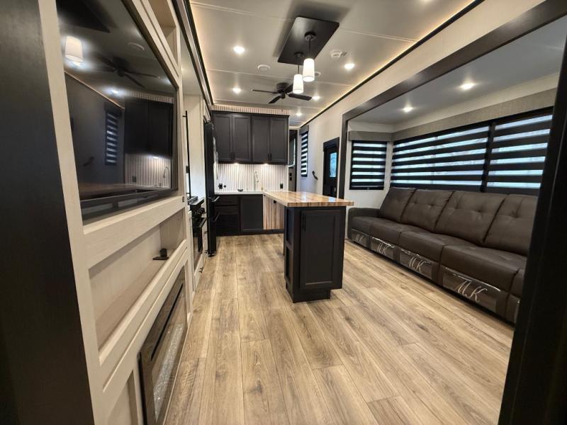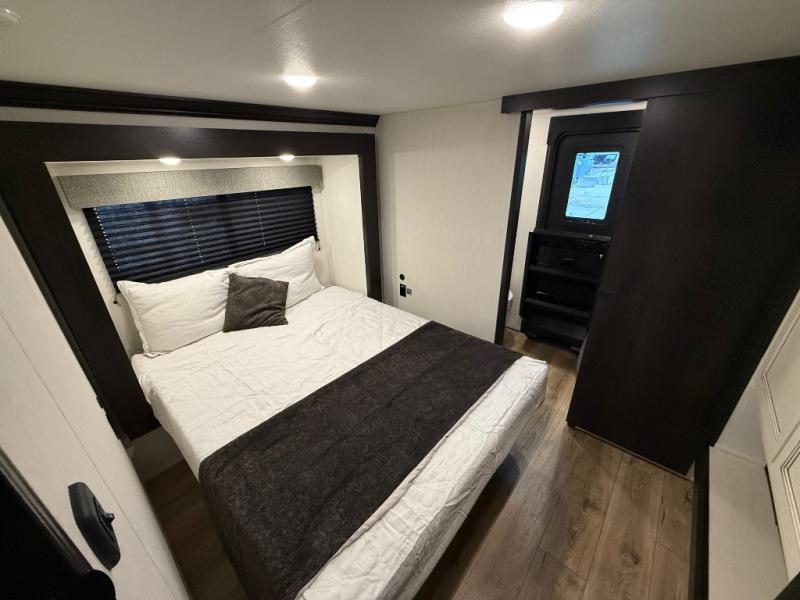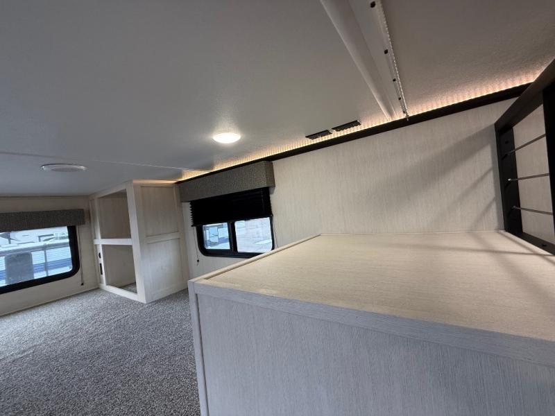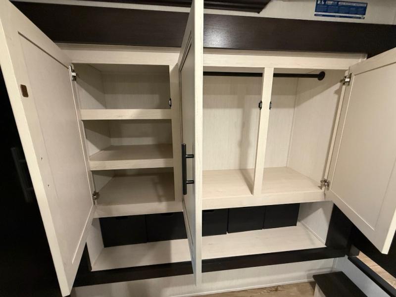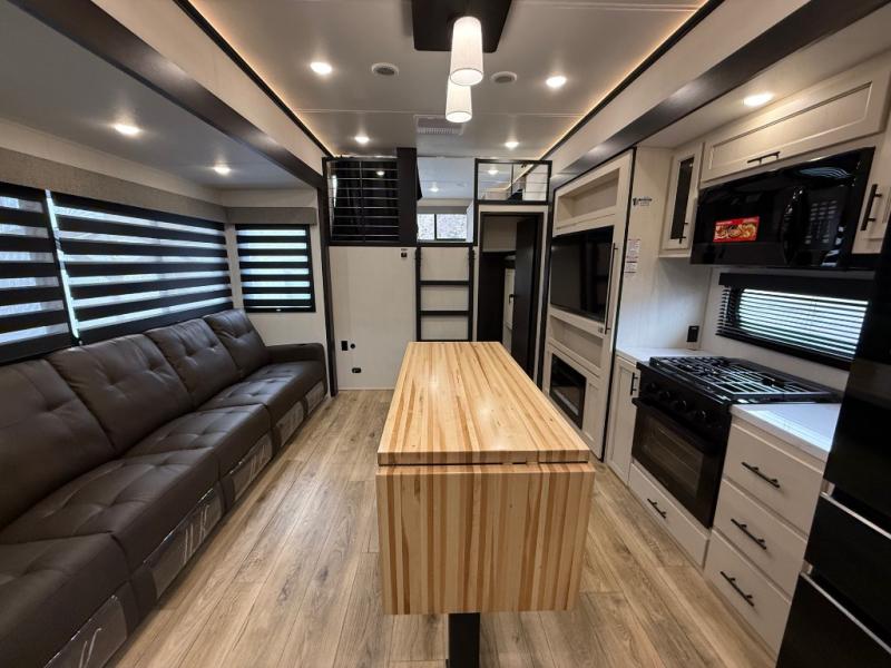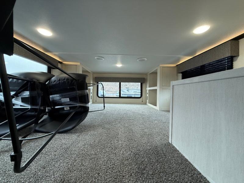 Are you looking for a fifth wheel where you can bring along your neighbor friends? You can do just that since there are two bedrooms in this unit, one of which includes a master bath with its own exterior entry door! The front bedroom is right next to the second full bath for convenience, and includes a camper king bed slide, a dresser, and front wardrobe. The rear master bedroom has a queen bed slide out across from a second slide for more floor space, and there is a loft above this room for more sleeping or storage space. Everyone can meet in the middle kitchen and living room since there are recliners, a ceiling fan, and kitchen island with four chairs. There is also storage below the island for kitchen necessities, and the hidden pantry behind the TV will be perfect for snacks, board games and more!