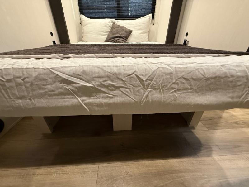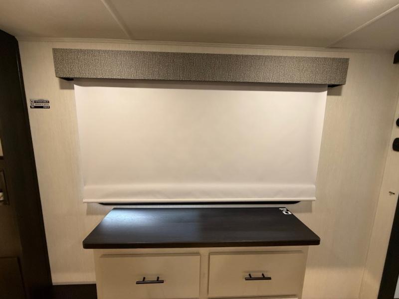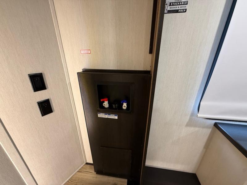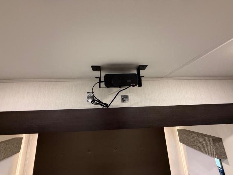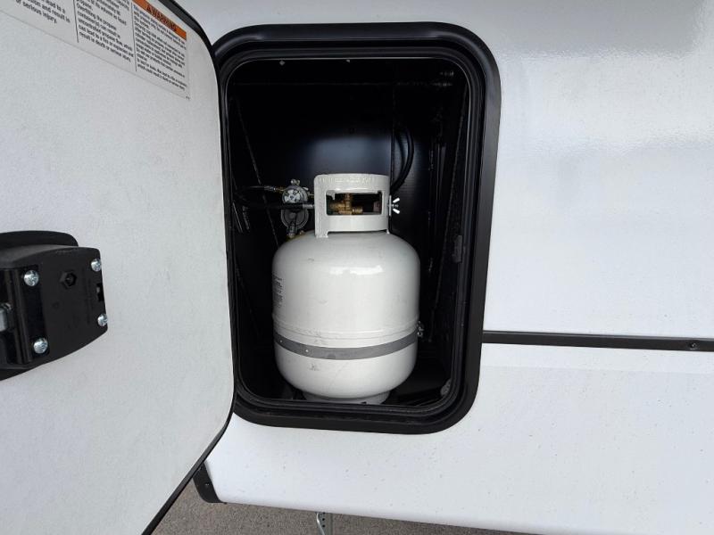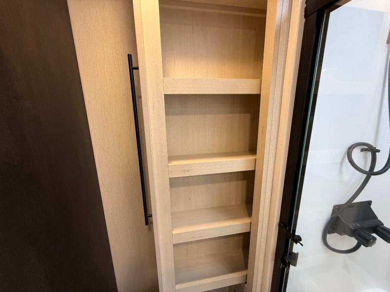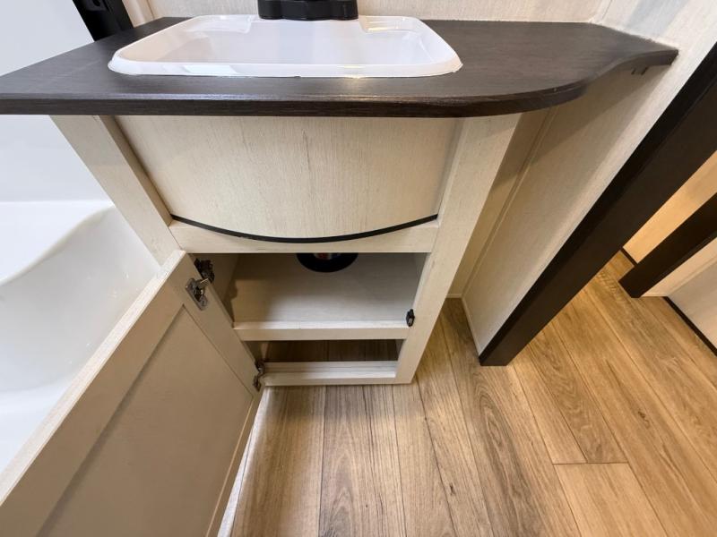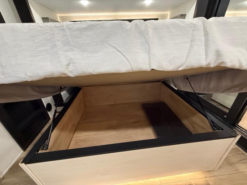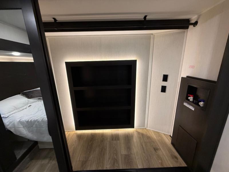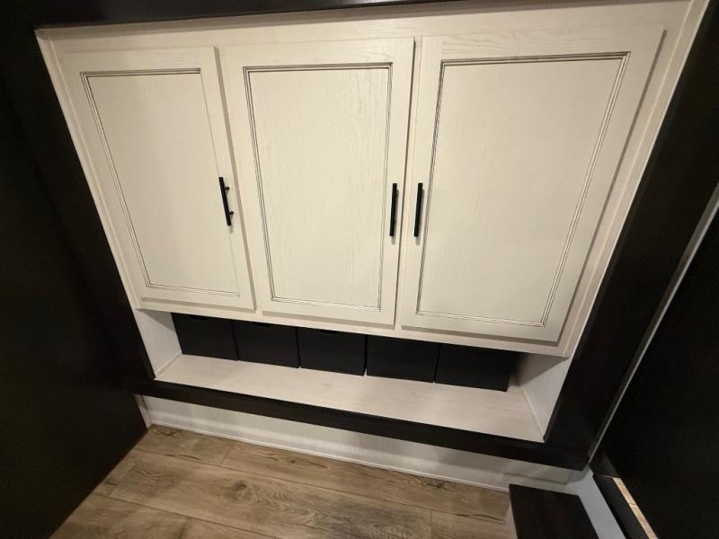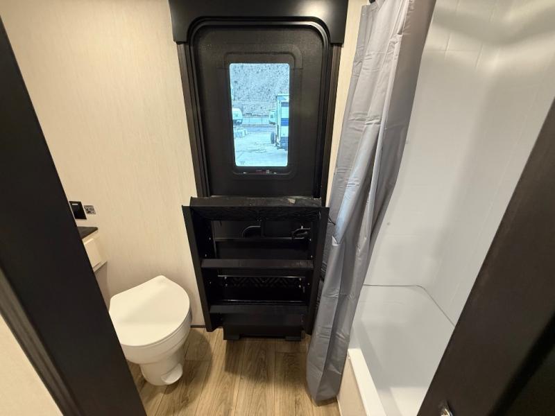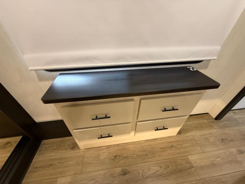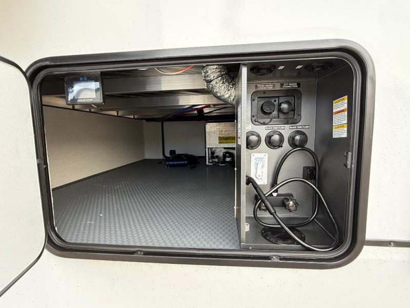 Are you looking for a fifth wheel where you can bring along your neighbor friends? You can do just that since there are two bedrooms in this unit, one of which includes a master bath with its own exterior entry door! The front bedroom is right next to the second full bath for convenience, and includes a camper king bed slide, a dresser, and front wardrobe. The rear master bedroom has a queen bed slide out across from a second slide for more floor space, and there is a loft above this room for more sleeping or storage space. Everyone can meet in the middle kitchen and living room since there are recliners, a ceiling fan, and kitchen island with four chairs. There is also storage below the island for kitchen necessities, and the hidden pantry behind the TV will be perfect for snacks, board games and more!