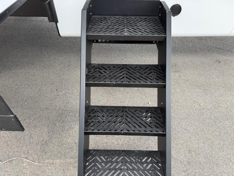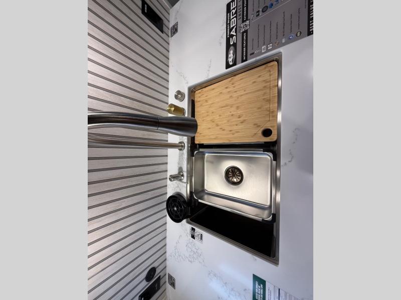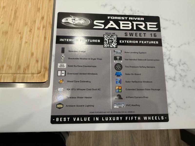 You will experience luxurious camping trips at an affordable price with any one of these Forest River Cherokee Sabre fifth wheels! These models are durable and ready to travel anytime of the year thanks to features like the high-gloss gel-coat front cap with LED lighting, the PVC roof membrane, and the forced air underbelly with enclosed gate valves. The electric auto-leveling system makes setting up easy and safe, and the adjustable power awning with LED lighting will create an inviting outdoor living space. Each model includes a universal docking station which includes a black tank flush and an outside shower, and adjustable stable steps for you to enter and exit the unit safely. Inside, you will love the design of the ambient accent lighting in the living area, the real wood lumbercore cabinetry, and the linoleum flooring!