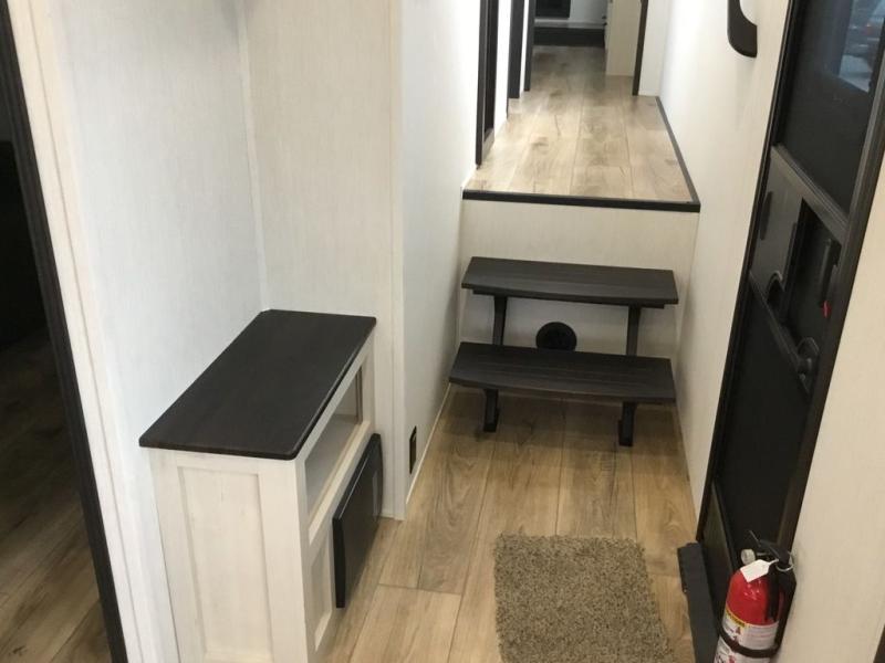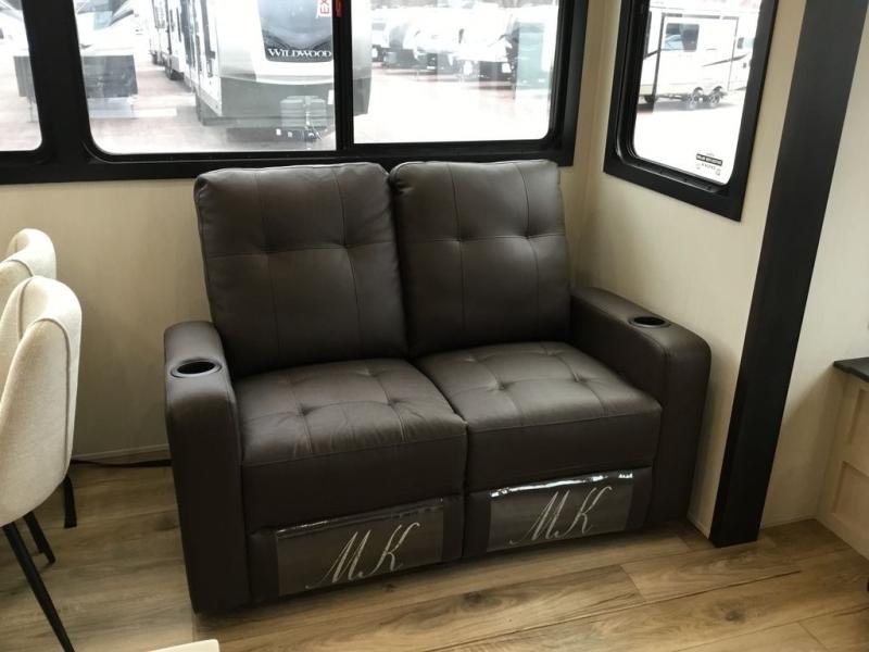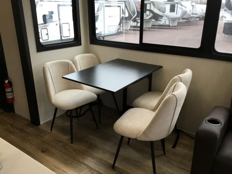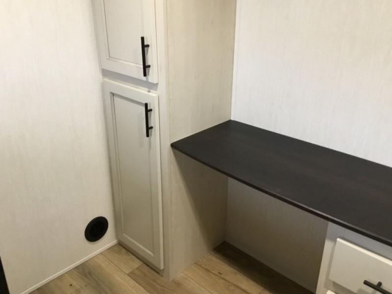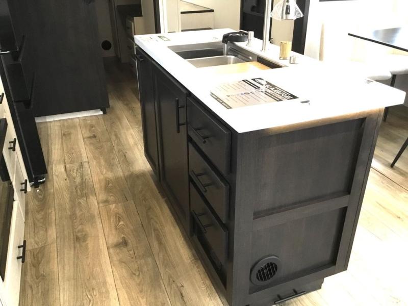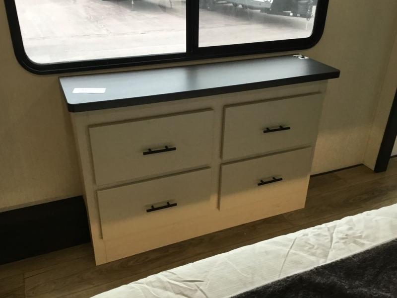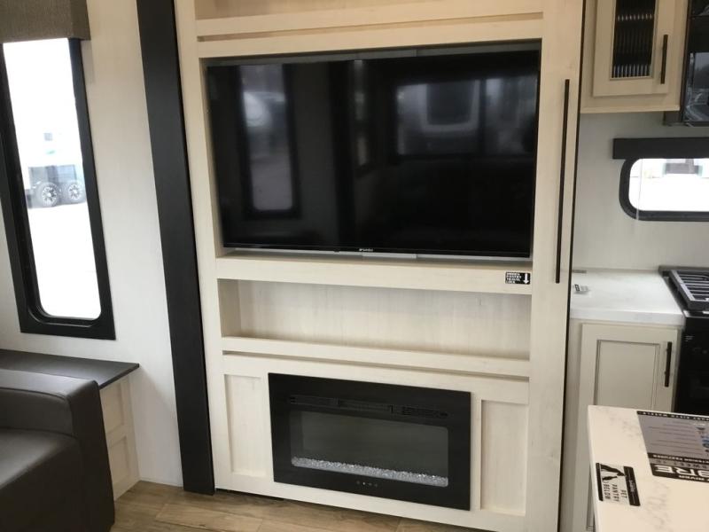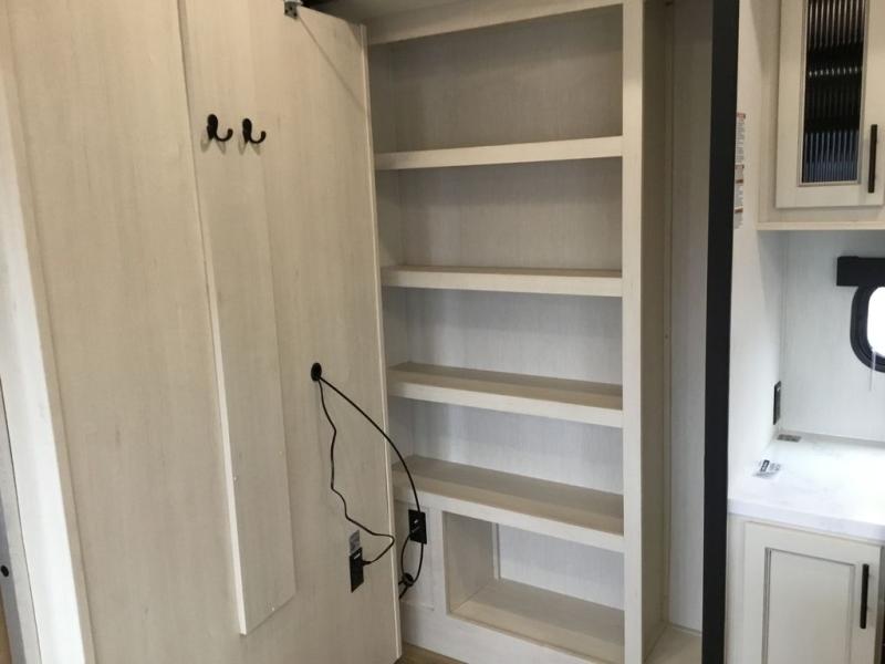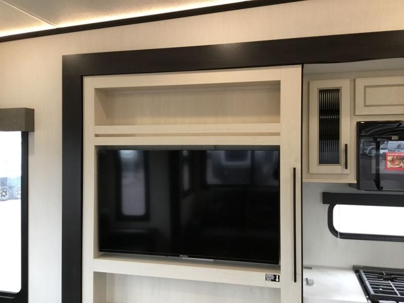 There is much to love in this fifth wheel! Starting with the second bedroom which has a slide that houses a flip-up bunk above a tri-fold sofa across from a desk with drawers, a drop zone, and a wardrobe, plus above all of that is a storage/bunk loft. The rear living area includes a tri-fold sofa, a TV with a hidden pantry behind, and theater seating for two making this space another area at night for guests. In the morning, you can prepare breakfast on the kitchen island, then dine together at the versatile dinette/desk. The full bath will allow you to stay clean throughout your trip, and you'll feel right at home in the front private bedroom with a camper king bed, a dresser, and front wardrobe. Outside, a kitchen and two power awnings create an inviting space!