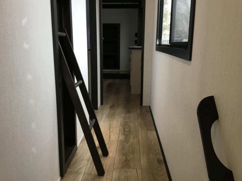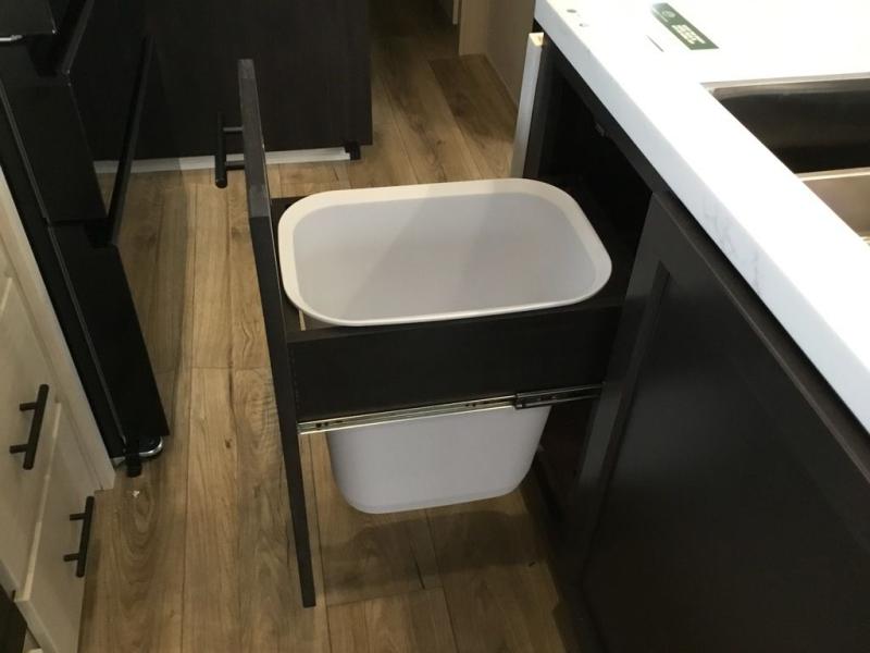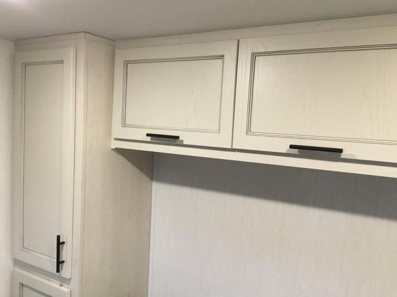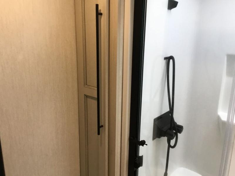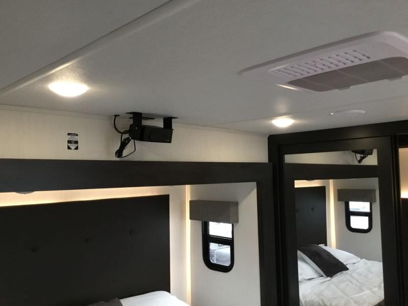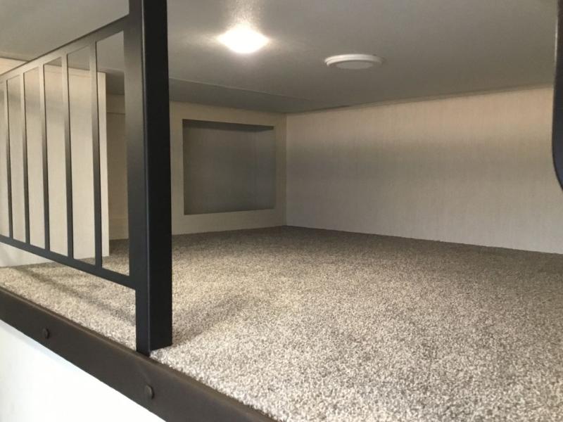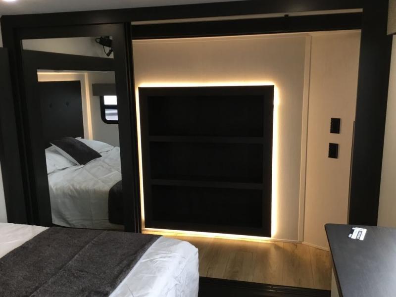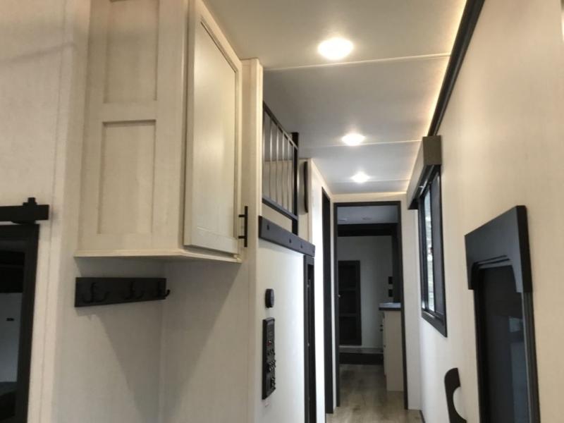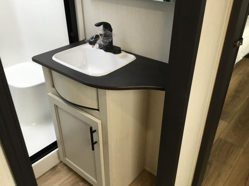 There is much to love in this fifth wheel! Starting with the second bedroom which has a slide that houses a flip-up bunk above a tri-fold sofa across from a desk with drawers, a drop zone, and a wardrobe, plus above all of that is a storage/bunk loft. The rear living area includes a tri-fold sofa, a TV with a hidden pantry behind, and theater seating for two making this space another area at night for guests. In the morning, you can prepare breakfast on the kitchen island, then dine together at the versatile dinette/desk. The full bath will allow you to stay clean throughout your trip, and you'll feel right at home in the front private bedroom with a camper king bed, a dresser, and front wardrobe. Outside, a kitchen and two power awnings create an inviting space!