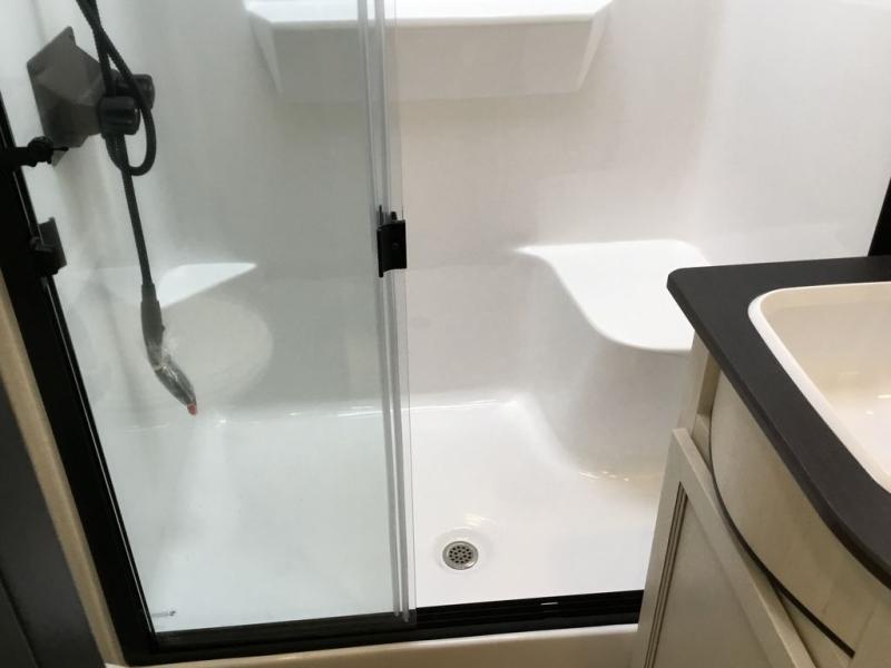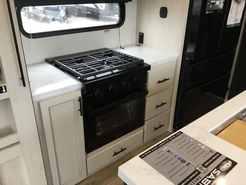 You will experience luxurious camping trips at an affordable price with any one of these Forest River Cherokee Sabre fifth wheels! These models are durable and ready to travel anytime of the year thanks to features like the high-gloss gel-coat front cap with LED lighting, the PVC roof membrane, and the forced air underbelly with enclosed gate valves. The electric auto-leveling system makes setting up easy and safe, and the adjustable power awning with LED lighting will create an inviting outdoor living space. Each model includes a universal docking station which includes a black tank flush and an outside shower, and adjustable stable steps for you to enter and exit the unit safely. Inside, you will love the design of the ambient accent lighting in the living area, the real wood lumbercore cabinetry, and the linoleum flooring!