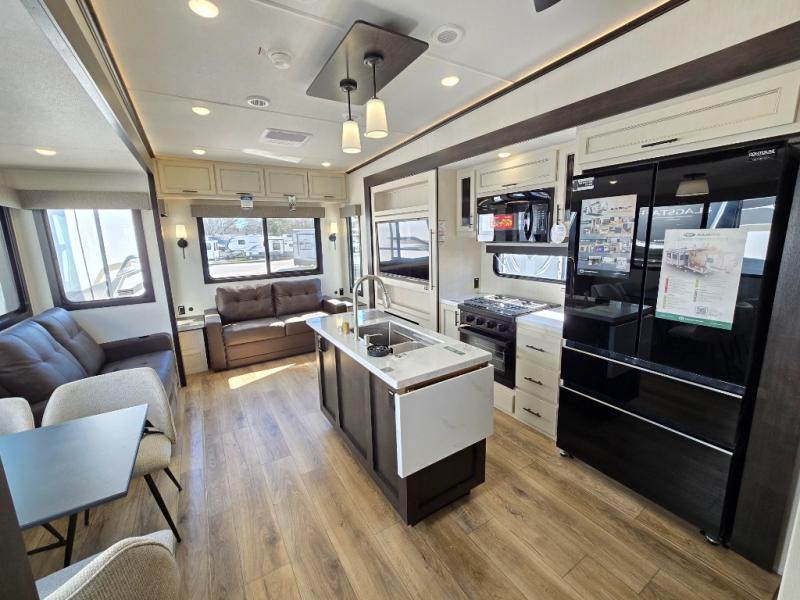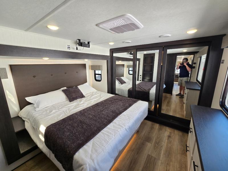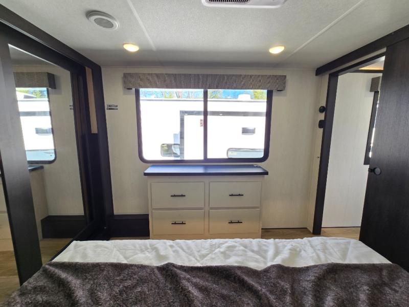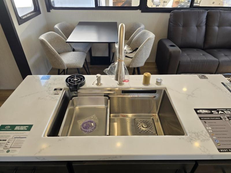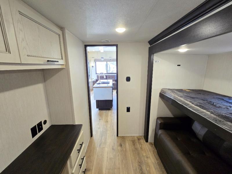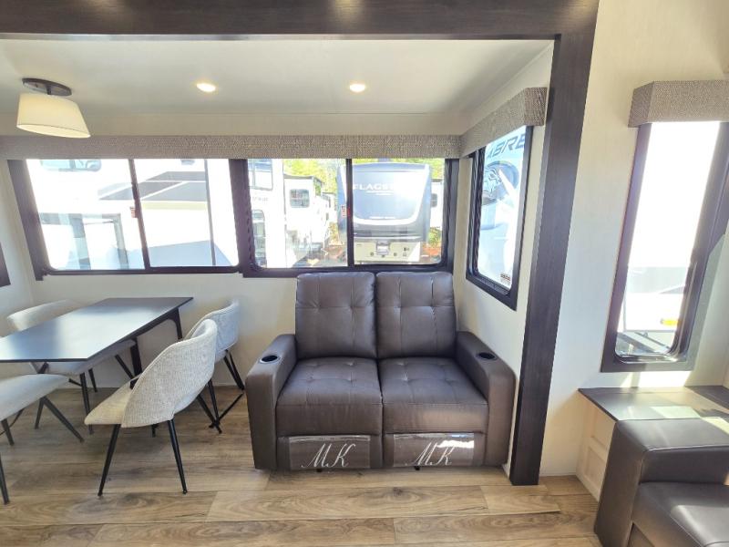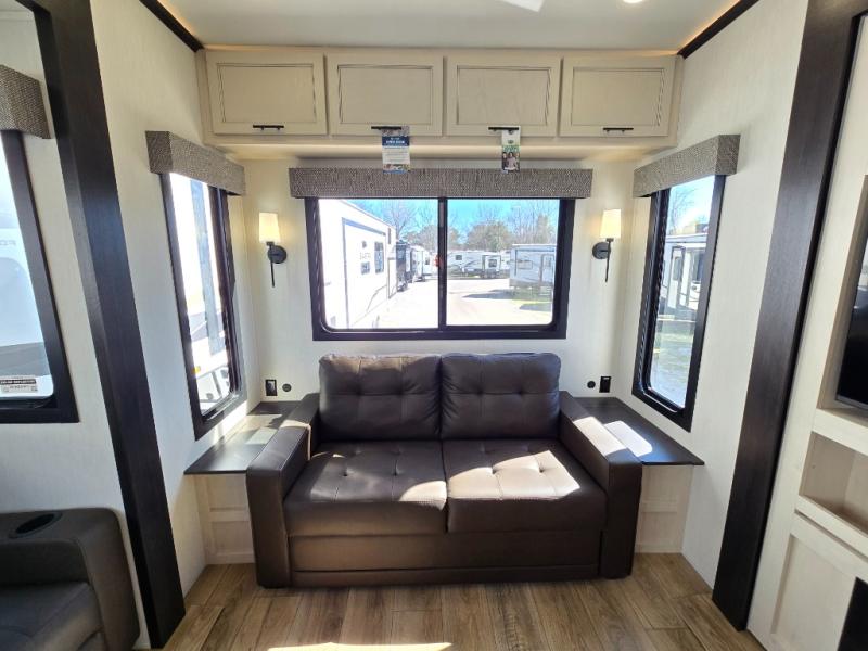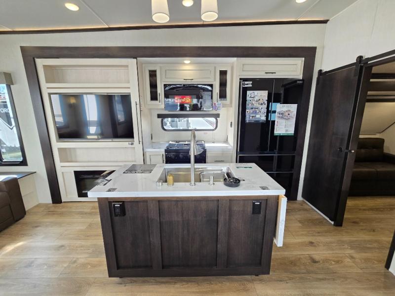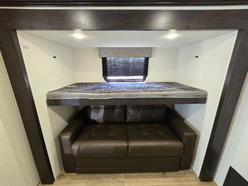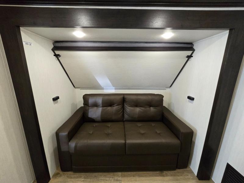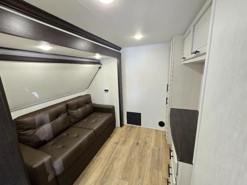 There is much to love in this fifth wheel! Starting with the second bedroom which has a slide that houses a flip-up bunk above a tri-fold sofa across from a desk with drawers, a drop zone, and a wardrobe, plus above all of that is a storage/bunk loft. The rear living area includes a tri-fold sofa, a TV with a hidden pantry behind, and theater seating for two making this space another area at night for guests. In the morning, you can prepare breakfast on the kitchen island, then dine together at the versatile dinette/desk. The full bath will allow you to stay clean throughout your trip, and you'll feel right at home in the front private bedroom with a camper king bed, a dresser, and front wardrobe. Outside, a kitchen and two power awnings create an inviting space!