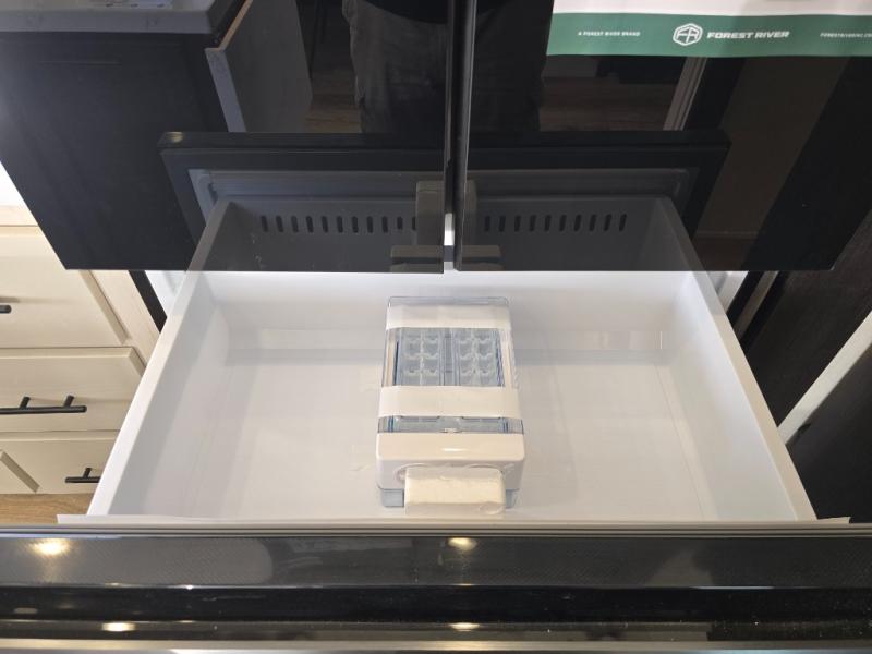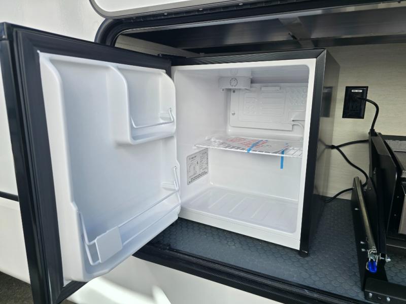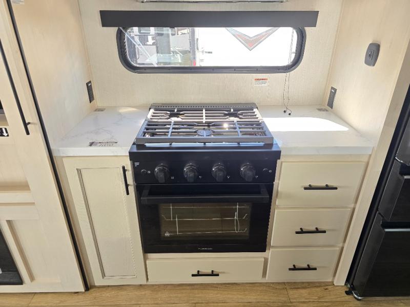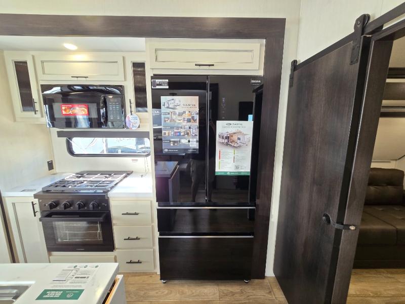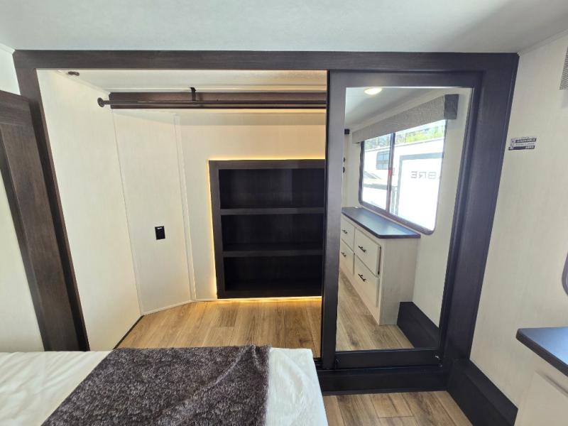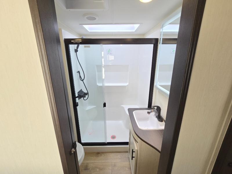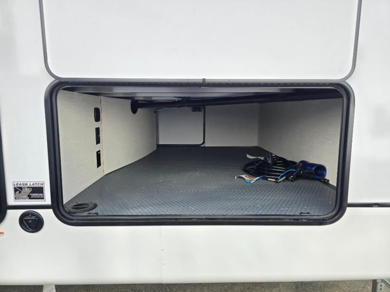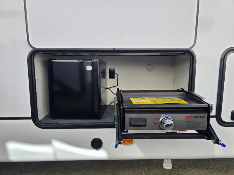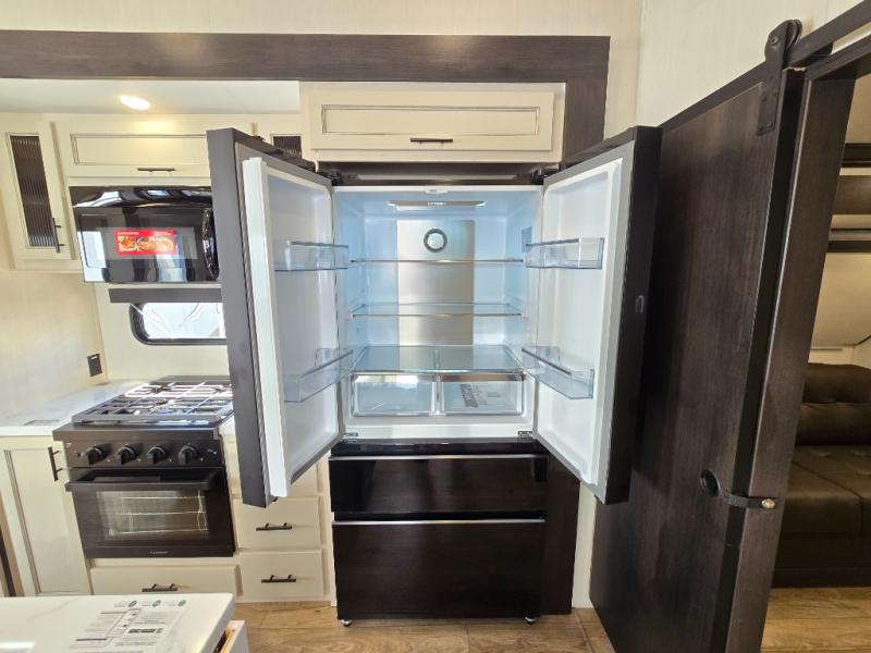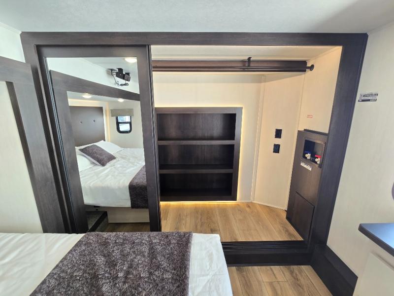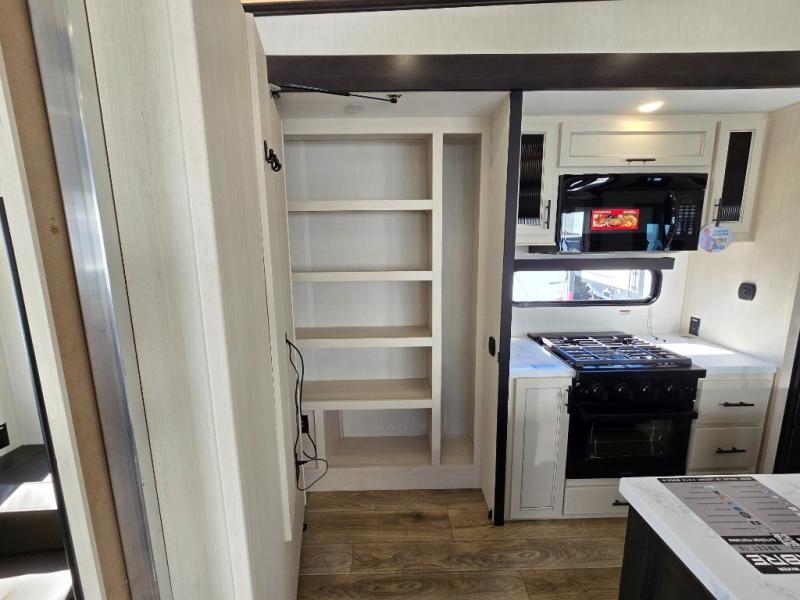 There is much to love in this fifth wheel! Starting with the second bedroom which has a slide that houses a flip-up bunk above a tri-fold sofa across from a desk with drawers, a drop zone, and a wardrobe, plus above all of that is a storage/bunk loft. The rear living area includes a tri-fold sofa, a TV with a hidden pantry behind, and theater seating for two making this space another area at night for guests. In the morning, you can prepare breakfast on the kitchen island, then dine together at the versatile dinette/desk. The full bath will allow you to stay clean throughout your trip, and you'll feel right at home in the front private bedroom with a camper king bed, a dresser, and front wardrobe. Outside, a kitchen and two power awnings create an inviting space!
