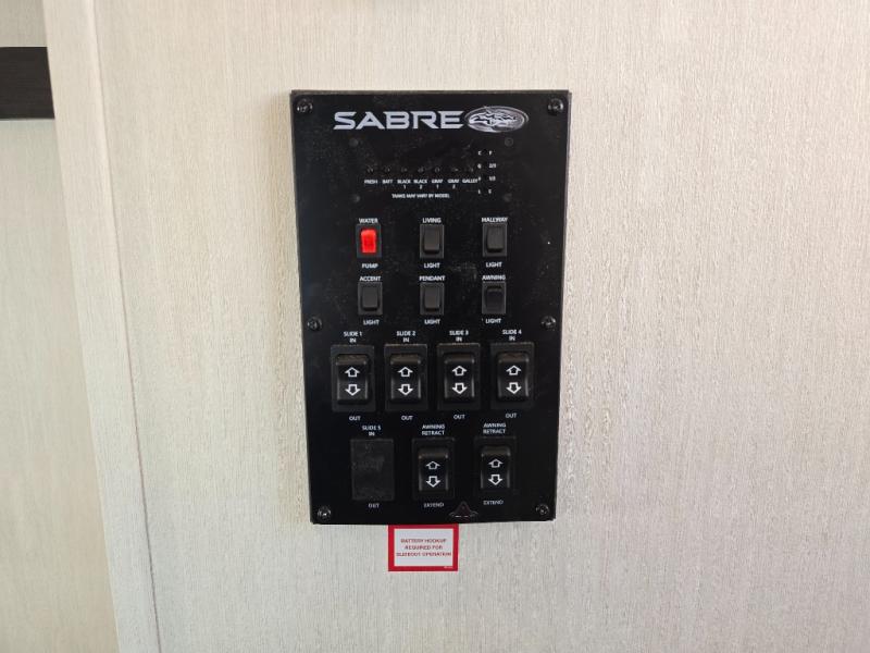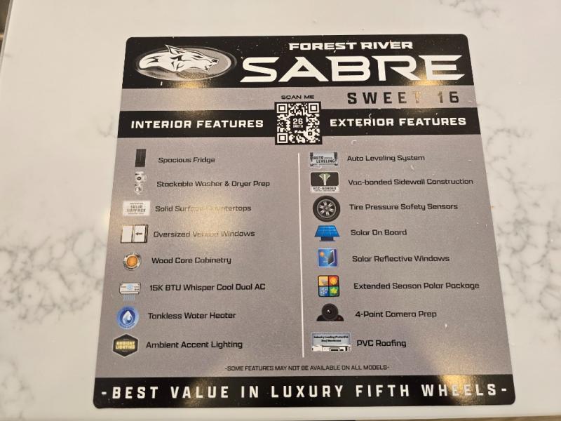 You will experience luxurious camping trips at an affordable price with any one of these Forest River Cherokee Sabre fifth wheels! These models are durable and ready to travel anytime of the year thanks to features like the high-gloss gel-coat front cap with LED lighting, the PVC roof membrane, and the forced air underbelly with enclosed gate valves. The electric auto-leveling system makes setting up easy and safe, and the adjustable power awning with LED lighting will create an inviting outdoor living space. Each model includes a universal docking station which includes a black tank flush and an outside shower, and adjustable stable steps for you to enter and exit the unit safely. Inside, you will love the design of the ambient accent lighting in the living area, the real wood lumbercore cabinetry, and the linoleum flooring!
