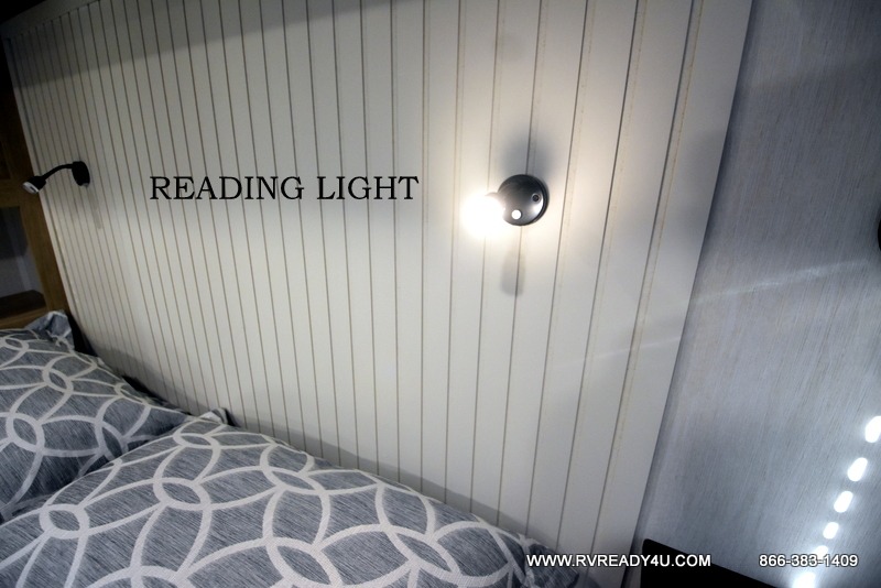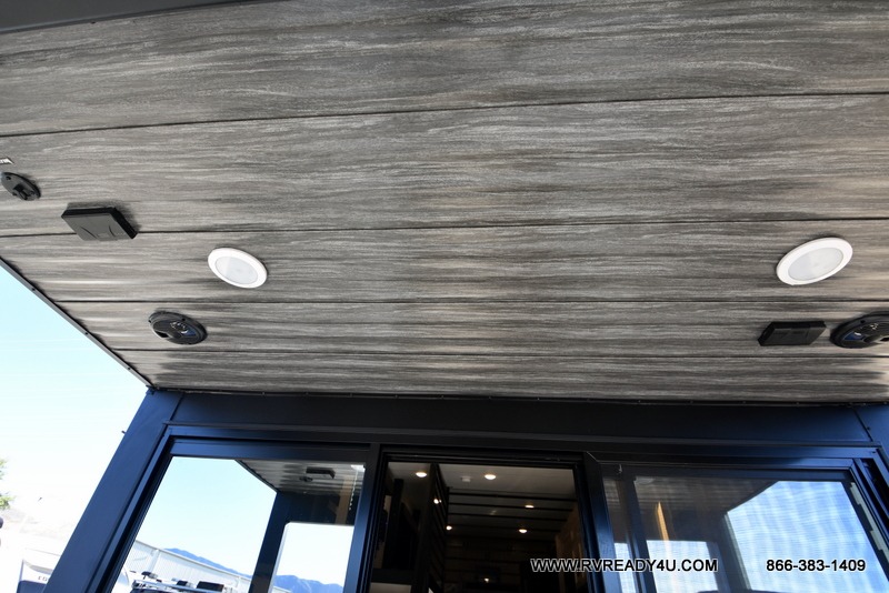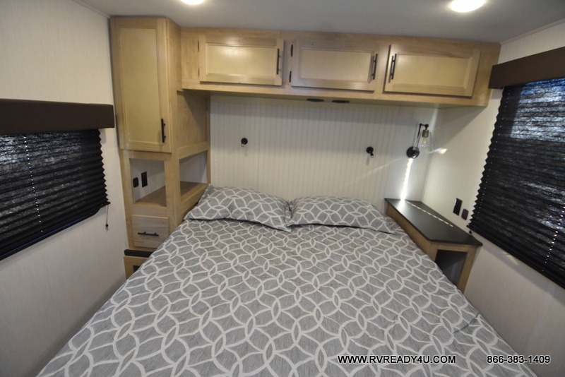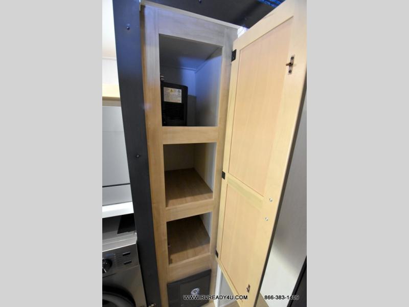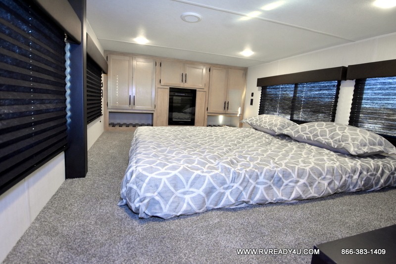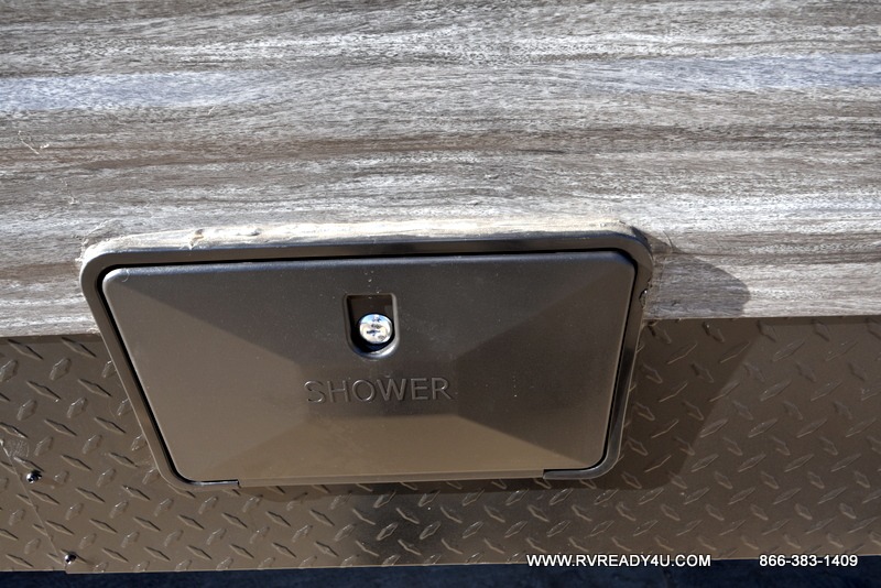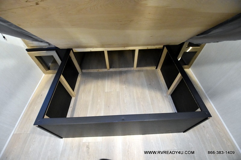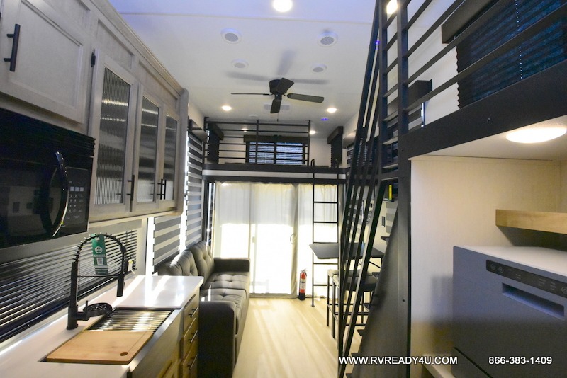 This model is similar to 16ML but larger! A bigger bathroom, RV king bed in the lower master, and a queen bed plus a twin bunk mat in the front loft. And the second loft can be utilized as extra sleeping space or storage space! There is an 18 cu. ft. refrigerator so you can stock up for a week long vacation, a hide-a-bed sofa that can transform into added sleeping for guests, and a high top table with two stools to dine at. The bathroom below is split with a shower on one side, and a private toilet area and sink opposite. And the view is amazing from just about anywhere inside.