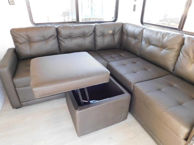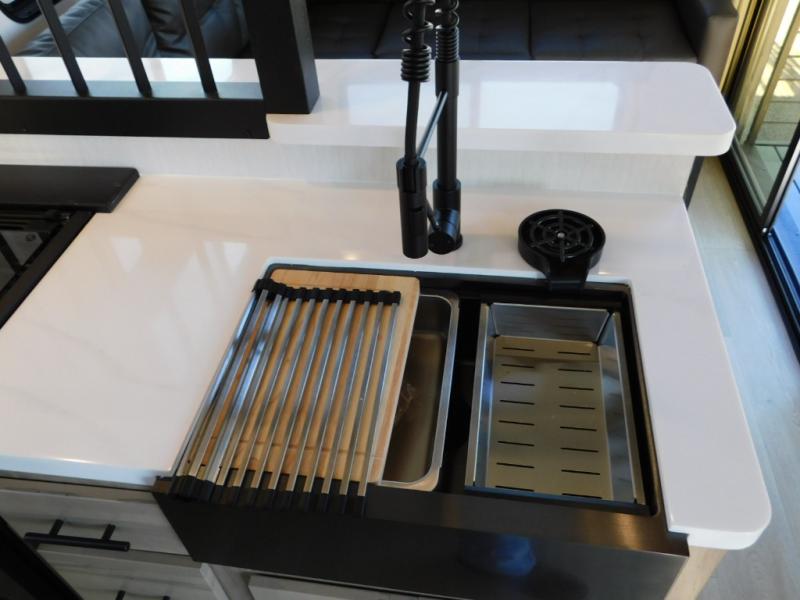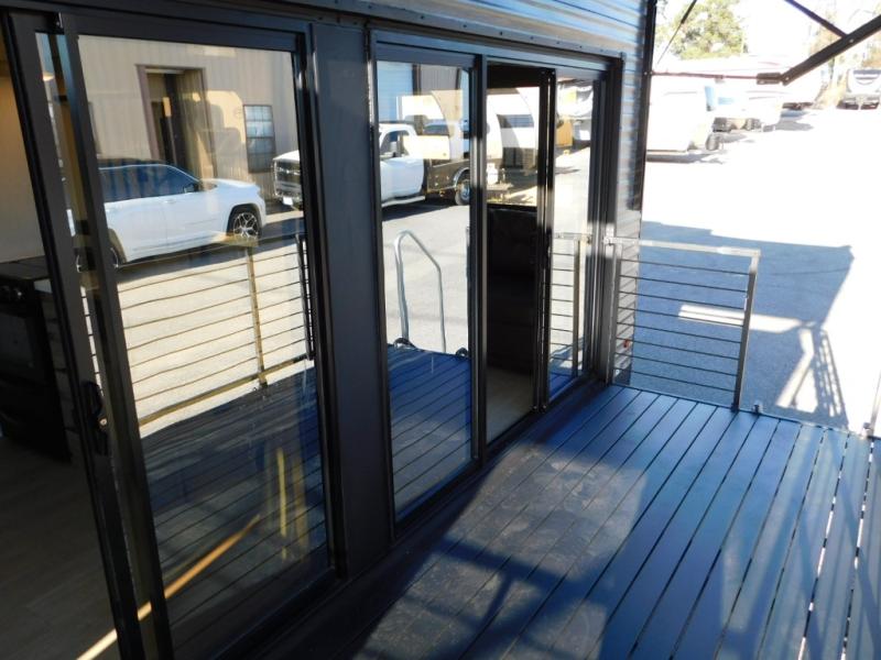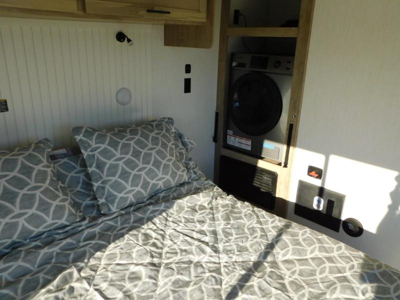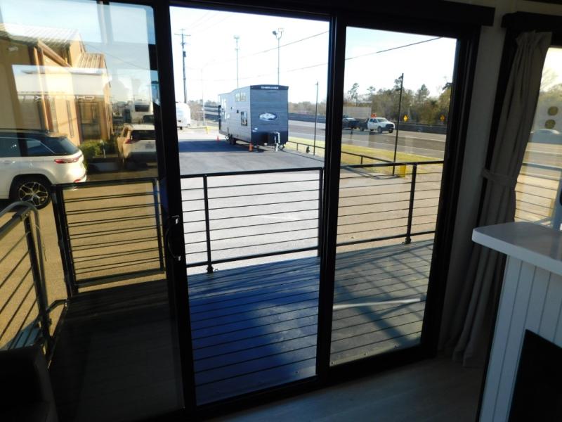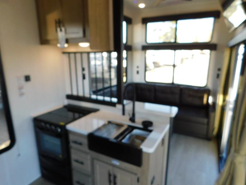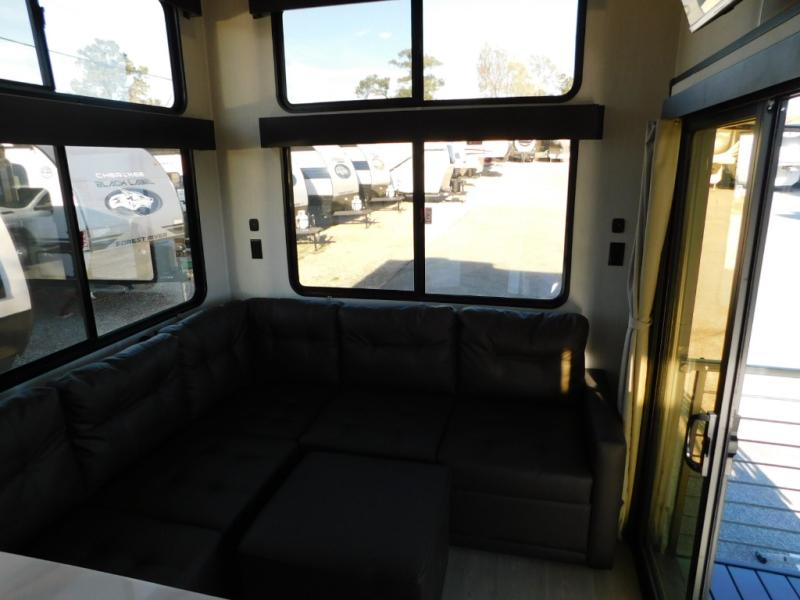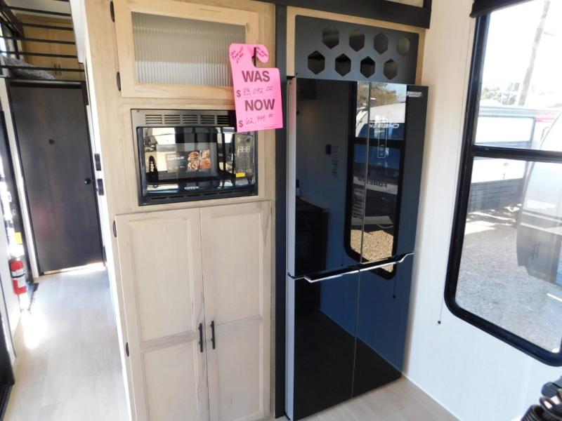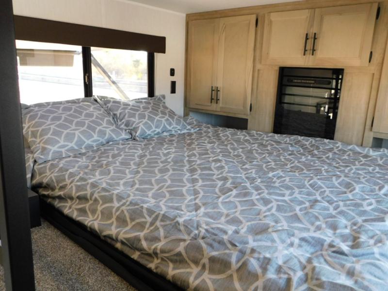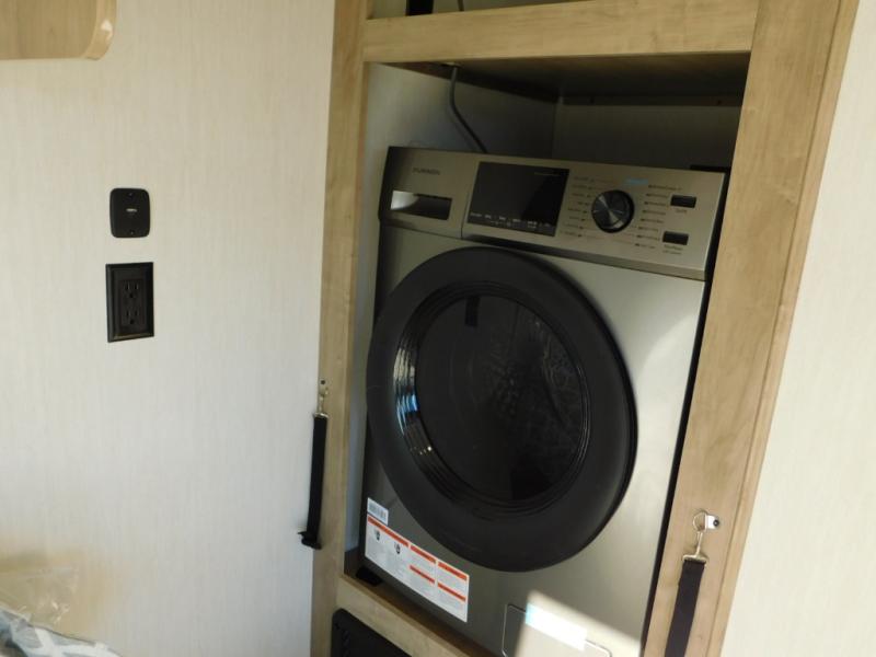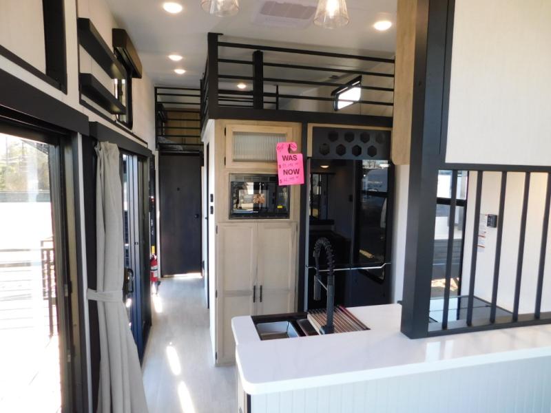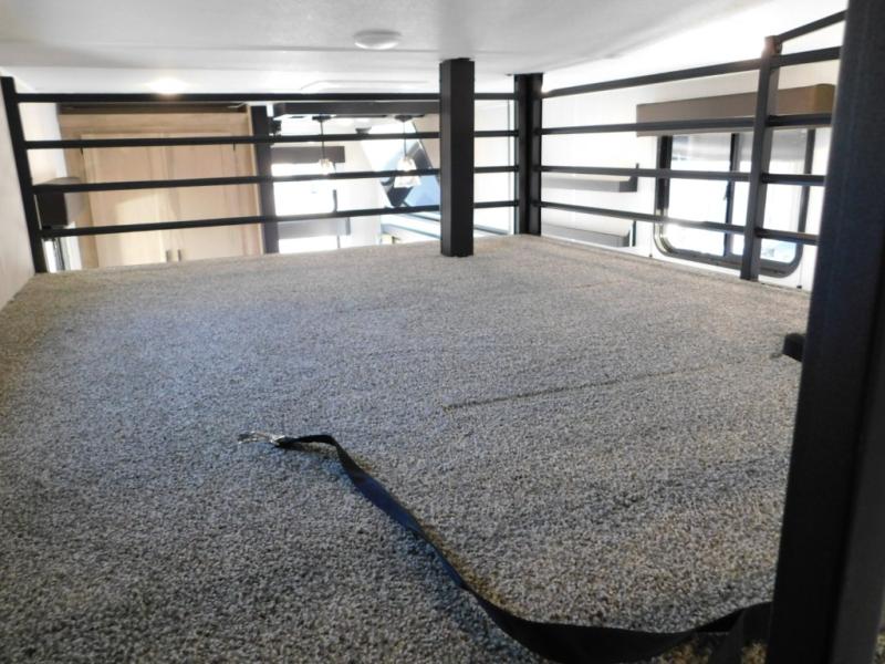 You'll feel right at home in this feature-packed destination trailer! The rear private bedroom features one of the dual entry doors, an RV king bed, and a side patio for great outdoor views! There is also a wardrobe with washer/dryer prep if you want the option to add these appliances. Above the bedroom, you'll find a loft with a queen bed, a fireplace and a storage cabinet to keep the space tidy. The chef of your group can whip up their best meals in the middle kitchen, and there is a spacious pantry to keep snacks stocked. Your crew can relax on the L-shaped sofa in the front living room, enjoy the fireplace and TV, or just take in the outdoor views provided by the huge side patio!