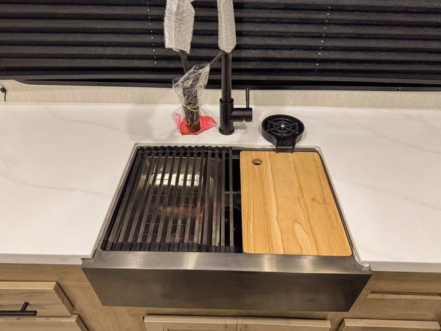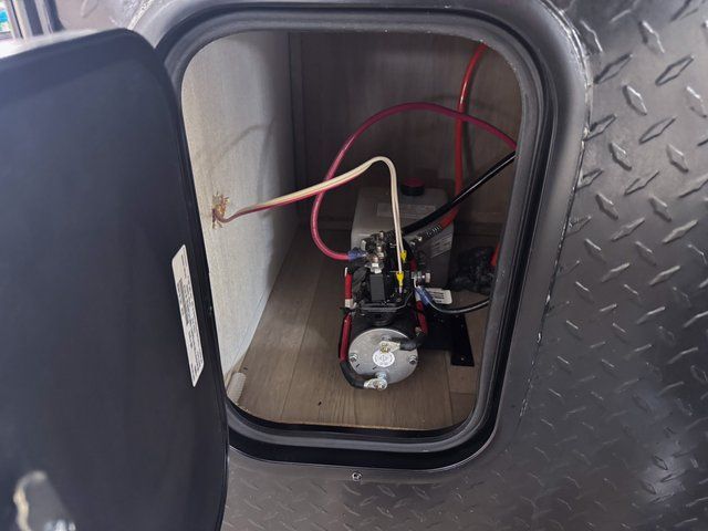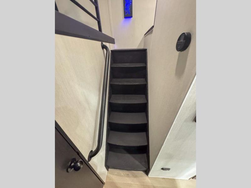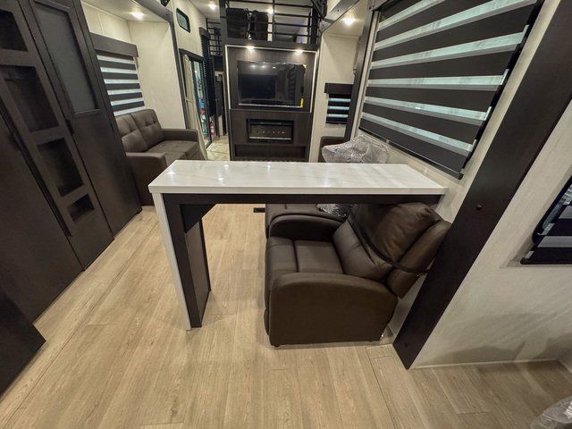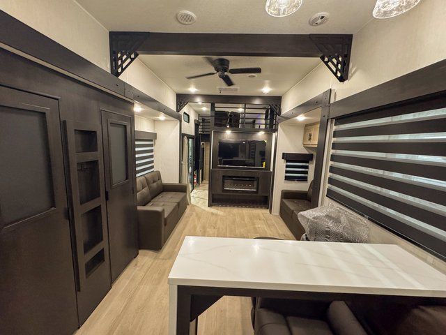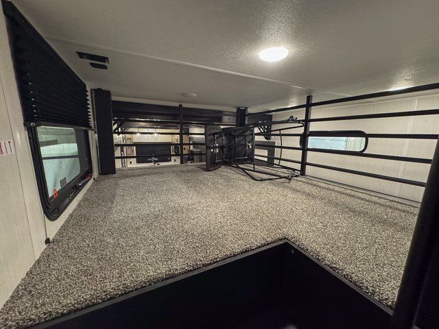 It won't be hard to find comfort in this front kitchen destination trailer! There is ample counter space to prep meals, a free-standing dinette with a slide out, plus a large pantry and 18 cu. ft. refrigerator for food storage. The bar top with stools overlooks the middle living area, where you'll also find dual hide-a-bed sofas and an entertainment center with a fireplace. The full bath includes a shower with a seat for more comfort, and one of the dual entry doors is right across from the bath so you can quickly get back outside. Head up the steps to the dual loft areas with two bunk mats and cabinets on one side, and an open area on the other, perfect for a play room or extra storage! And under the loft you'll find the rear private bedroom with a king bed slide, a wardrobe and an entertainment center, plus washer and dryer prep if you want to add these appliances!