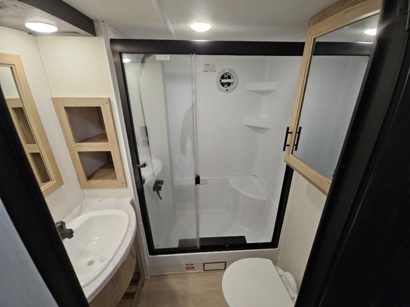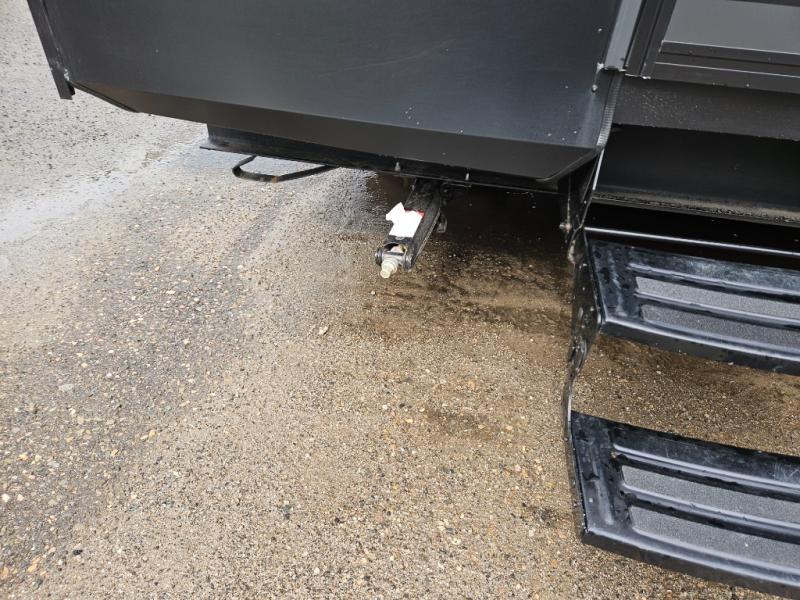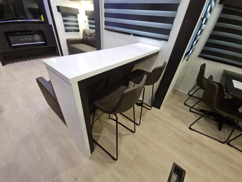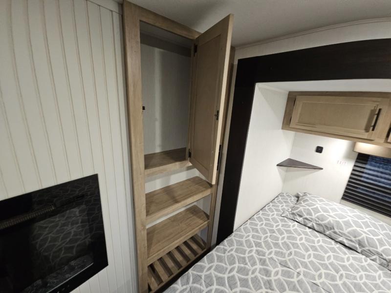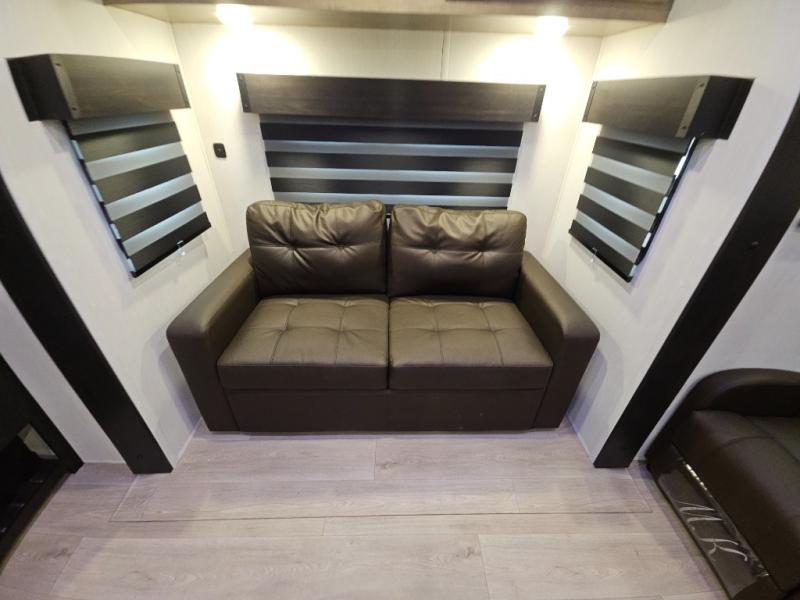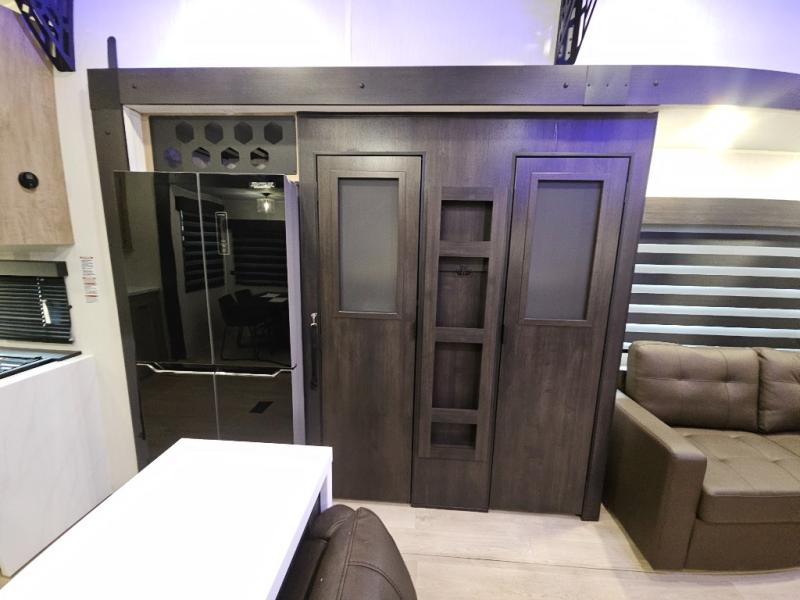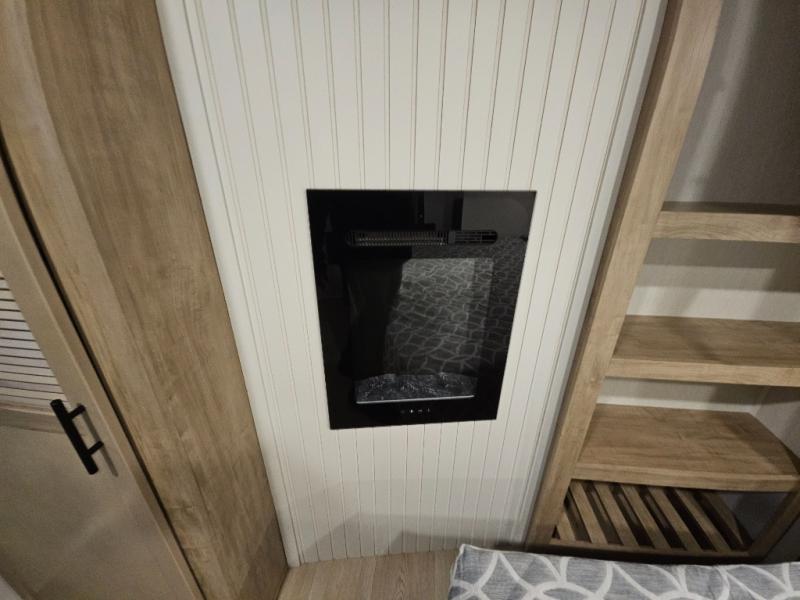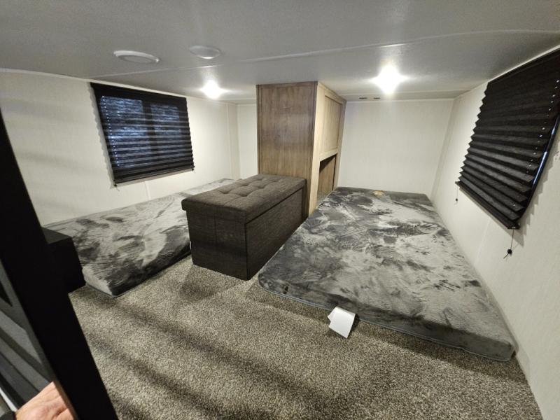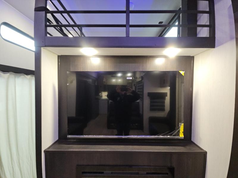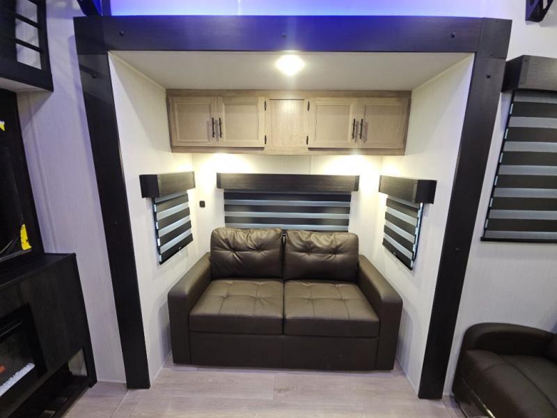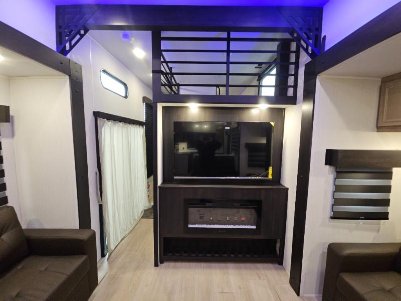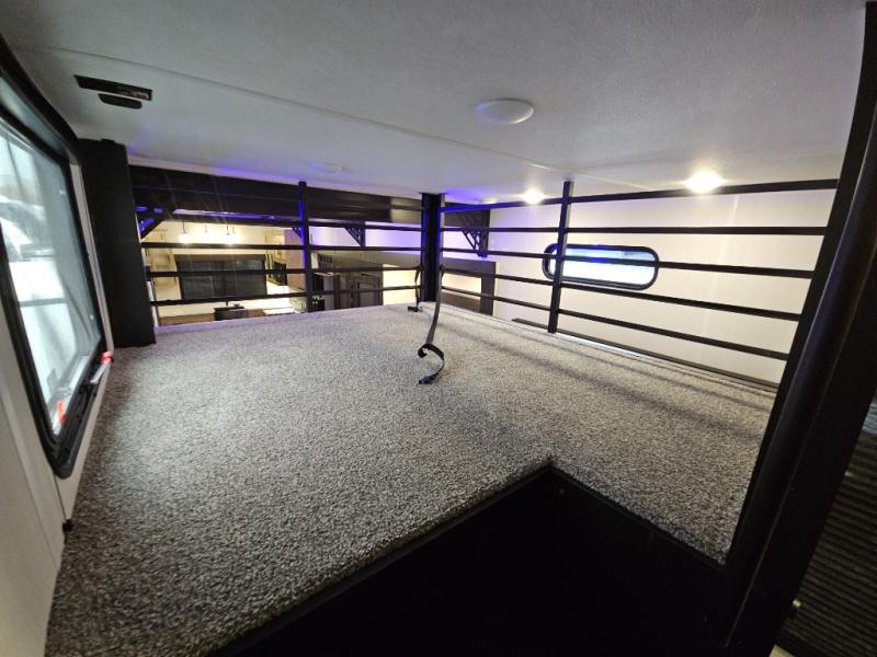 It won't be hard to find comfort in this front kitchen destination trailer! There is ample counter space to prep meals, a free-standing dinette with a slide out, plus a large pantry and 18 cu. ft. refrigerator for food storage. The bar top with stools overlooks the middle living area, where you'll also find dual hide-a-bed sofas and an entertainment center with a fireplace. The full bath includes a shower with a seat for more comfort, and one of the dual entry doors is right across from the bath so you can quickly get back outside. Head up the steps to the dual loft areas with two bunk mats and cabinets on one side, and an open area on the other, perfect for a play room or extra storage! And under the loft you'll find the rear private bedroom with a king bed slide, a wardrobe and an entertainment center, plus washer and dryer prep if you want to add these appliances!
