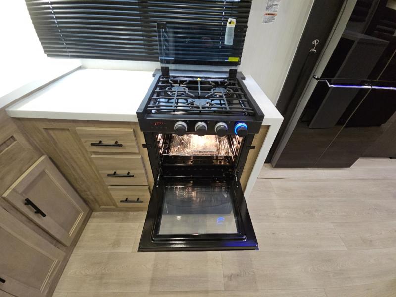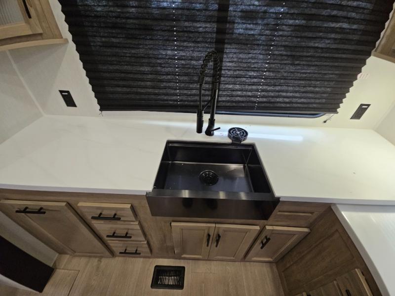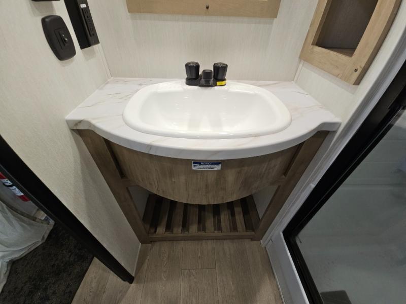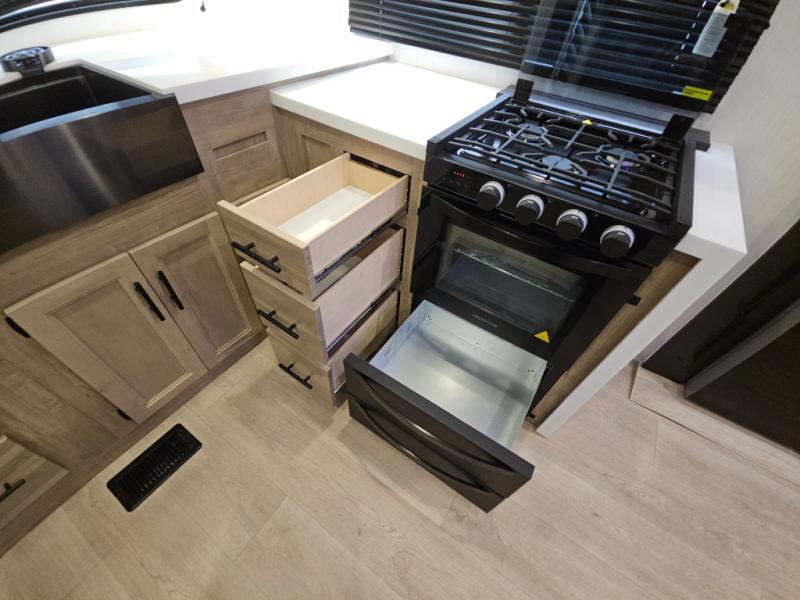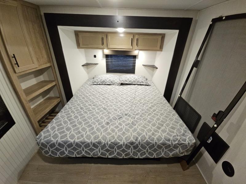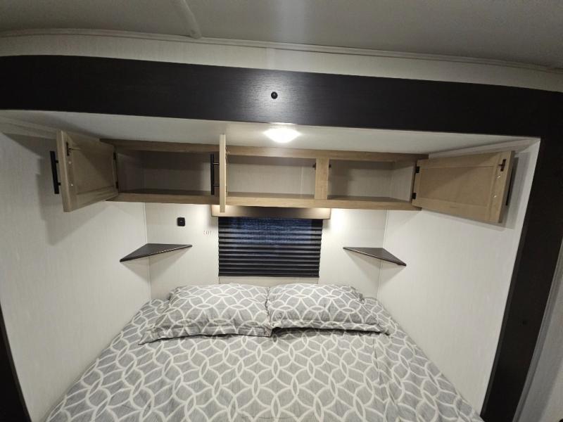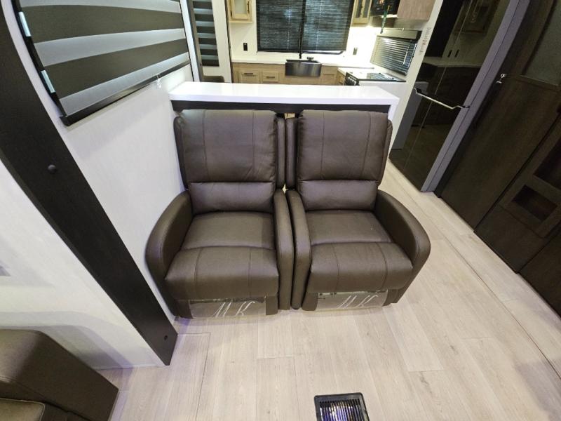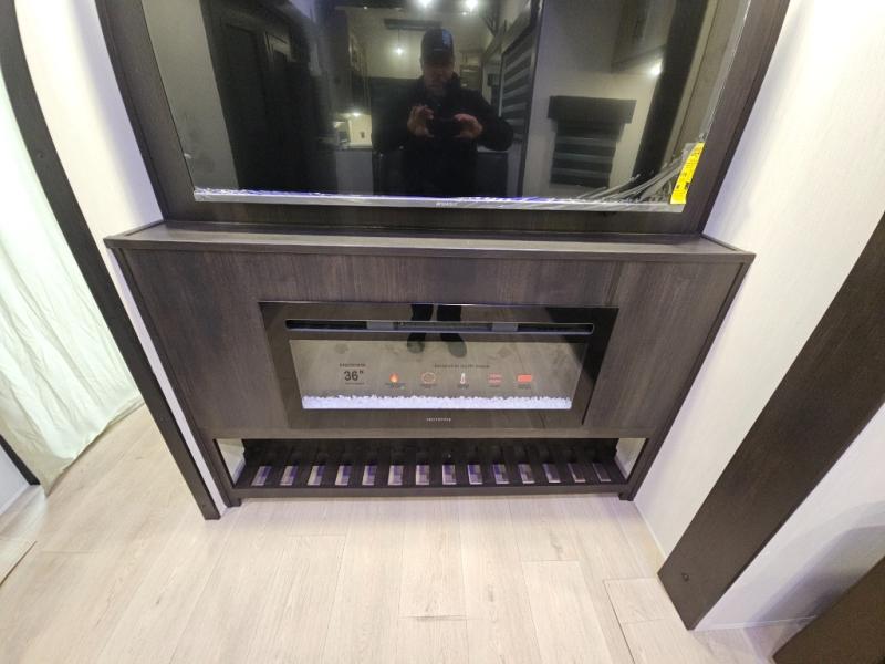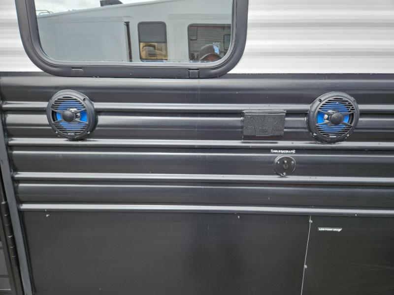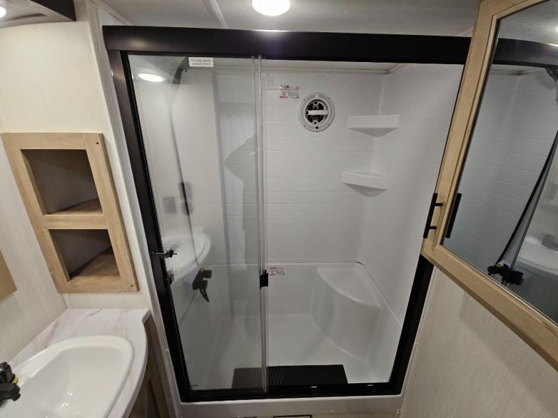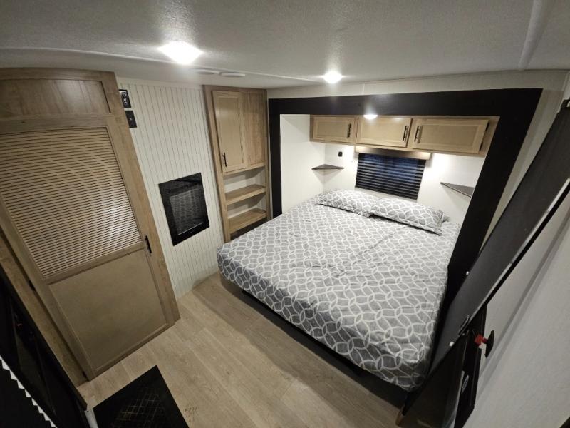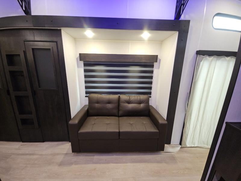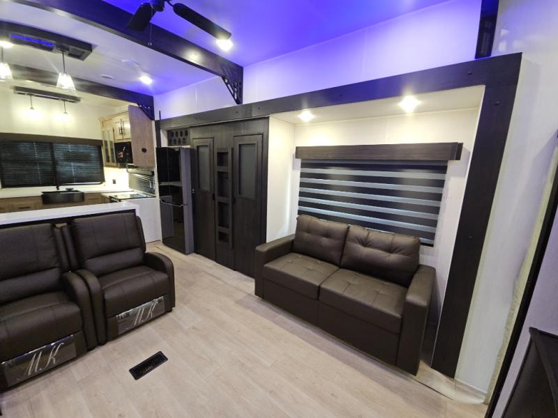 It won't be hard to find comfort in this front kitchen destination trailer! There is ample counter space to prep meals, a free-standing dinette with a slide out, plus a large pantry and 18 cu. ft. refrigerator for food storage. The bar top with stools overlooks the middle living area, where you'll also find dual hide-a-bed sofas and an entertainment center with a fireplace. The full bath includes a shower with a seat for more comfort, and one of the dual entry doors is right across from the bath so you can quickly get back outside. Head up the steps to the dual loft areas with two bunk mats and cabinets on one side, and an open area on the other, perfect for a play room or extra storage! And under the loft you'll find the rear private bedroom with a king bed slide, a wardrobe and an entertainment center, plus washer and dryer prep if you want to add these appliances!