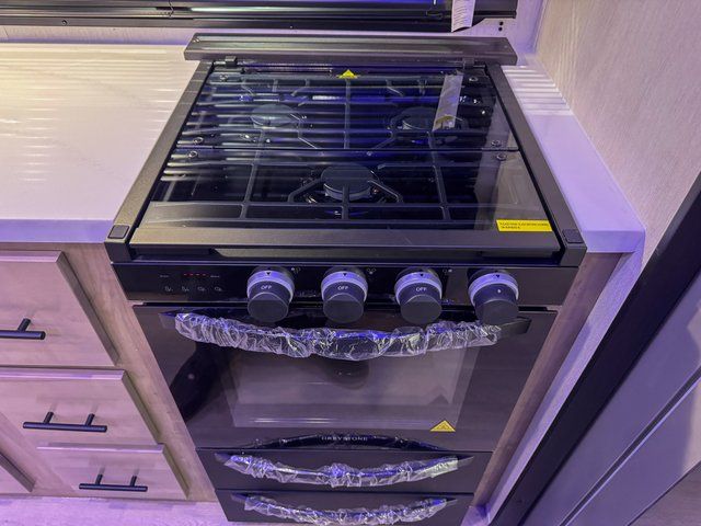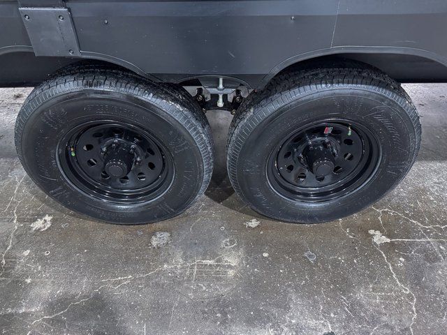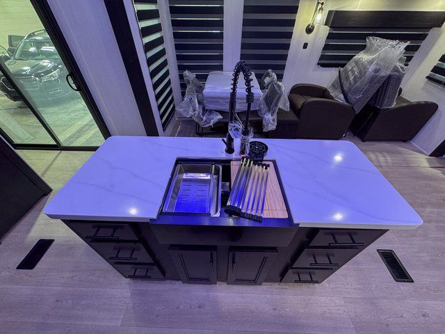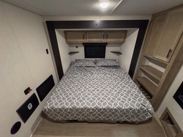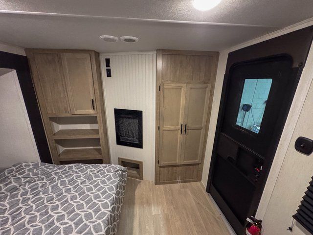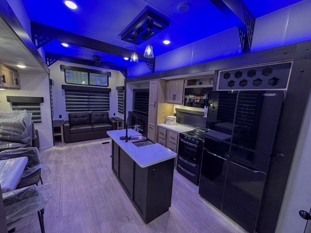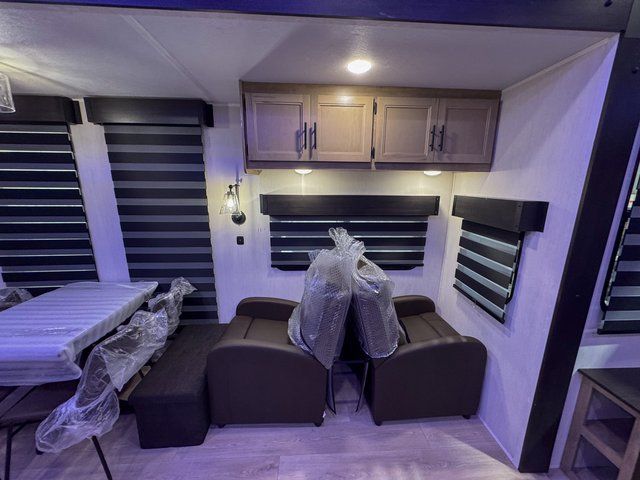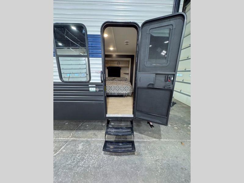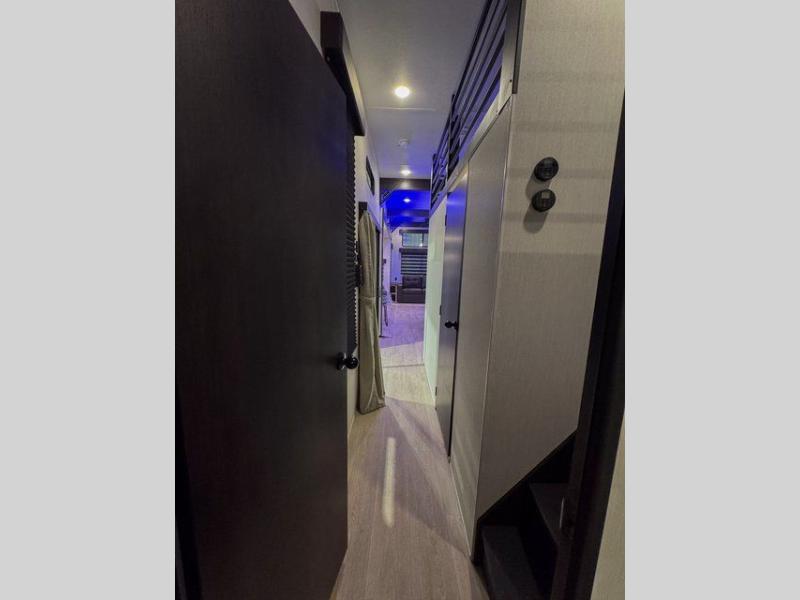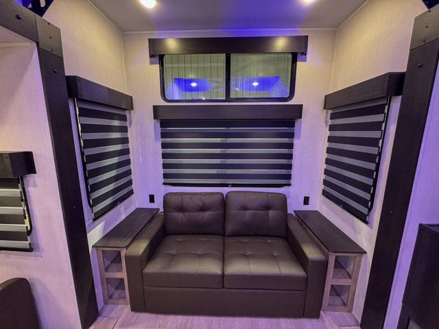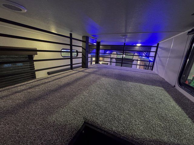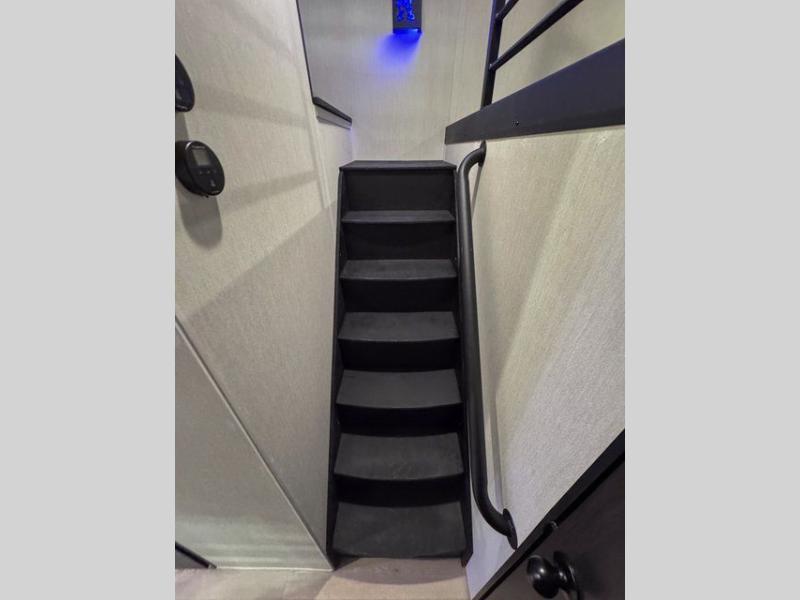 This destination trailer is an excellent and accommodating trailer that will make you feel right at home as soon as you enter through one of the two entry doors. The front private bedroom has a king bed slide and lots of storage with a wardrobe and a linen closet. There is also an entertainment center where you can add your own TV and the bedroom even has a second exterior entry door so that you can come and go as you please. Above the bedroom is where the huge loft is located. When you take the stairs up to the loft, you'll find two 36" x 74" bunk mats, cabinets, and a large open area with a railing. The main living area has a free-standing dinette with chairs, theater seats, and a hide-a-bed sofa, so you will have plenty of seating as you watch the main entertainment center.