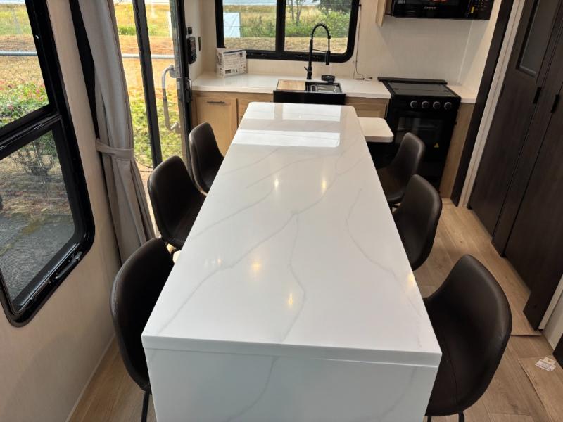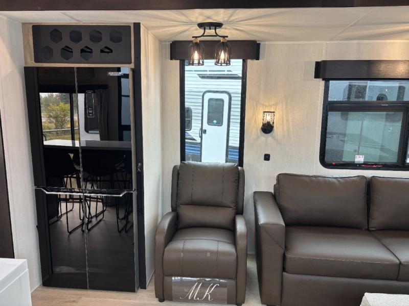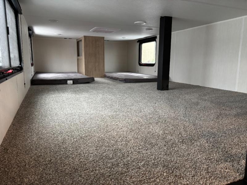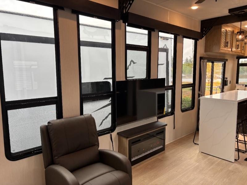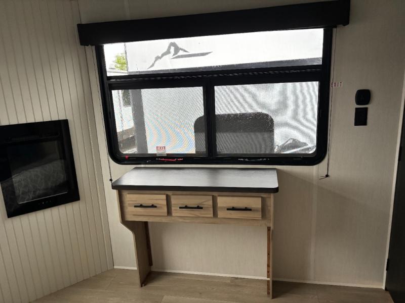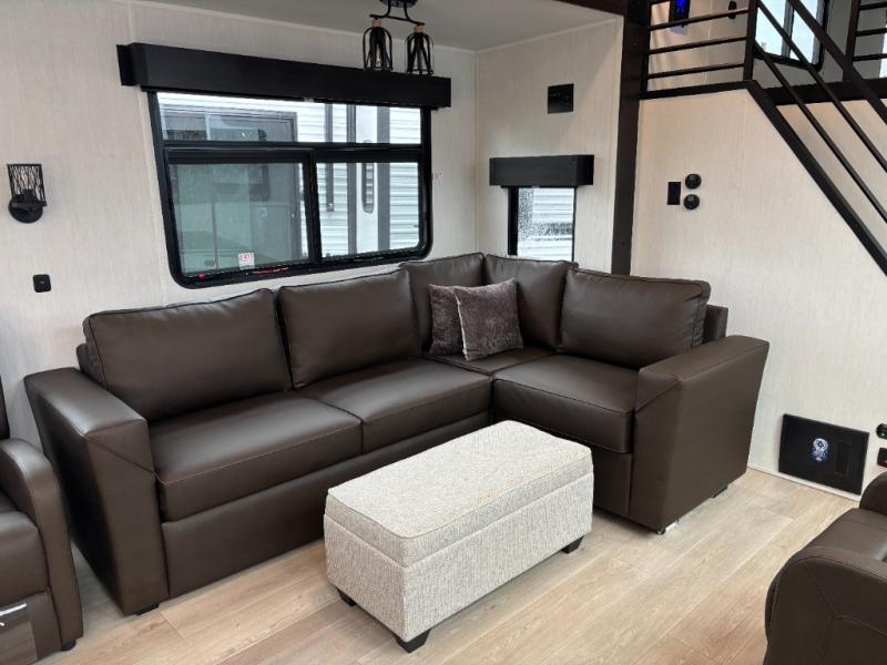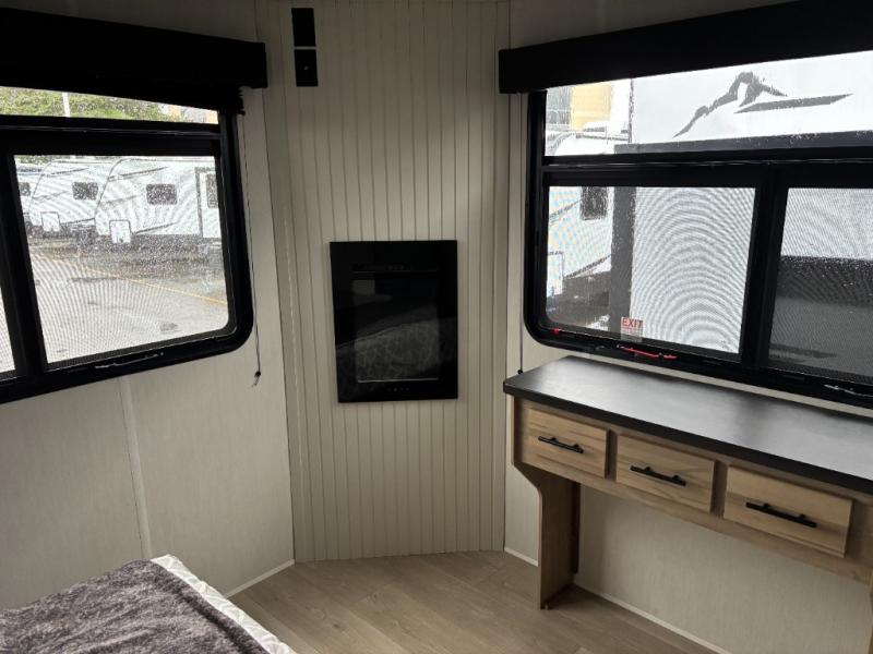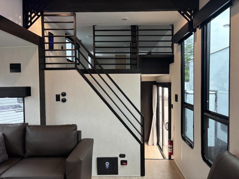 Time spent in this destination trailer will be time well spent! You will appreciate dual entry doors for maximum convenience, plus a spacious full bath that is close by the front private bedroom! Your crew can relax in the middle living area on the L-shaped hide-a-bed sofa or on the two lounge chairs. The rear kitchen will be any chef's dream with its island with six stools and all the appliances to create meals each day. This model also features triple slides so you can enjoy more space to relax. The front bedroom includes a king bed slide out, a desk with drawers, and a bedroom fireplace. And above this room is where you'll find the spacious loft with two bunk mats, storage, and space for the little ones to play!