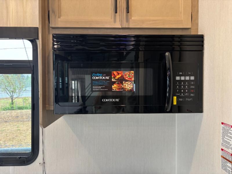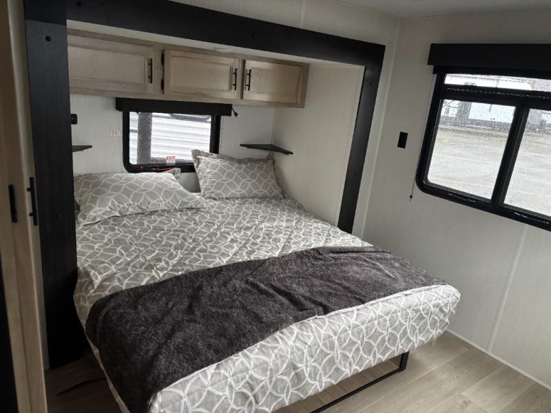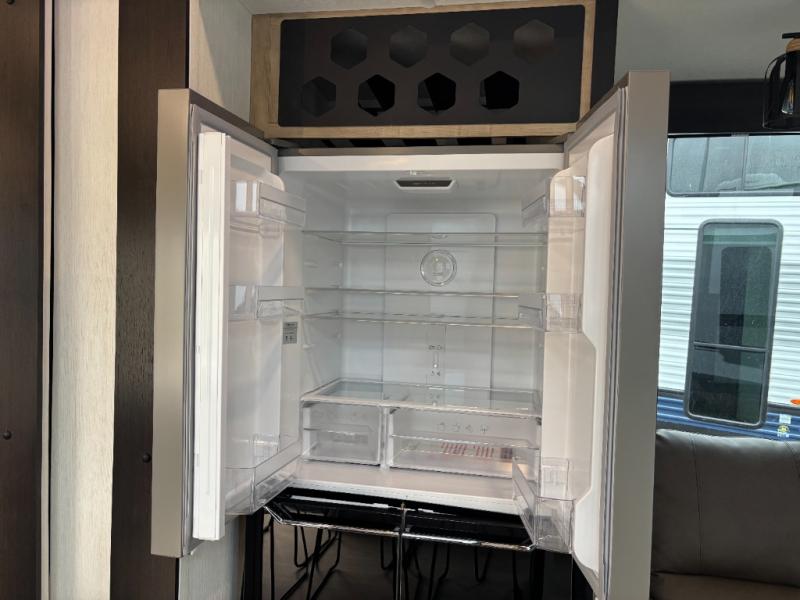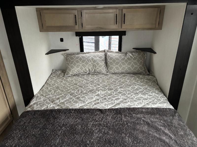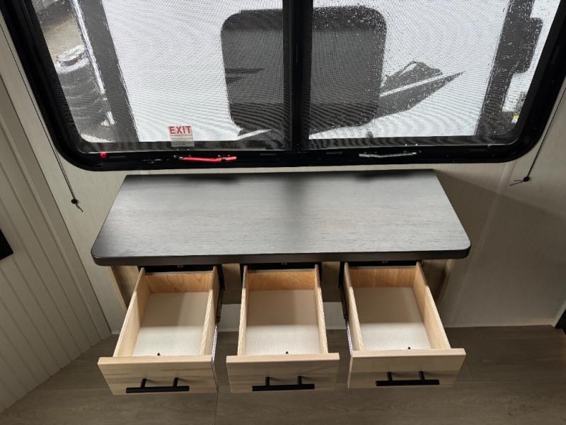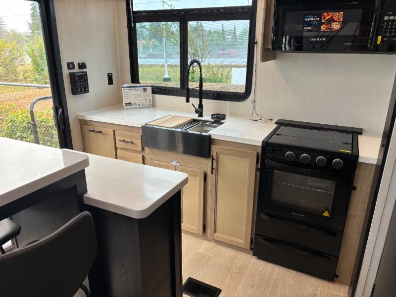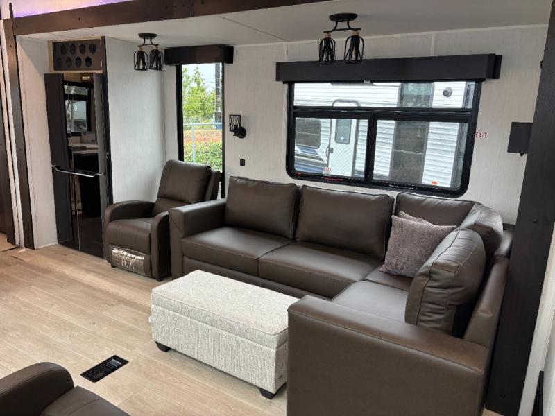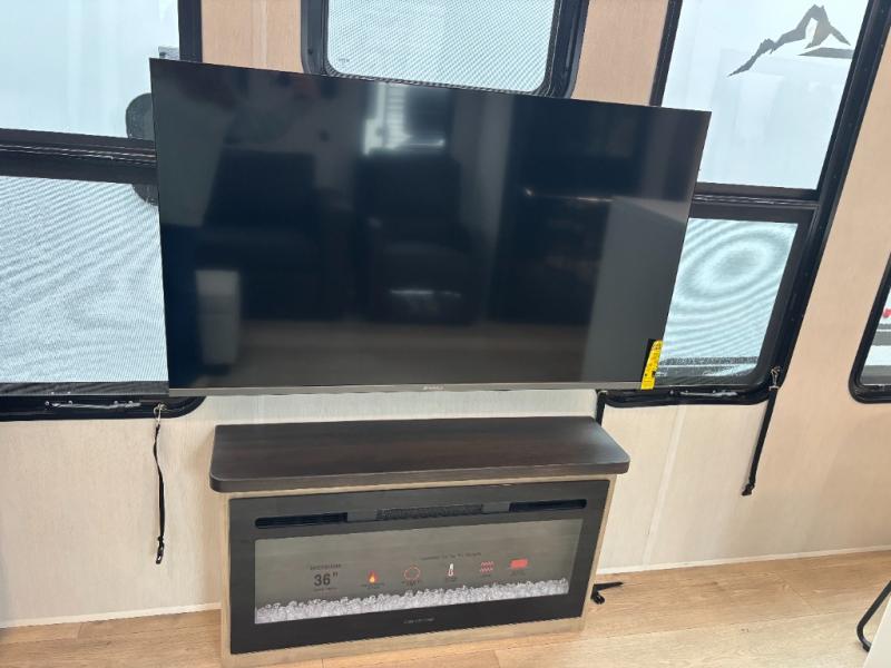 Time spent in this destination trailer will be time well spent! You will appreciate dual entry doors for maximum convenience, plus a spacious full bath that is close by the front private bedroom! Your crew can relax in the middle living area on the L-shaped hide-a-bed sofa or on the two lounge chairs. The rear kitchen will be any chef's dream with its island with six stools and all the appliances to create meals each day. This model also features triple slides so you can enjoy more space to relax. The front bedroom includes a king bed slide out, a desk with drawers, and a bedroom fireplace. And above this room is where you'll find the spacious loft with two bunk mats, storage, and space for the little ones to play!