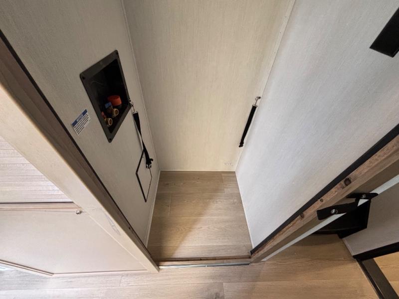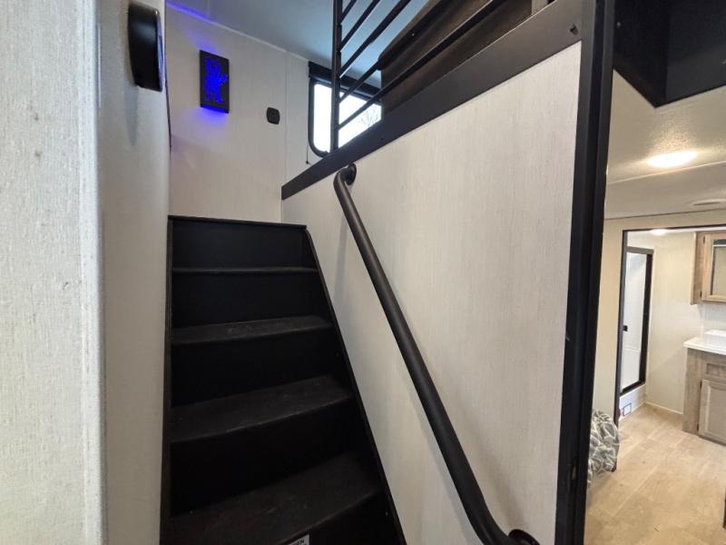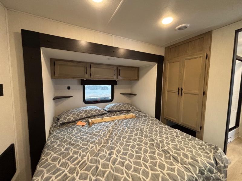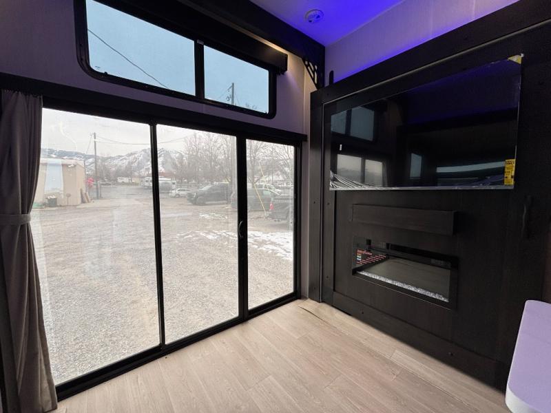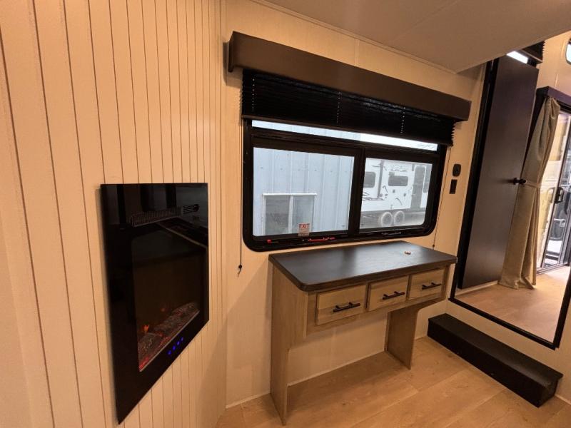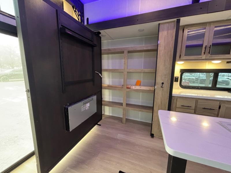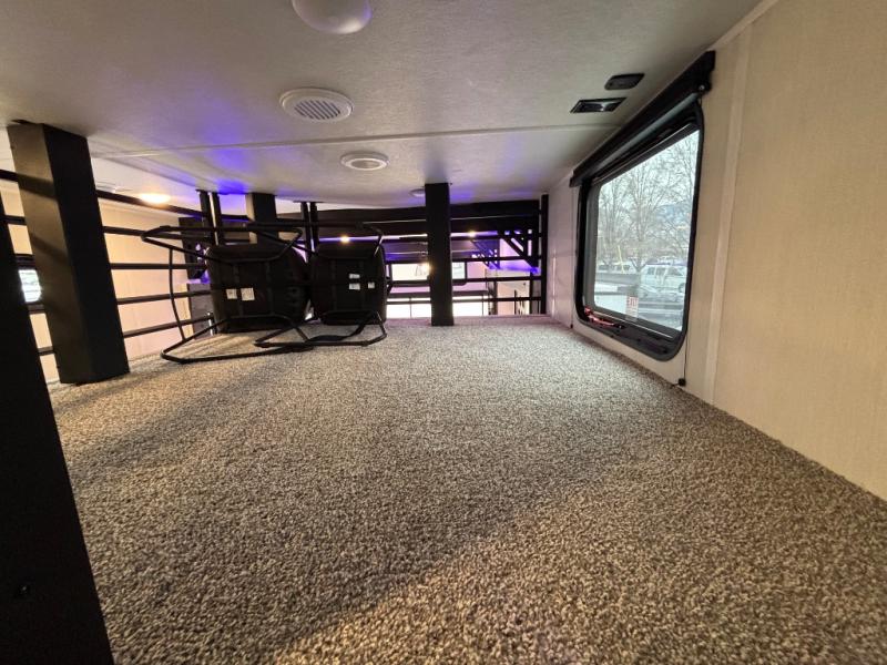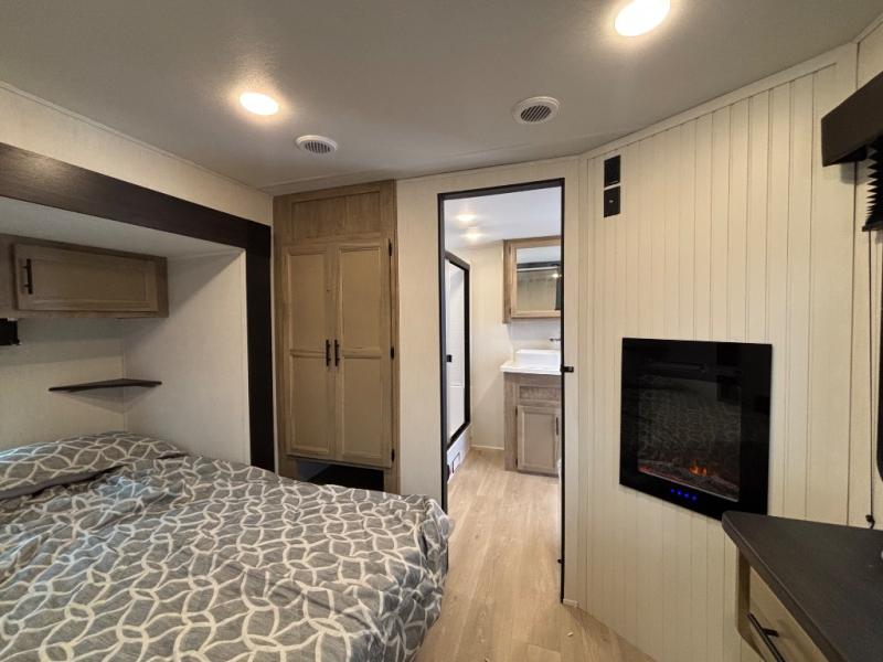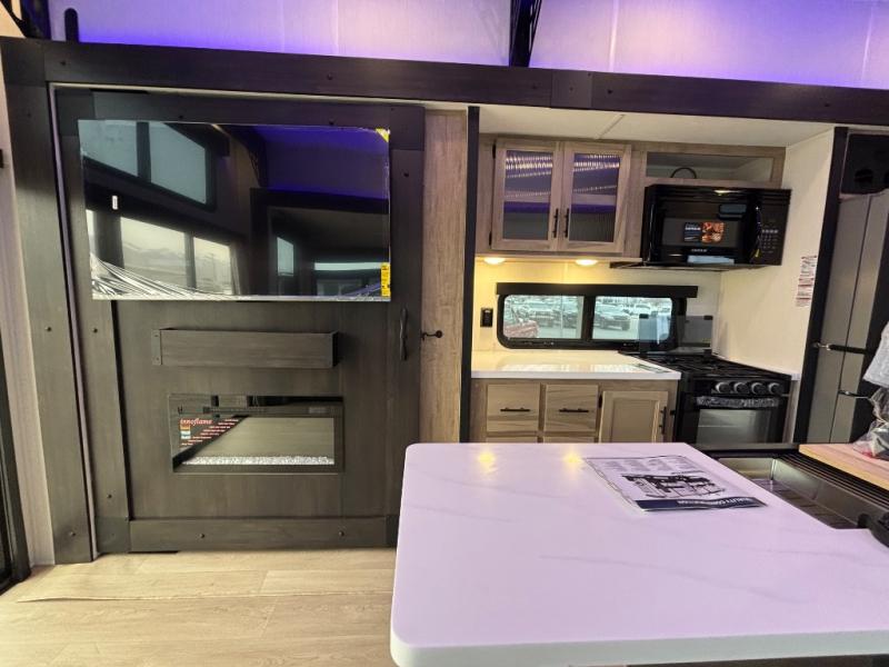 Choosing this destination trailer as your next RV won't be a hard decision! You can enter in through the front bath that includes dual bath sinks, a shower with a seat, and a medicine cabinet for your necessities. The master bedroom is connected to this bath for added convenience, and you're sure to enjoy the bedroom fireplace and king bed slide out. Just outside this room are the stairs that lead to the loft where you'll find two queen-size beds on one side and an open area where the kids can play or to use as storage. A second full bath is found next the stairs on the lower level, and there is a wardrobe with washer/dryer prep if you want to add these appliances. Everyone will love to join together and visit in the combined kitchen and living room. Here, you'll find a free-standing dinette, an L-shaped sofa, a kitchen island with two chairs, plus an entertainment center with a fireplace! The hidden pantry behind the fireplace will let you keep food stocked, and the rear patio doors will let natural light in!