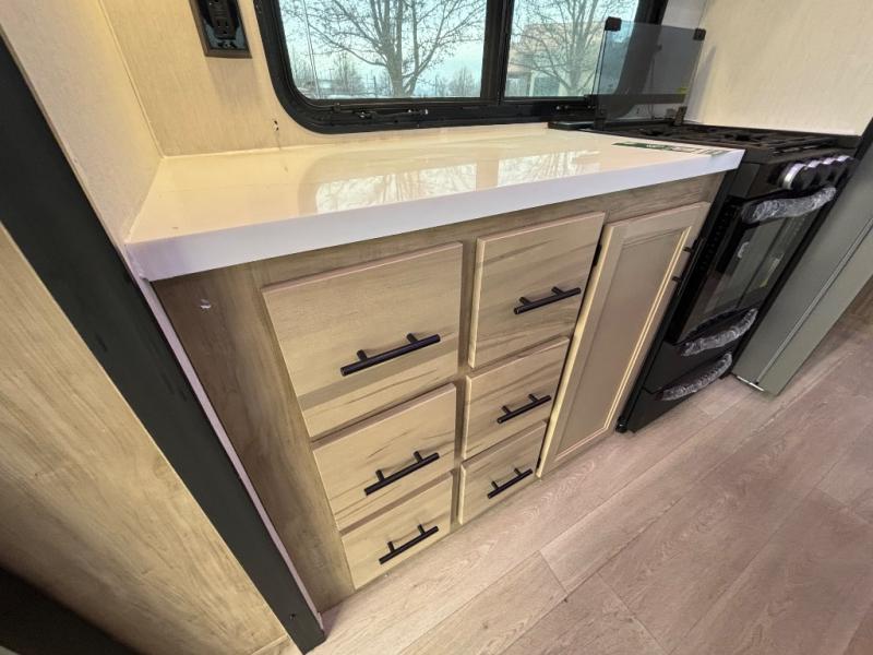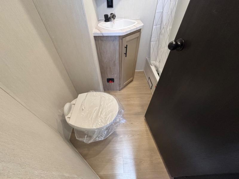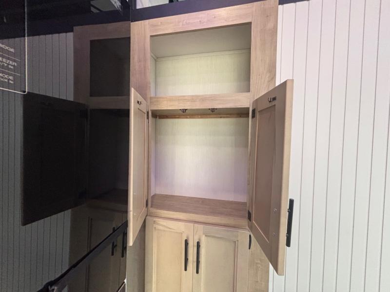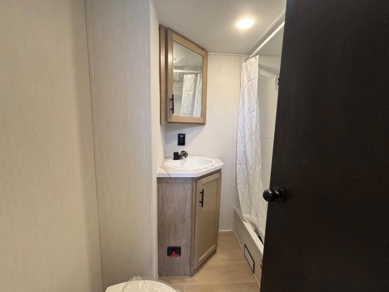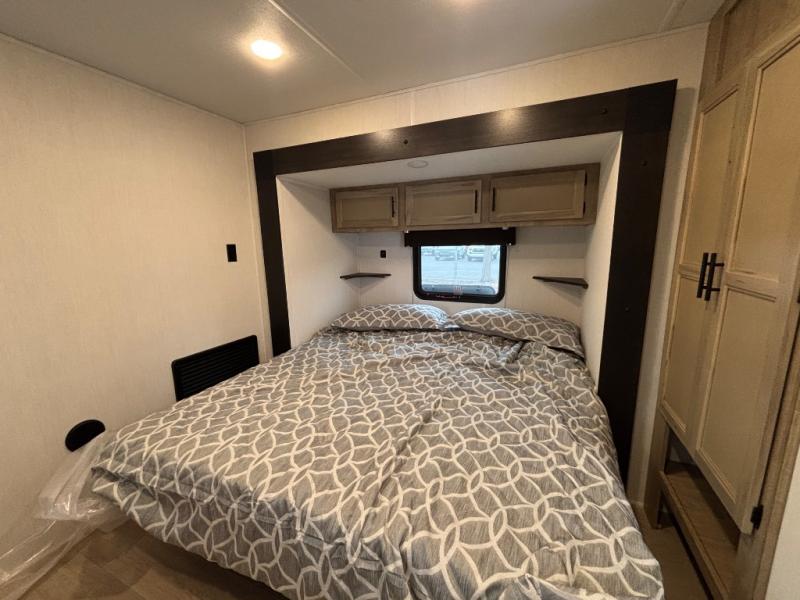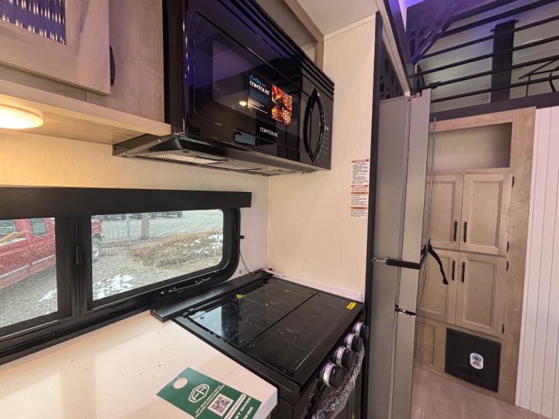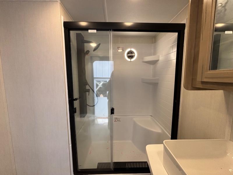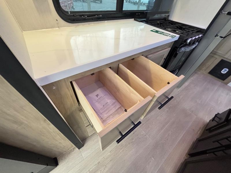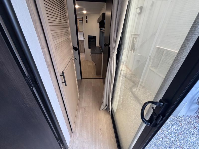Choosing this destination trailer as your next RV won't be a hard decision! You can enter in through the front bath that includes dual bath sinks, a shower with a seat, and a medicine cabinet for your necessities. The master bedroom is connected to this bath for added convenience, and you're sure to enjoy the bedroom fireplace and king bed slide out. Just outside this room are the stairs that lead to the loft where you'll find two queen-size beds on one side and an open area where the kids can play or to use as storage. A second full bath is found next the stairs on the lower level, and there is a wardrobe with washer/dryer prep if you want to add these appliances. Everyone will love to join together and visit in the combined kitchen and living room. Here, you'll find a free-standing dinette, an L-shaped sofa, a kitchen island with two chairs, plus an entertainment center with a fireplace! The hidden pantry behind the fireplace will let you keep food stocked, and the rear patio doors will let natural light in!