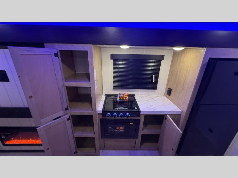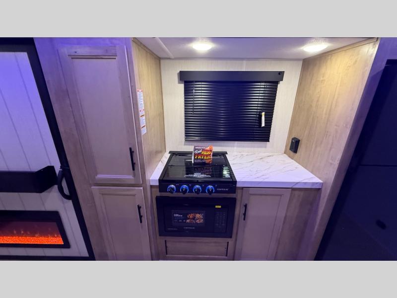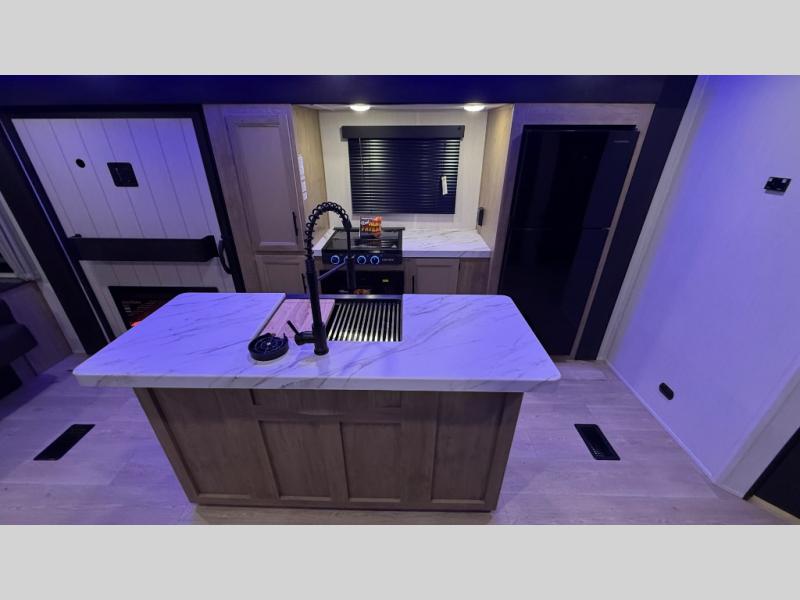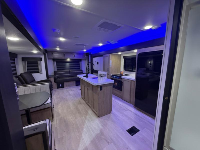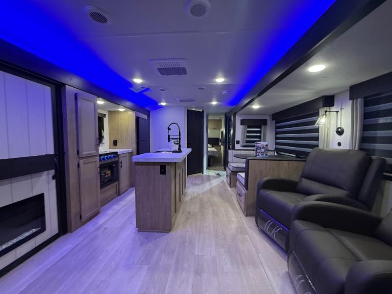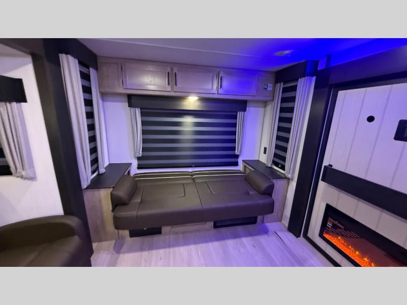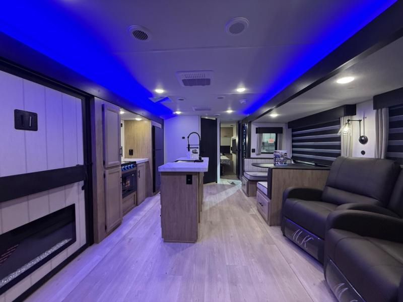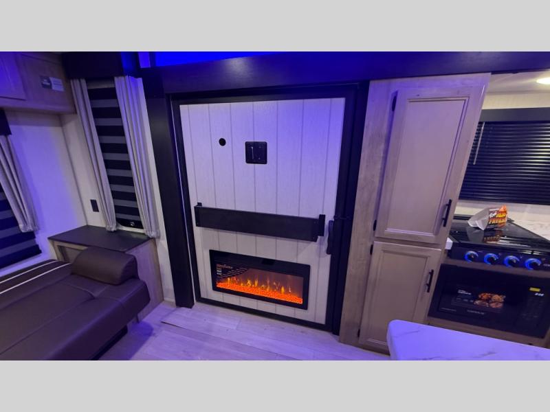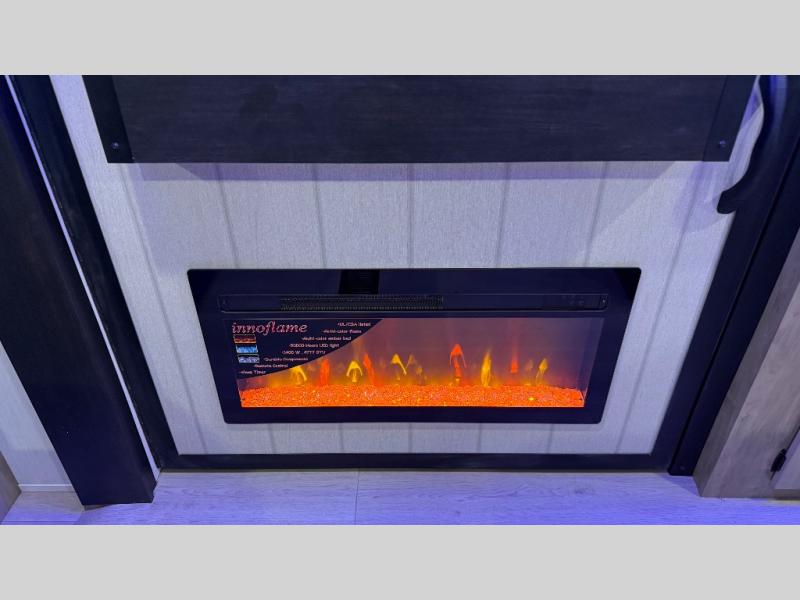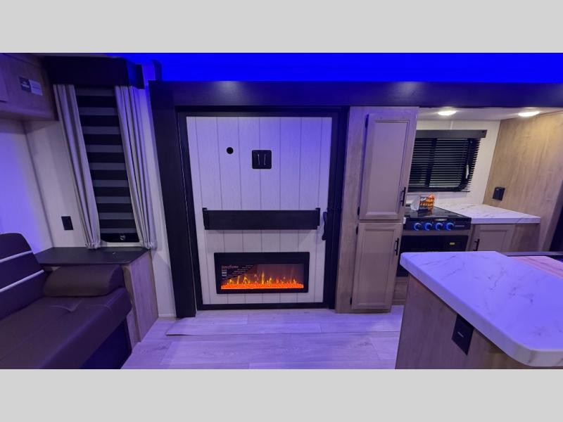 You'll love every minute spent in this double slide out travel trailer. You can relax on the rear sofa or dual lounge chairs, play a game at the booth dinette, and enjoy the glow of the fireplace. The chef of your group will appreciate the kitchen island, air fryer, plus refrigerator and pantry for food storage. A dual entry bath will create a front master bedroom, complete with an RV king bed and a bedside wardrobe to keep your space tidy.