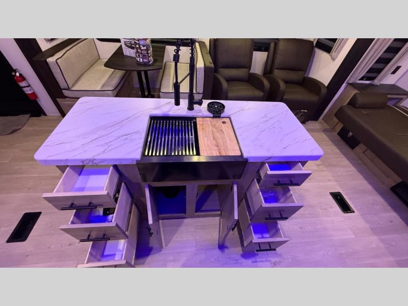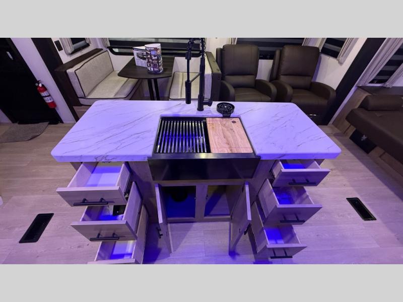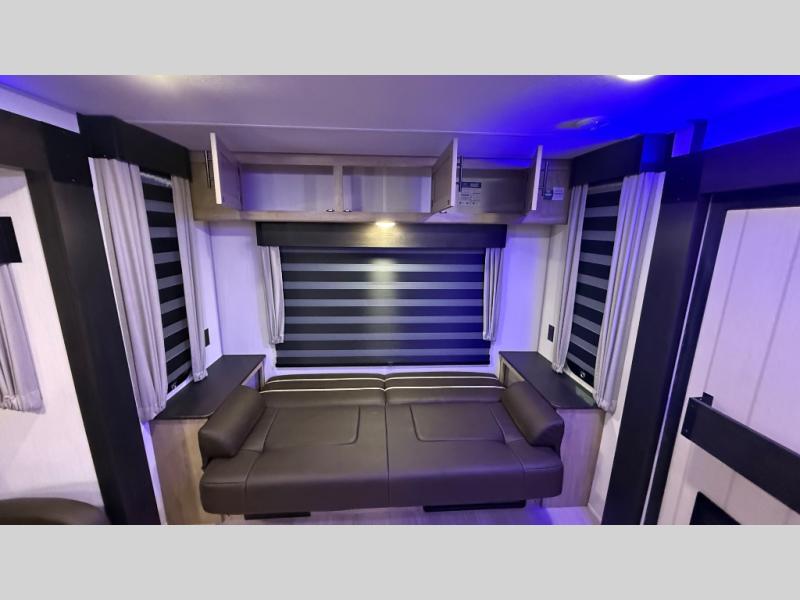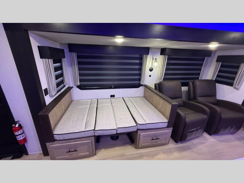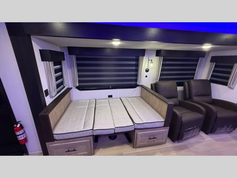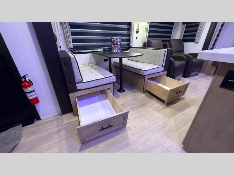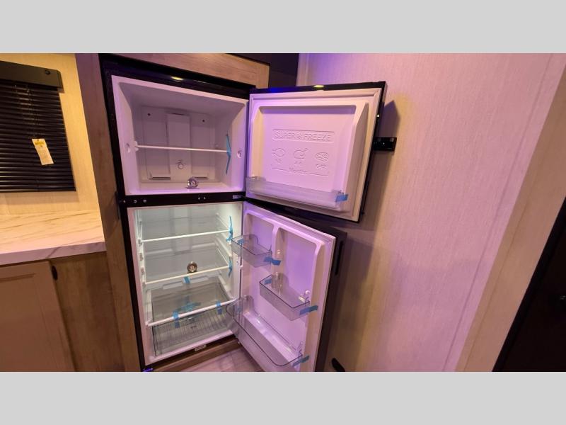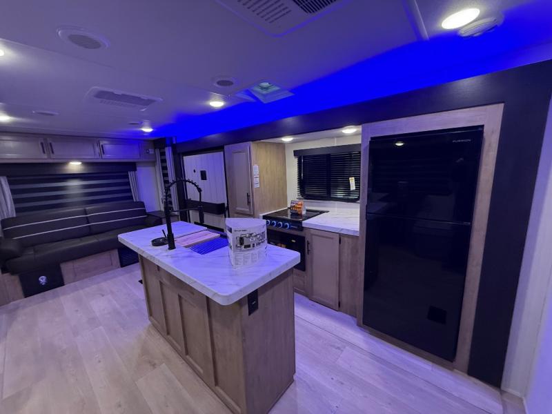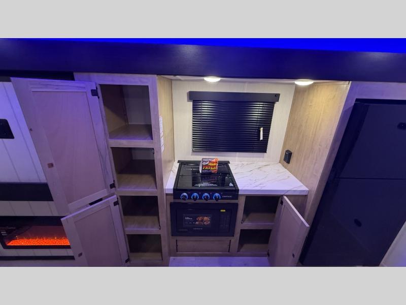 You'll love every minute spent in this double slide out travel trailer. You can relax on the rear sofa or dual lounge chairs, play a game at the booth dinette, and enjoy the glow of the fireplace. The chef of your group will appreciate the kitchen island, air fryer, plus refrigerator and pantry for food storage. A dual entry bath will create a front master bedroom, complete with an RV king bed and a bedside wardrobe to keep your space tidy.