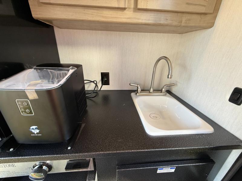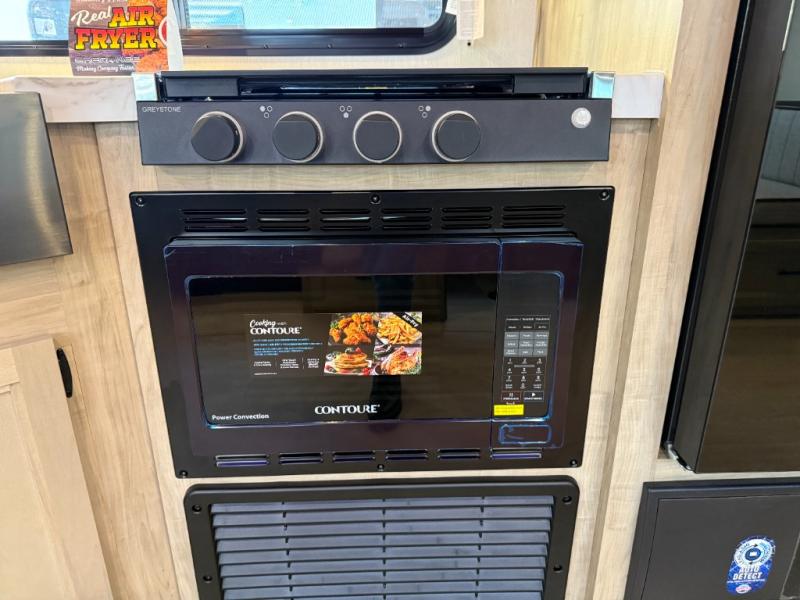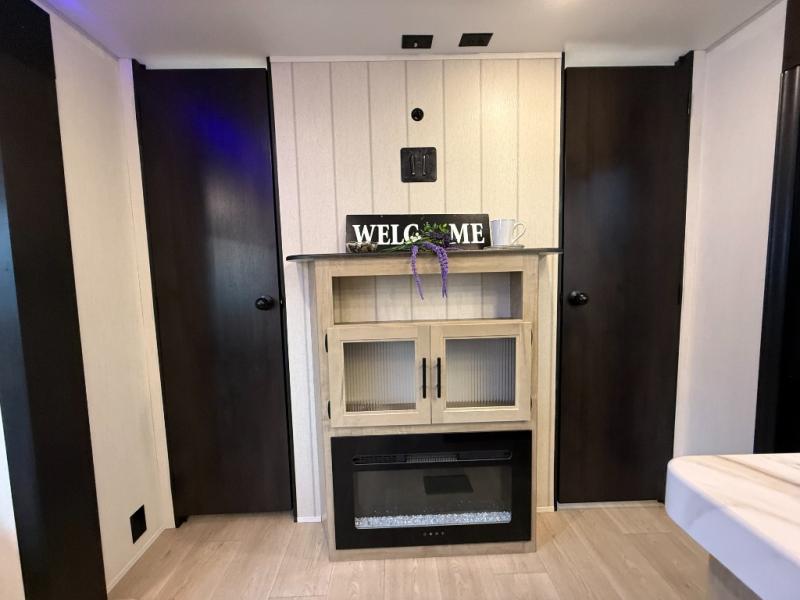 Double slides create spacious living areas in this travel trailer! The chef can prepare their best meals either indoors with the three burner cooktop and air fryer microwave, or at the outdoor kitchen. The kids or guests can sleep in the rear private bunkhouse with a bunk, double bunk, and flip-up bunk above a sofa. The front private bedroom has a walk around RV king bed for a great night's rest plus a wardrobe to keep your things organized. In the morning, everyone can meet in the combined kitchen and living room around the U-shaped dinette and sofa, and the fireplace here will make it feel more like home.