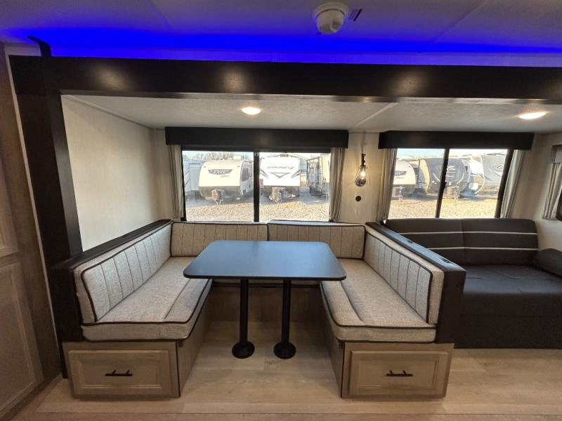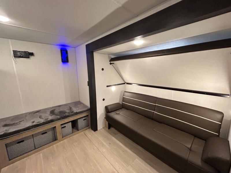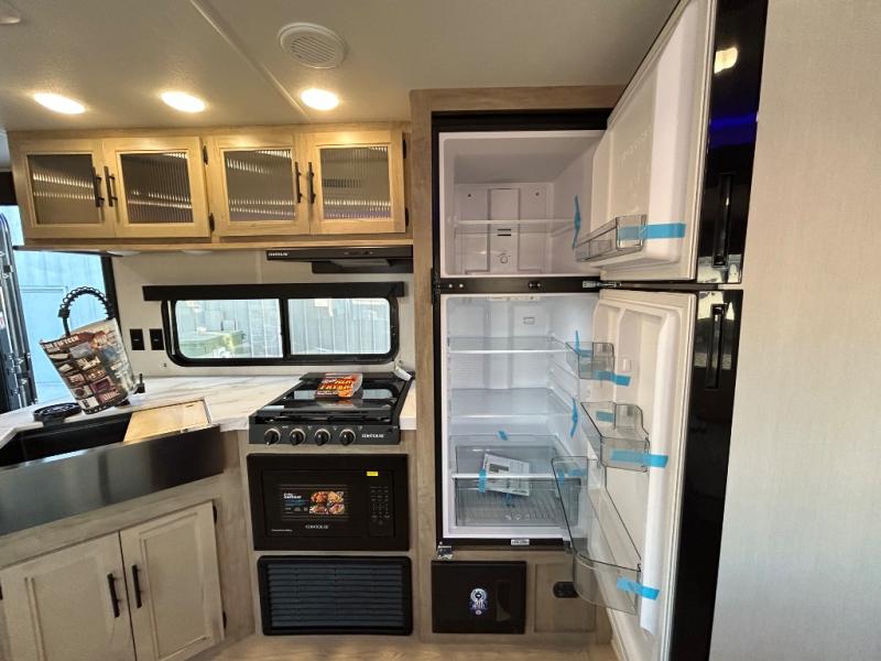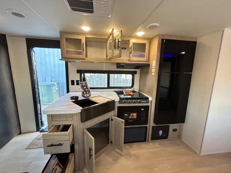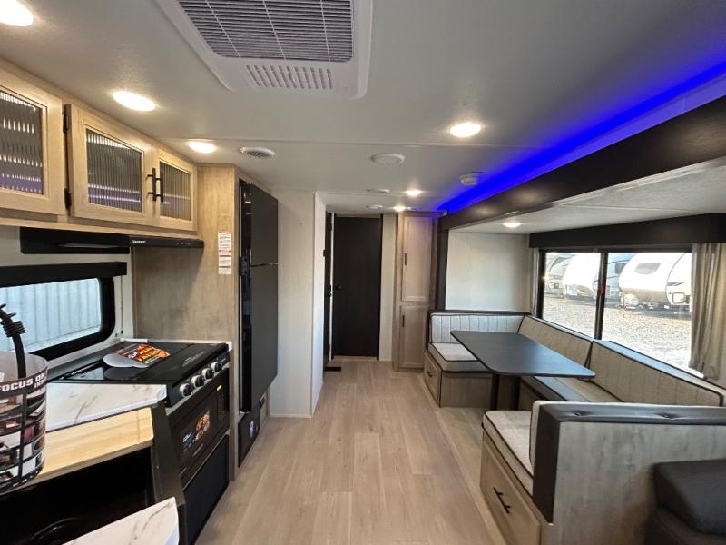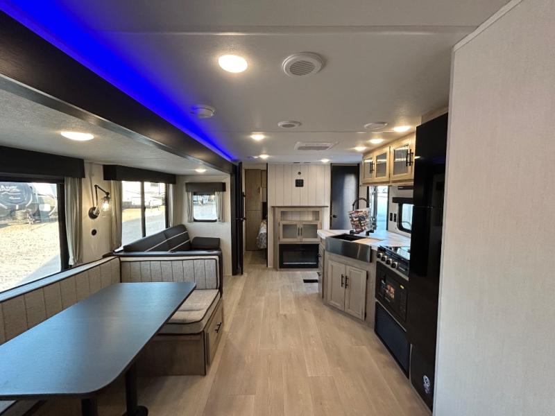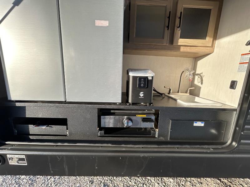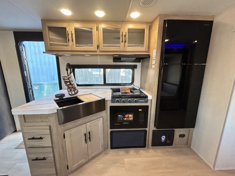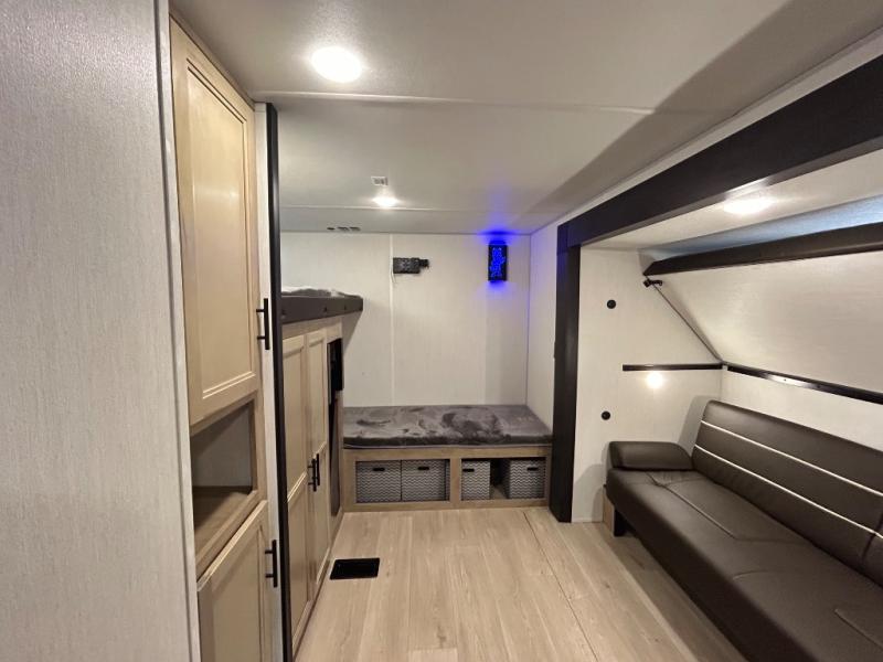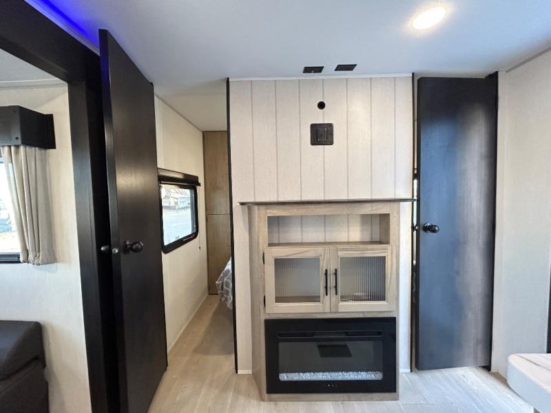 Double slides create spacious living areas in this travel trailer! The chef can prepare their best meals either indoors with the three burner cooktop and air fryer microwave, or at the outdoor kitchen. The kids or guests can sleep in the rear private bunkhouse with a bunk, double bunk, and flip-up bunk above a sofa. The front private bedroom has a walk around RV king bed for a great night's rest plus a wardrobe to keep your things organized. In the morning, everyone can meet in the combined kitchen and living room around the U-shaped dinette and sofa, and the fireplace here will make it feel more like home.